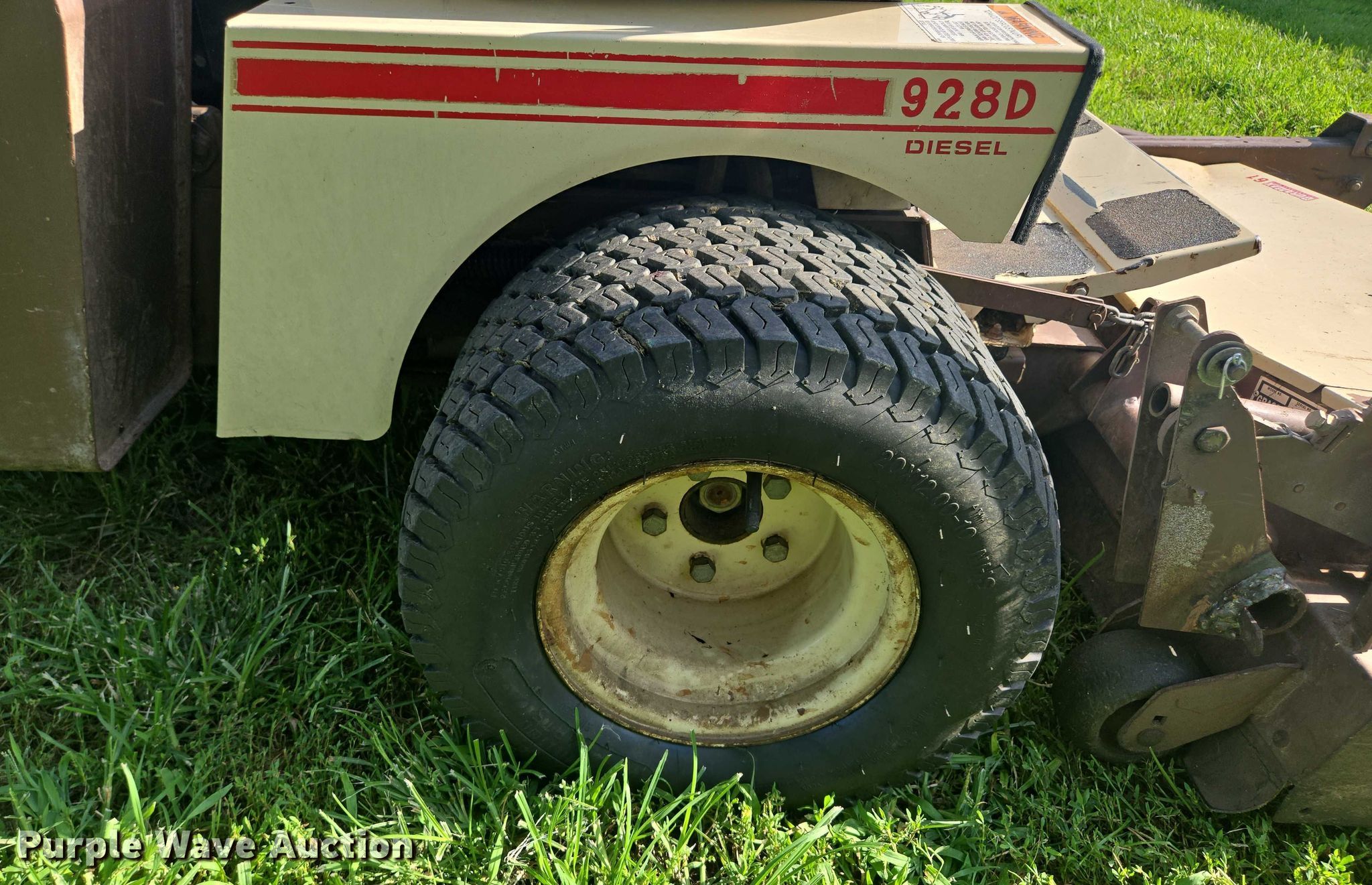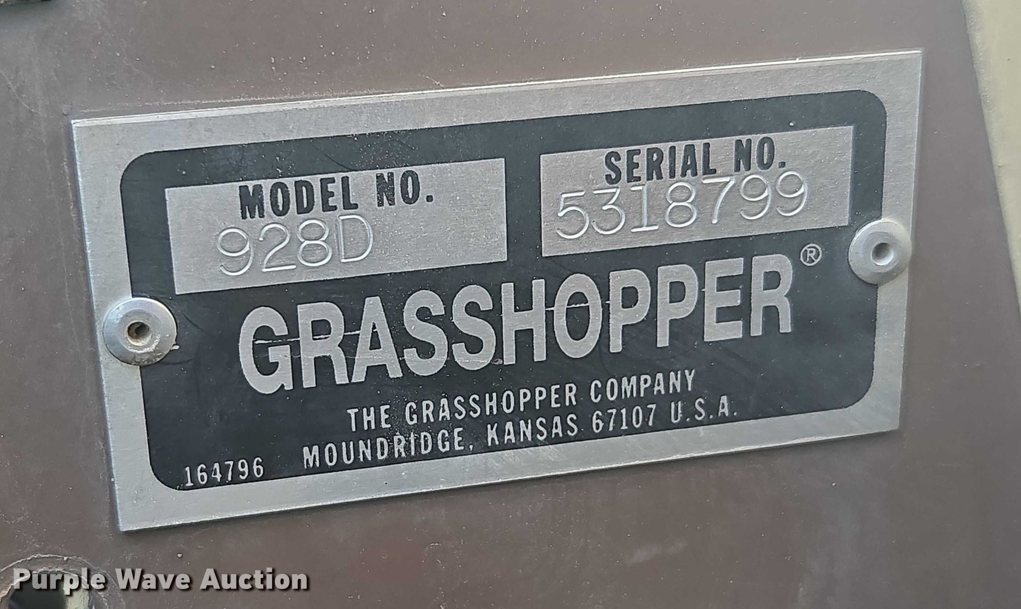 2003 Grasshopper 928D ZTR lawn mower. Hours: 2,494 on meter, Cutting width: 61", Serial: 5318799. Engine Kubota D1105-E, Cylinders: 3, Fuel type: Diesel, kW: 19.7. Transmission Hydrostatic. Features Hydraulic front deck lift. Tires Front: 20x12.00-10, Rear: 13x6.50-6. Platte City, MO 64079