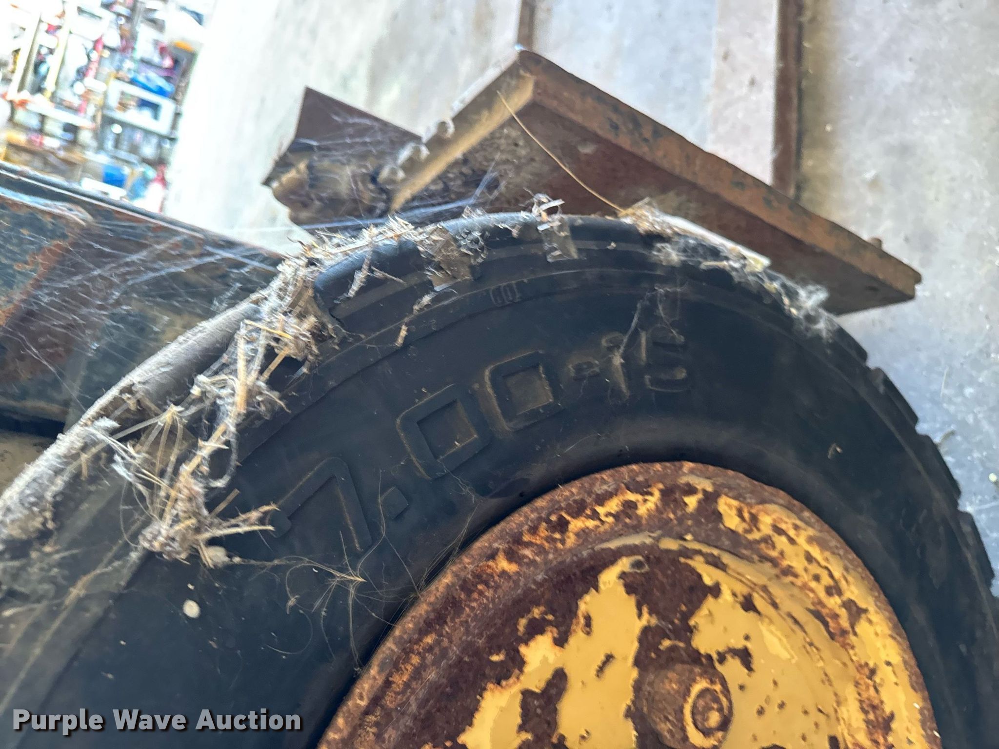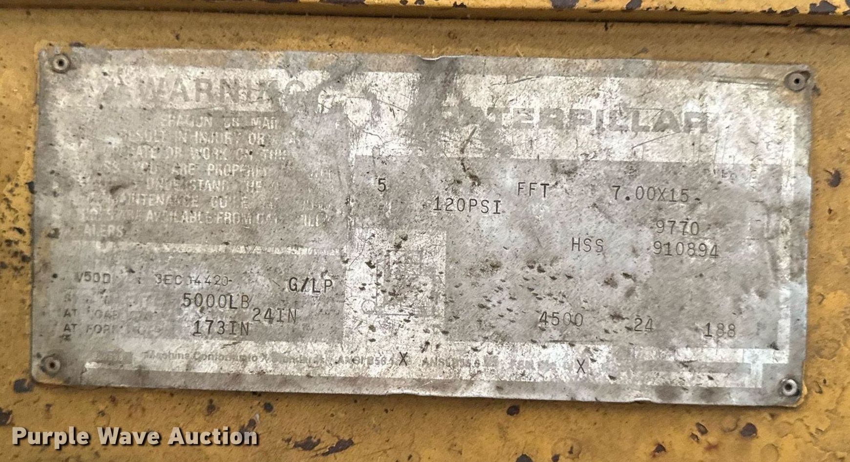 Caterpillar V50D forklift. Hours: 12,260 on meter, Serial: 3EC04420. Engine Cylinders: 4, Fuel type: Dual fuel LP bottle: Not included. Transmission Powershift, 1F - 1R. Operators station OROPS. Features Maximum lift capacity: 5,000 lbs, Collapsed mast height: 96", Mast stages: 3, Mast tilt, Fork length: 48". Tires Front: 7.00-15, Rear: 6.5-10. Notes Battery missing, Non-operational unit. Cowan Equipment. Centerville, IA 52544