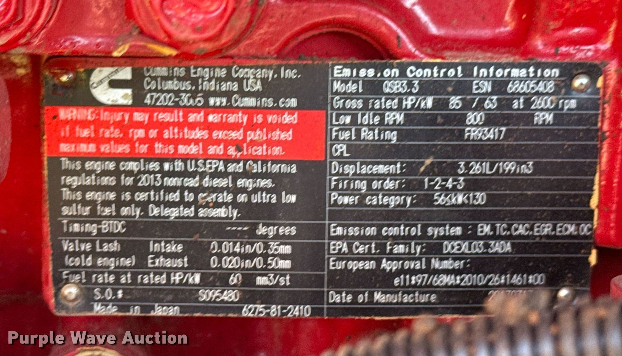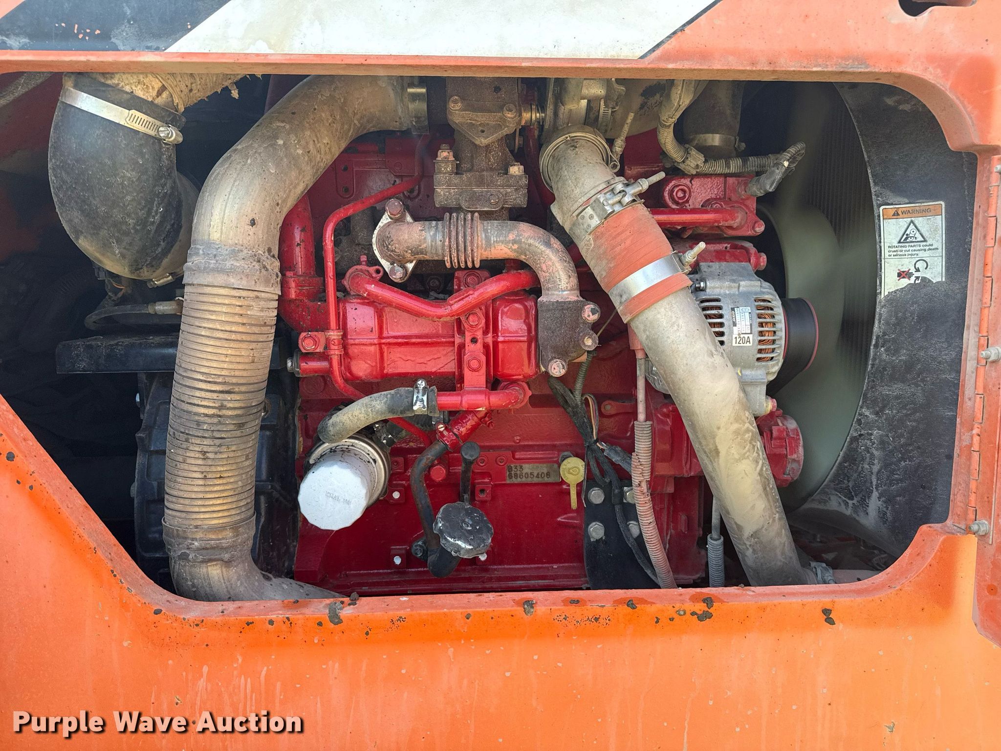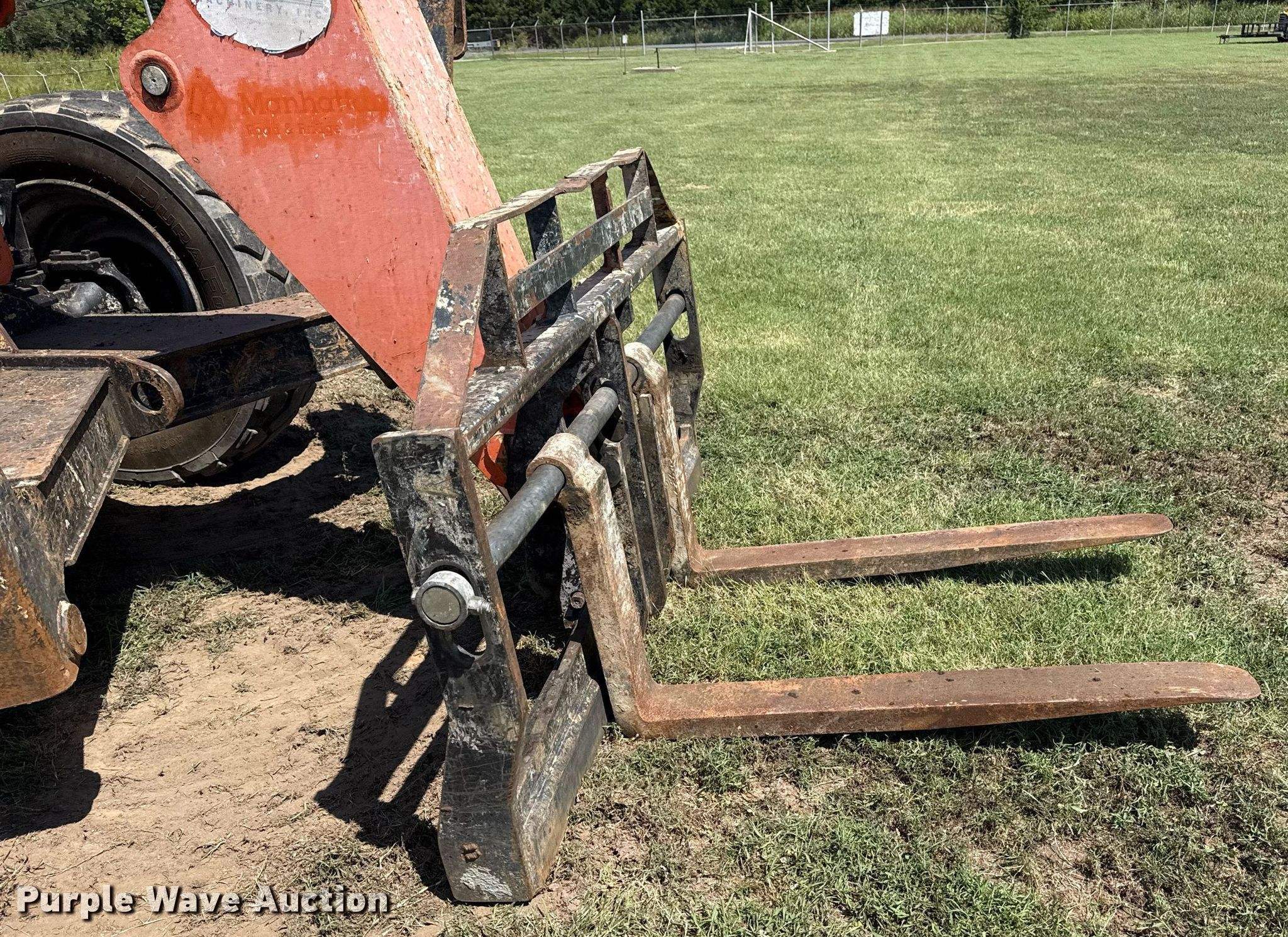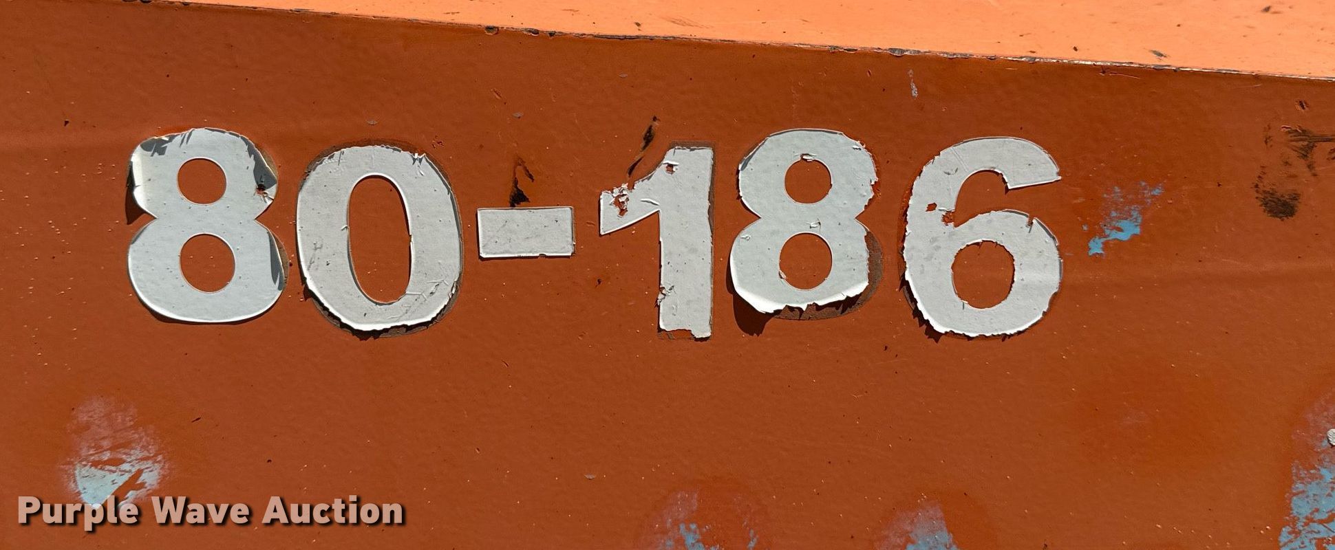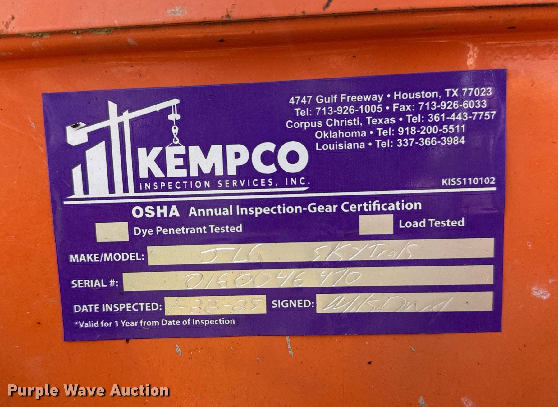 2012 Skytrak 10042 telehandler. Hours: 6,664 on meter, Serial: 0160046470, Unit #: 80-186. Engine Cummins QSB3.3, Serial: 68605408, Displacement: 3.261L, Cylinders: 4, Fuel type: Diesel, HP: 85, kW: 63. Transmission Powershift, 4F - 4R, Four wheel drive. Operators station Canopy, Steering: Crab, Four wheel. Features Maximum lift capacity: 10,000 lbs, Maximum lift height: 42', Boom stages: 3, Fork length: 47", Tilt carriage, Hydraulic outriggers, Hydraulic leveling. Tires Front: 400/75-28. Manhattan Road & Bridge. Muskogee, OK 74403