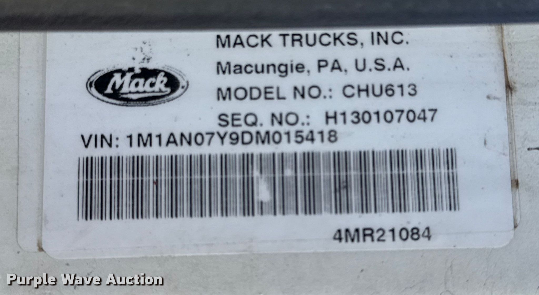 2013 Mack CHU613 fuel / lube truck. Miles: 379,381 on odometer, VIN: 1M1AN07Y9DM015418, Unit #: 10-420. Engine Mack MP8, Serial: 1019321, Displacement: 12.8L, Cylinders: 6, Fuel type: Diesel. Transmission Automatic. Chassis Axles: Tandem, Differential lock: Inter-axle, Suspension: Air Dump valves, Brakes: Air, PTO, GVWR: 53,220 lbs. Interior AC, Heat, Power windows, Power locks, Cruise control. Features Bed Length: 19' 3", Width: 100", Compartments: 1, Hose reels: 10, Nozzles, Metered pumps: 1 Make: GPI, Oil/lube reservoirs Used oil, Van Air Reliant RC40 air compressor. Tires Size: 11R24.5. Notes Windshield chipped or cracked. Oklahoma title. Title distribution may be delayed up to 30 days from verification of funds. Manhattan Road & Bridge. Muskogee, OK 74403