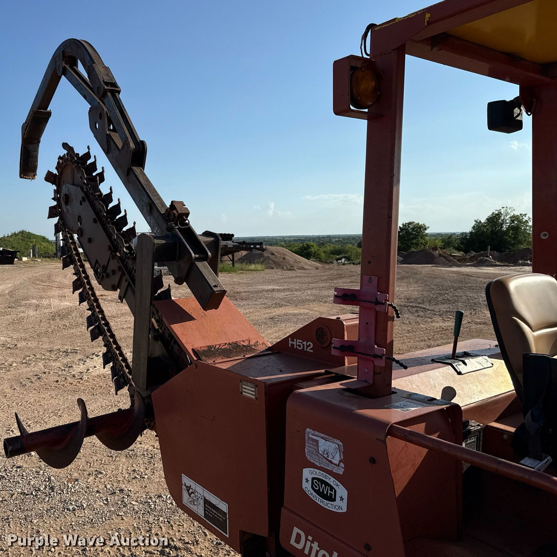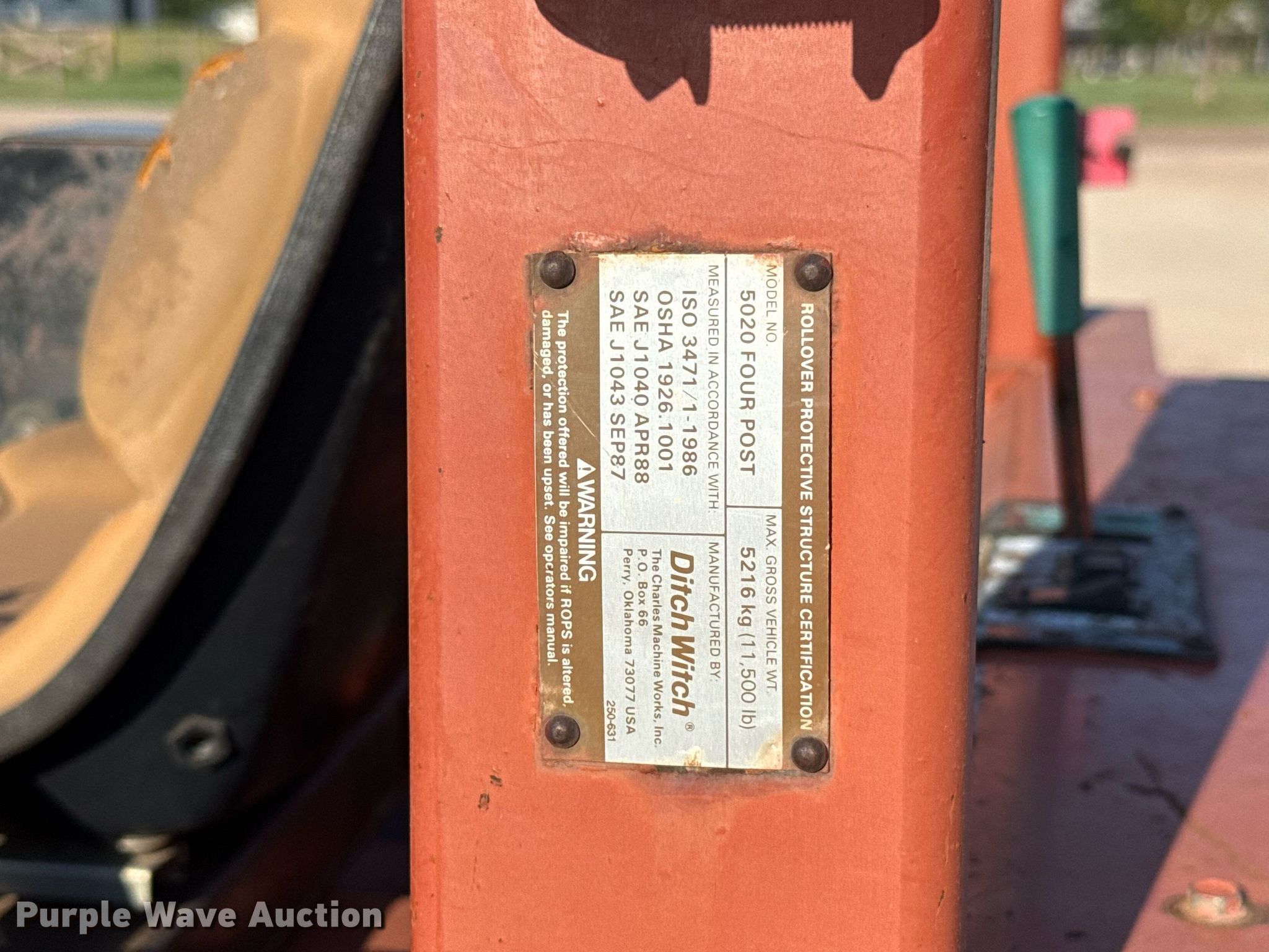 1991 Ditch Witch 5020 trencher. Hours: 1,615 on meter, Serial: 5H0430. Engine Deutz F3L912, Serial: 7894413, Cylinders: 3, Fuel type: Diesel. Transmission Hydrostatic, Two speed travel. Chassis Four wheel drive, Four wheel steer. Operators station OROPS, Canopy. Features Model: Ditch Witch, Serial: 2H1164, Trencher Model: H512, Serial: 2H1164, Estimated dig depth: 78", Cutting width: 6", Side shift, Teeth: Dirt, Manual crumber, Backfill blade Width: 72", Suitcase weights: 15. Tires Size: 31X15 5-15. Notes Non-operational fuel gauge, Non-operational battery gauge. SWH Construction. Norman, OK 73072
