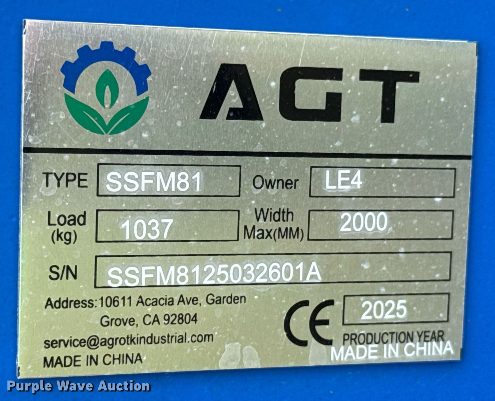 Purple Wave is selling a used Skid Steer Attach. in Kansas. This item is a 2025 AGT SSFM81 skid steer mulcher with the following: Serial: SSFM8125032601A, Width: 60", Overall height: 66"