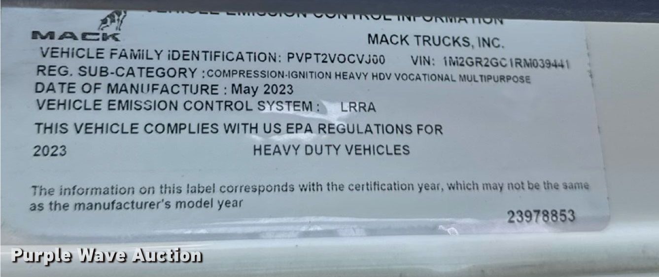 Purple Wave is selling a used Construction Dump Truck in Missouri. This item is a 2024 Mack Granite GR64F dump truck with the following: Miles: 54,992 on odometer, Hours: 1,811 on meter, Miles or hours may vary, unit still in use, VIN: 1M2GR2GC1RM039441