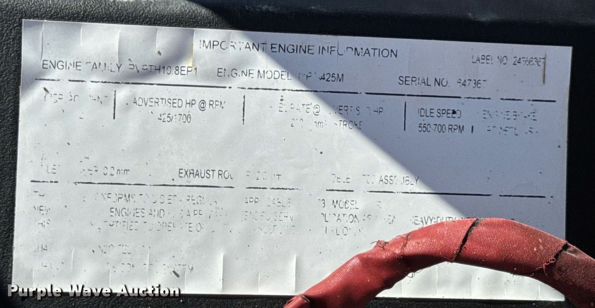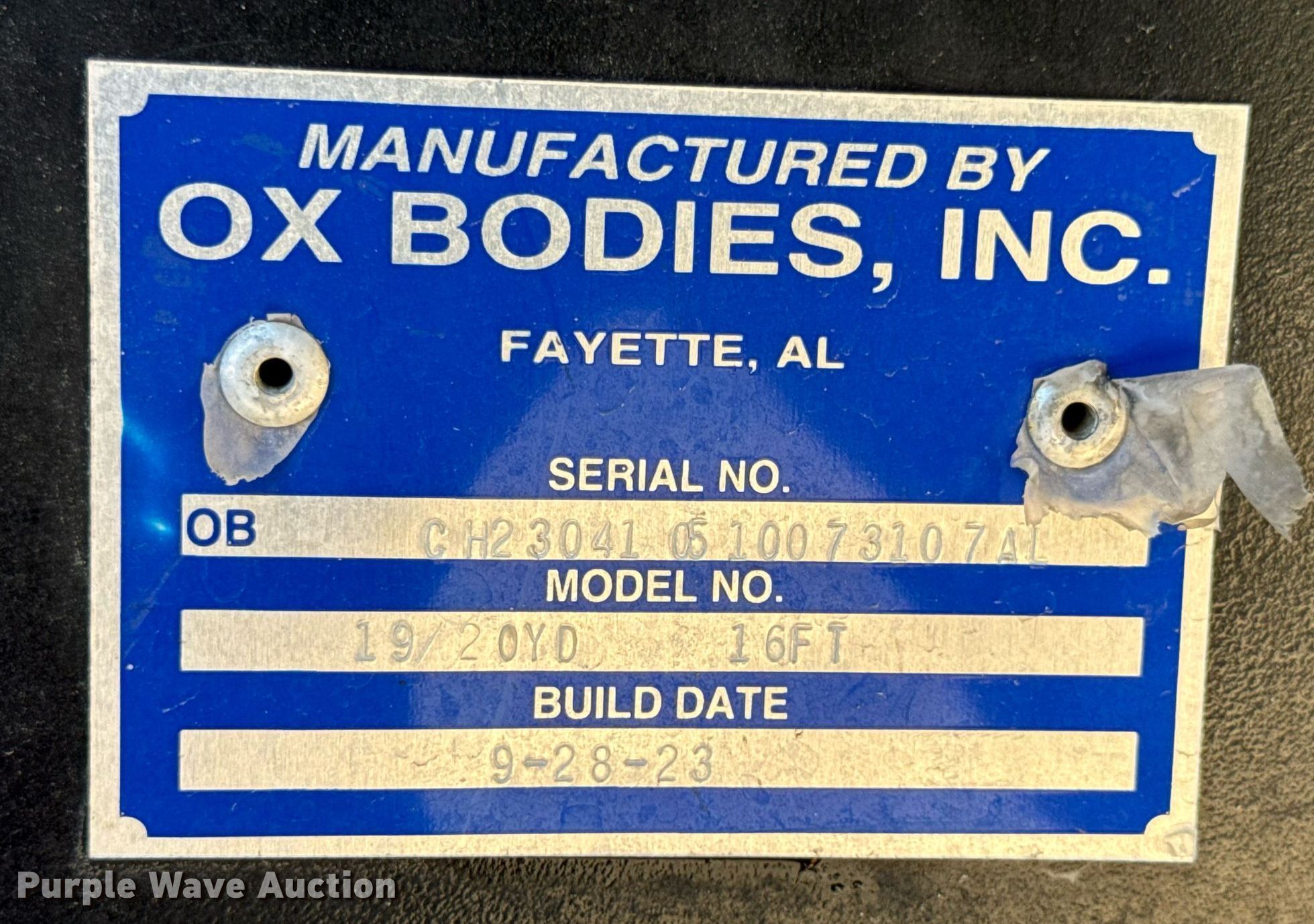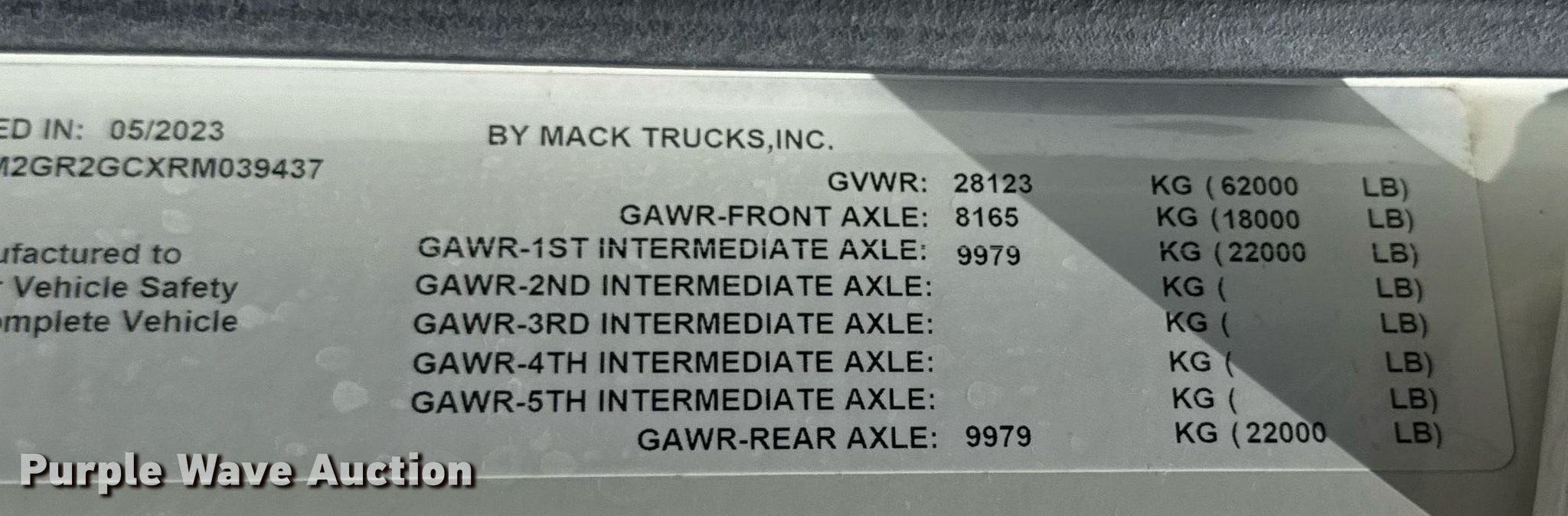 2024 Mack Granite GR64F dump truck. Miles: 41,805 on odometer, Hours: 1,402 on meter, Miles or hours may vary, unit still in use, VIN: 1M2GR2GCXRM039437. Engine Mack MP7-425M, Serial: 647367, Displacement: 10.8L, Cylinders: 6, Fuel type: Diesel, HP: 425, Engine brake. Transmission Automated manual. Chassis Axles: Tandem, Differential lock: Inter-axle, Suspension: Camelback, Brakes: Air, PTO, GVWR: 62,000 lbs FAWR: 18,000 lbs, IAWR: 22,000 lbs, RAWR: 22,000 lbs. Interior AC, Heat, Heated mirrors, Power windows, Cruise control, Brake controller. Features Bed Dump bed, Ox Bodies 19/20YD 16FT, Serial: OBCH230410510073107AL, Length: 16', Width: 98", Side height: 52", Bed type: Steel, Roll tarp, Ram: Single, End gate: Air operated. Tires Front: 425/65R22.5, Rear: 11R22.5. Notes Standard Mack heavy duty coverage valid until October 10, 2028 or 500,000 miles, Warranty and build sheet information available upon request to [email protected], Two-way radio not included, Windshield chipped or cracked. Missouri title. Title has a lien that will be released following the close of the auction. Title distribution may be delayed up to 30 days from verification of funds. Miller County, MO. Eldon, MO 65026