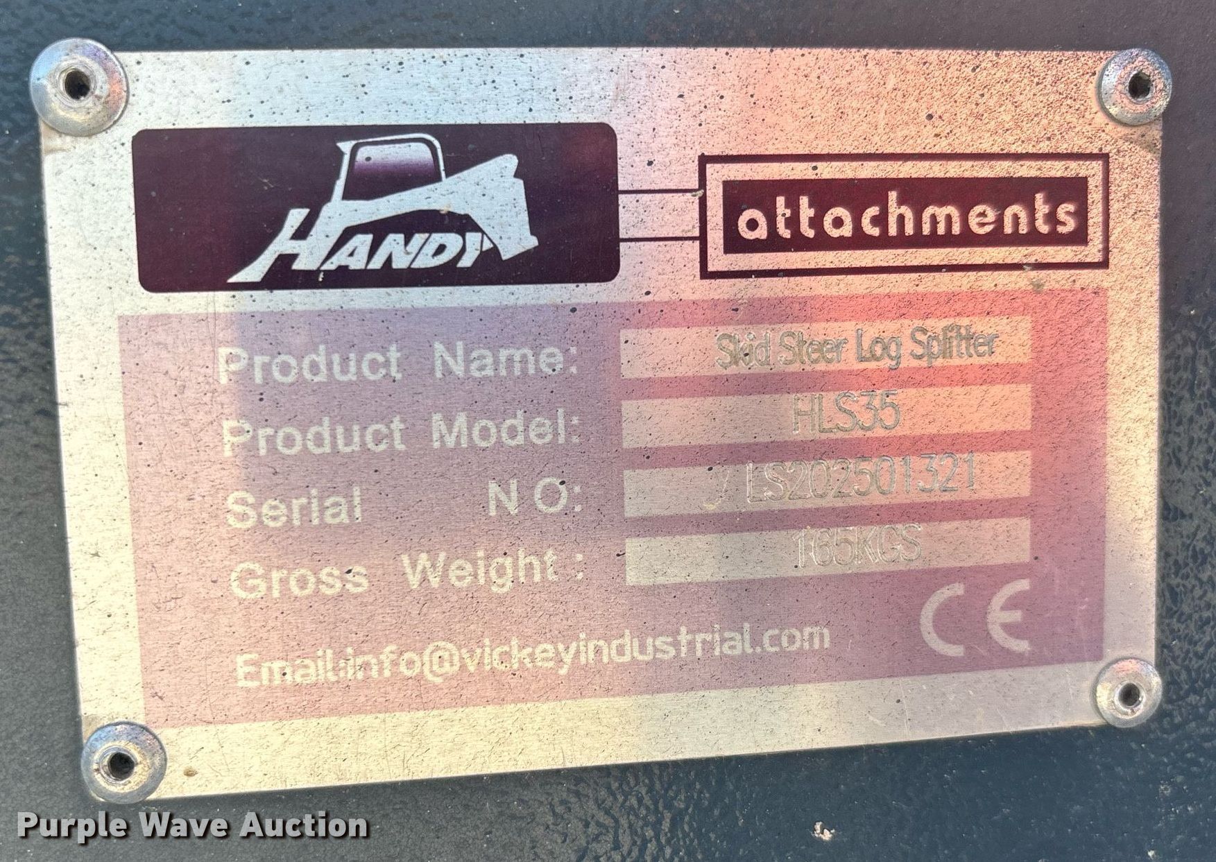 Handy HLS35 skid steer log splitter. Serial: LS202501321, Log capacity: 24" L. Notes Unused. Geringer Construction LLC. Perryville, MO 63775