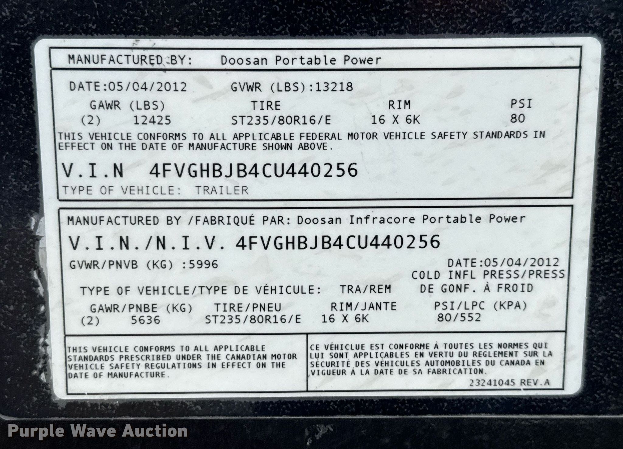 2012 Doosan generator. Hours: 4,933 on meter, VIN: 4FVGHBJB4CU440256, Serial: CH4M13140. Engine Cummins QSL9-G8, Serial: 73331506, Displacement: 8.9L, Cylinders: 6, Fuel type: Diesel. Features Generator Magnum LSA 46.2L9, kVA: 325, kW: 260, Phase: Three, Electric start, Fuel tank. Trailer 19' L x 86" W, Ball hitch size: 2 5/16", Suspension: Torsion, Brakes: Electric, Axles: Tandem, Tire size: 235/80R16, GVWR: 13,218 lbs, GAWR: 12,425 lbs. This is worksite support equipment and will not come with a title. Transfer of ownership documentation will be a bill of sale. Florence, TX 76527
