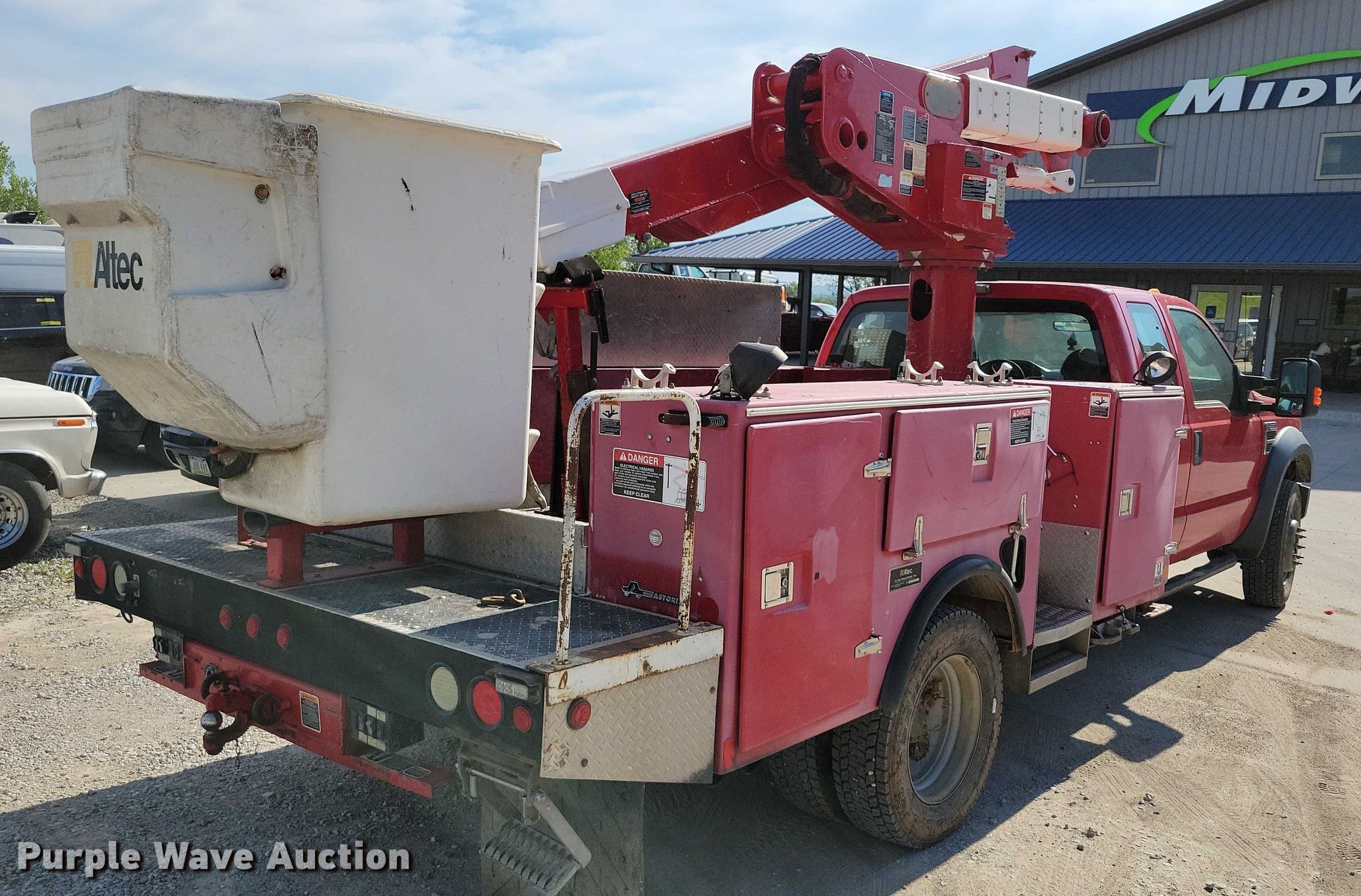 2009 Ford F550 Super Duty bucket truck. Miles: 167,718 on odometer, VIN: 1FDAX57R69EA23652. Engine Displacement: 6.4L, Cylinders: 8, Fuel type: Diesel. Transmission Automatic. Chassis Four wheel drive, Axles: Single, Suspension: Spring, Brakes: Hydraulic, PTO, GVWR: 19,500 lbs, Wheelbase: 186". Interior AC, Heat, Heated mirrors, Power windows, Power locks, Cruise control, Auxiliary controls, Brake controller. Features Bed Altec Astoria, Serial: 2T12119806, 11' x 94" W, Boom 2009 Altec AT40M, Serial: 1208CZ0015, Boom length: 40', Mast height: 7', Maximum lift capacity: 400 lbs, Maximum lift height: 47', Boom type: Articulating, Insulated, Man basket, Boom controls Platform/ basket.. Tires Size: 245/70R19.5. Notes Additional parts included, Dash warning indicator: Check engine. Iowa title. Seller is an Iowa licensed motor vehicle dealer. The buyer may be required to pay sales tax and/or registration fees to the dealer prior to taking possession. Title will be assigned and distributed by the dealer. Please contact the seller for distribution questions. Midwest Auto Sales. Ottumwa, IA 52501