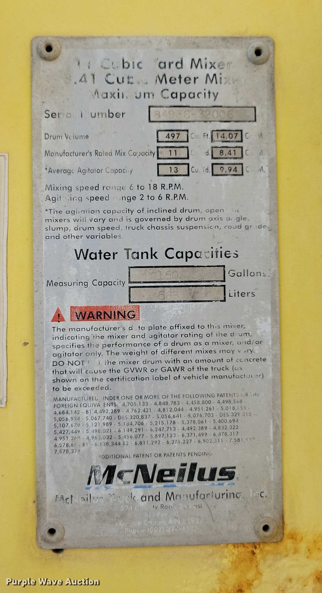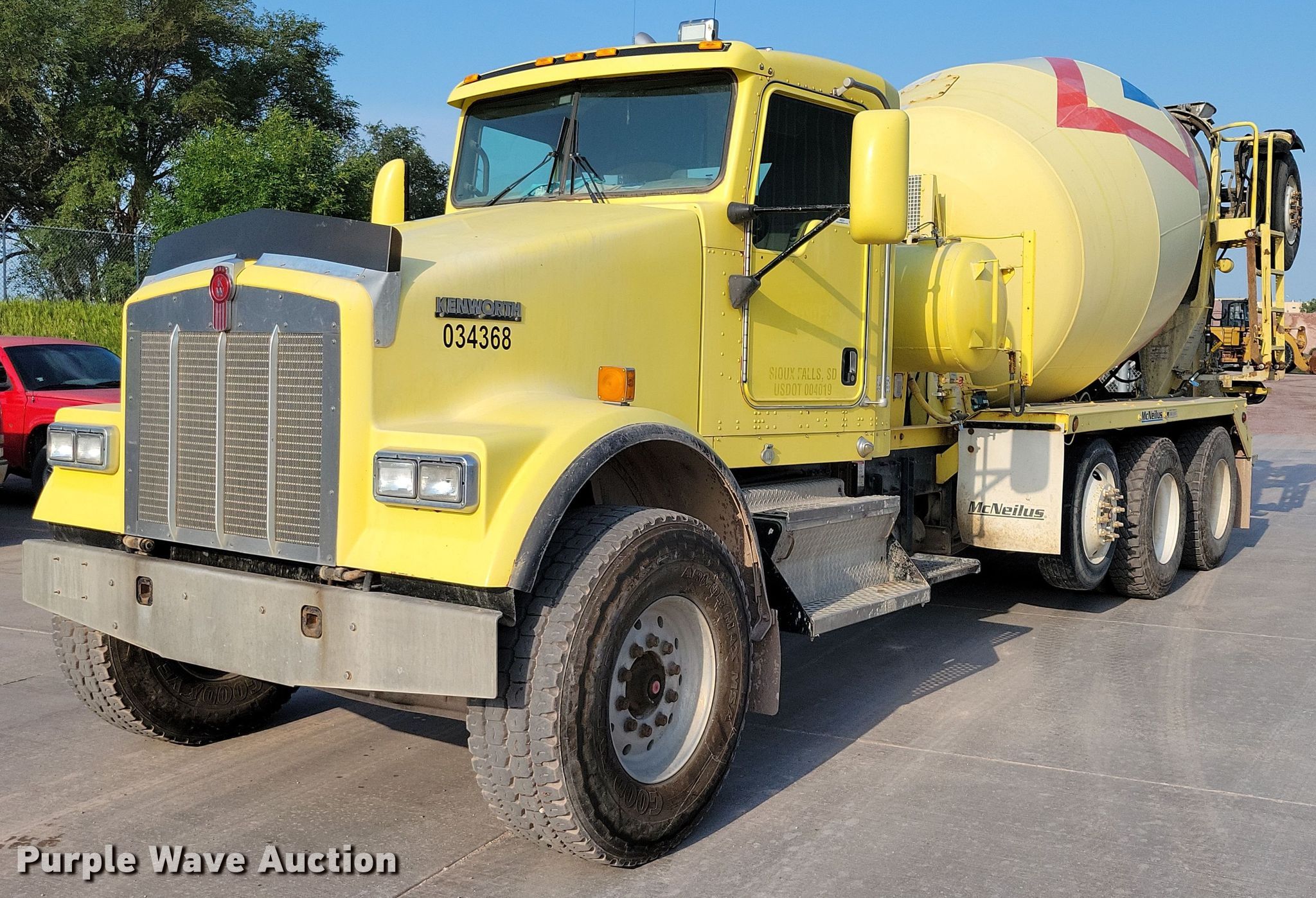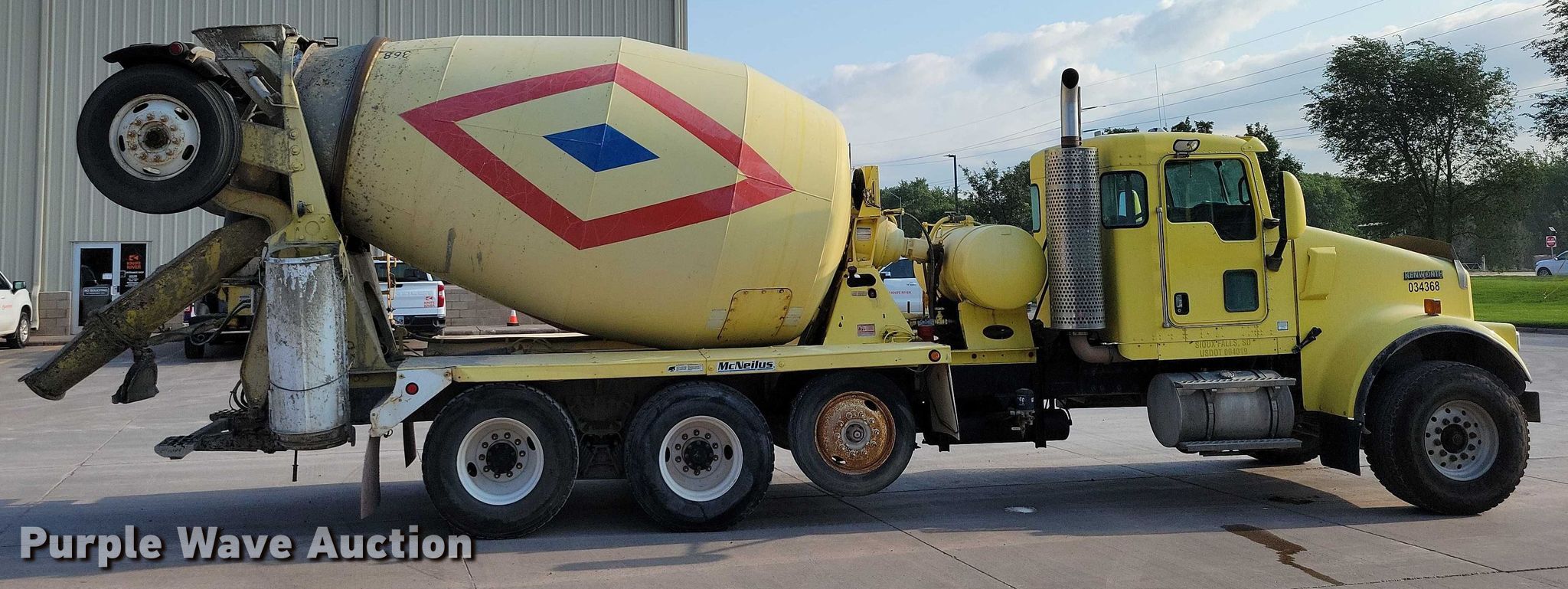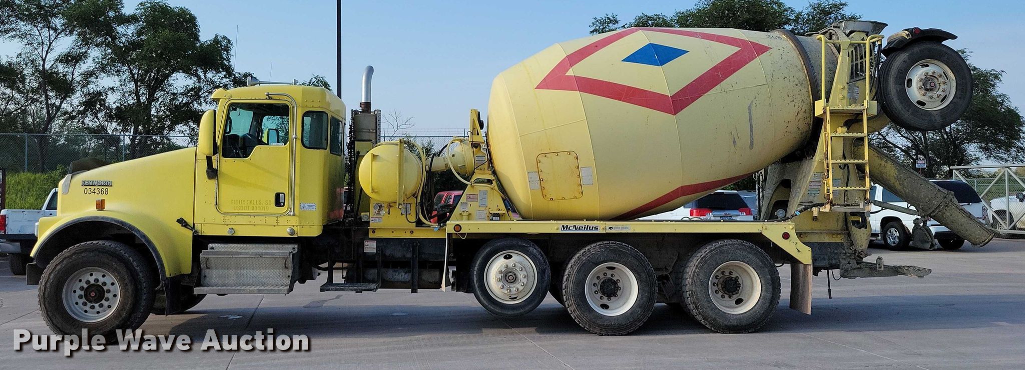2009 Kenworth W900 ready mix truck. Miles: 2,024 on odometer, Miles: Actual unknown, Hours: 22,549 on meter, VIN: 1NKWL00X79J238836. Engine Cummins ISM, Displacement: 10.8L, Cylinders: 6, Fuel type: Diesel. Transmission Eaton Fuller, Manual, Speed: 10. Chassis Axles: 4, Pusher axle Steerable, Tag axle Steerable, Differential lock: Full, Suspension: Spring over walking beam, Brakes: Air, PTO, GVWR: 66,000 lbs FAWR: 20,000 lbs, IAWR: 23,000 lbs, RAWR: 23,000 lbs. Interior AC, Heat, Heated mirrors, Power locks, Cruise control, Backup camera, Auxiliary controls. Features Mixer McNeilus McNeilus, Serial: 84936-32006, Capacity: 11 cu.yd., Discharge: Rear, In-cab controls, Rear drum controls, Water tank capacity: 150 gallons, Chute Extensions: 3, Chute type: Aluminum.. Tires Front: 425/65R22.5, Rear: 11R22.5, Lift axle: 255/70R22.5. South Dakota title. Mileage has not been verified. Odometer discrepancy will be marked on the title. Title distribution may be delayed up to 14 days from verification of funds. Concrete Materials - Sweetman Const.. Sioux Falls, SD 57107