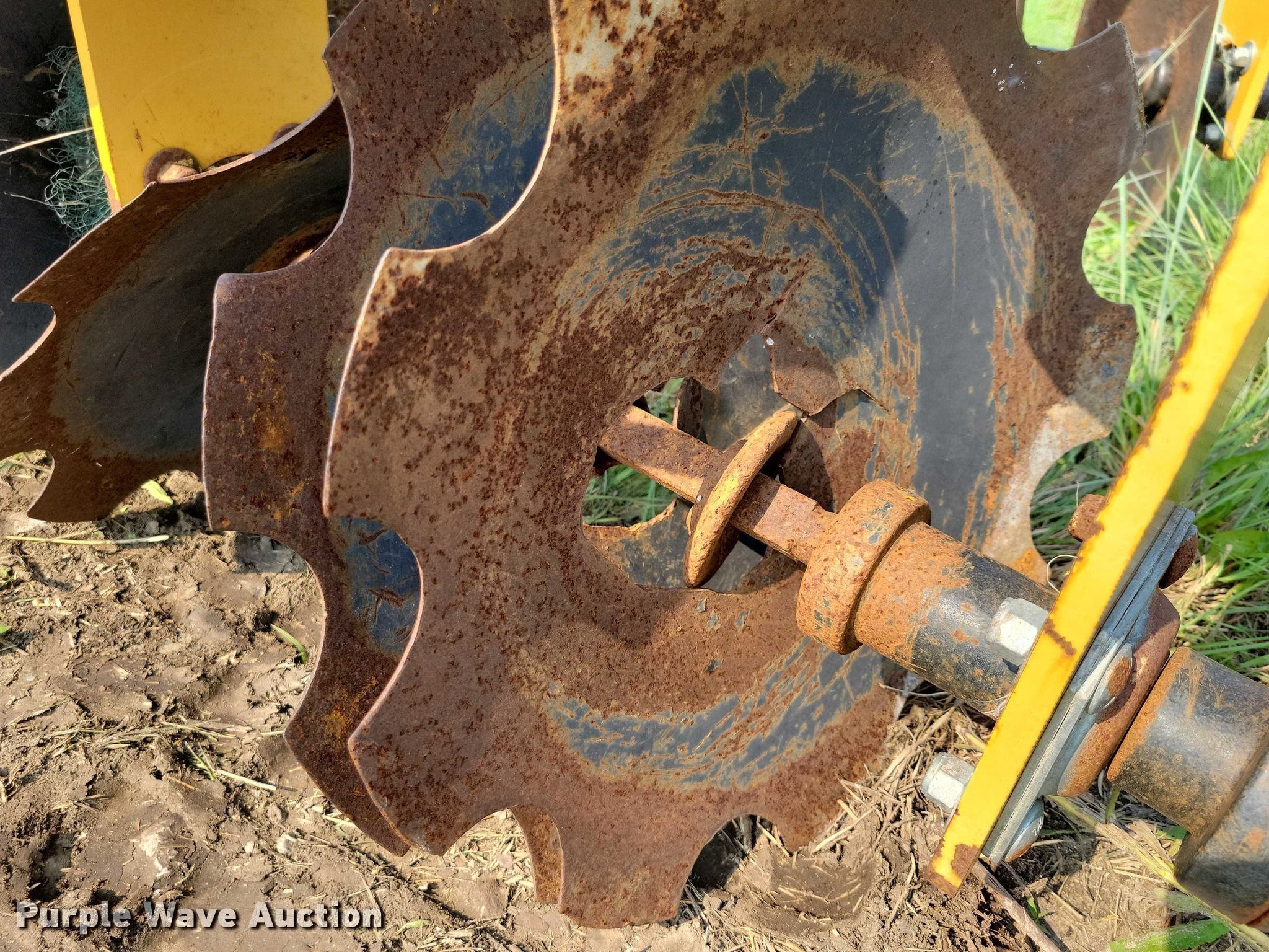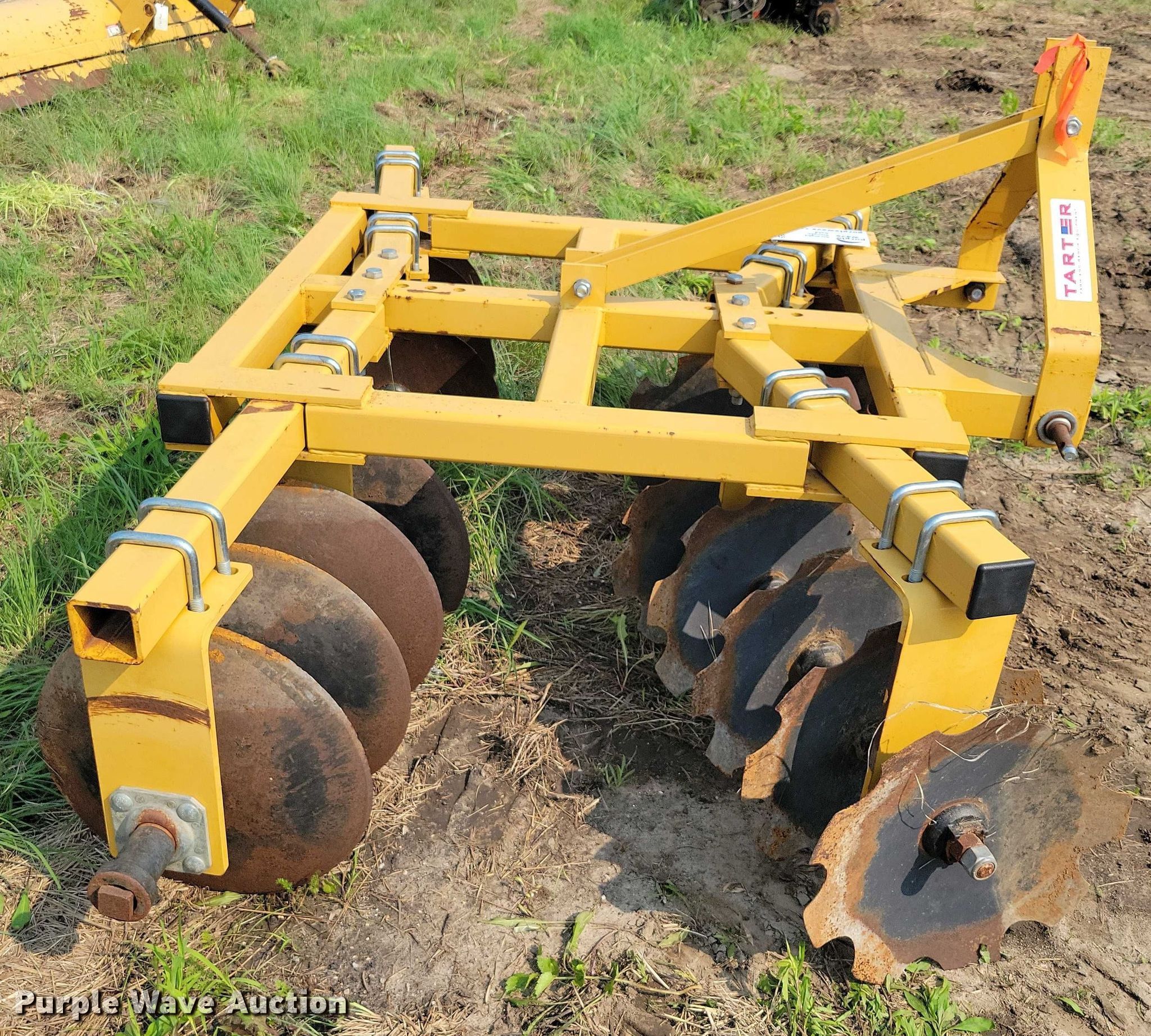 Tarter off-set disk. Overall width: 7'. Features Front blades Diameter: 18", Spacing: 8", Rear blades Diameter: 18", Spacing: 8", Attachments Hitch: Three point. Country Landscapes, Inc.. Ames, IA 50010