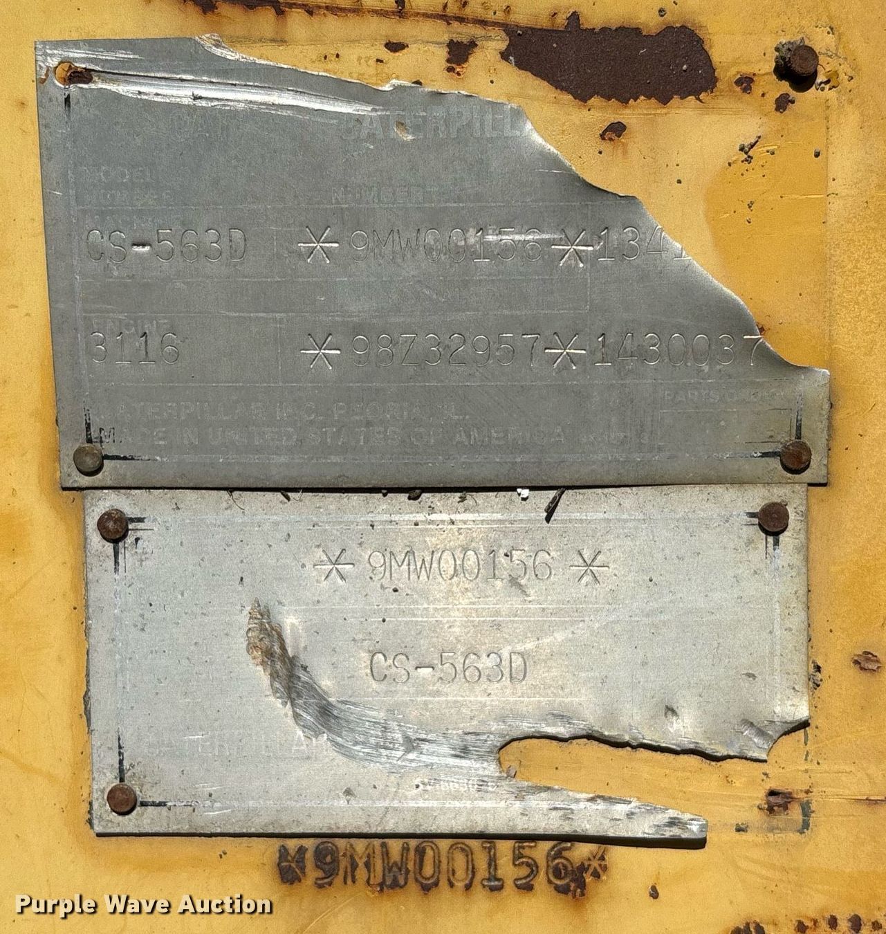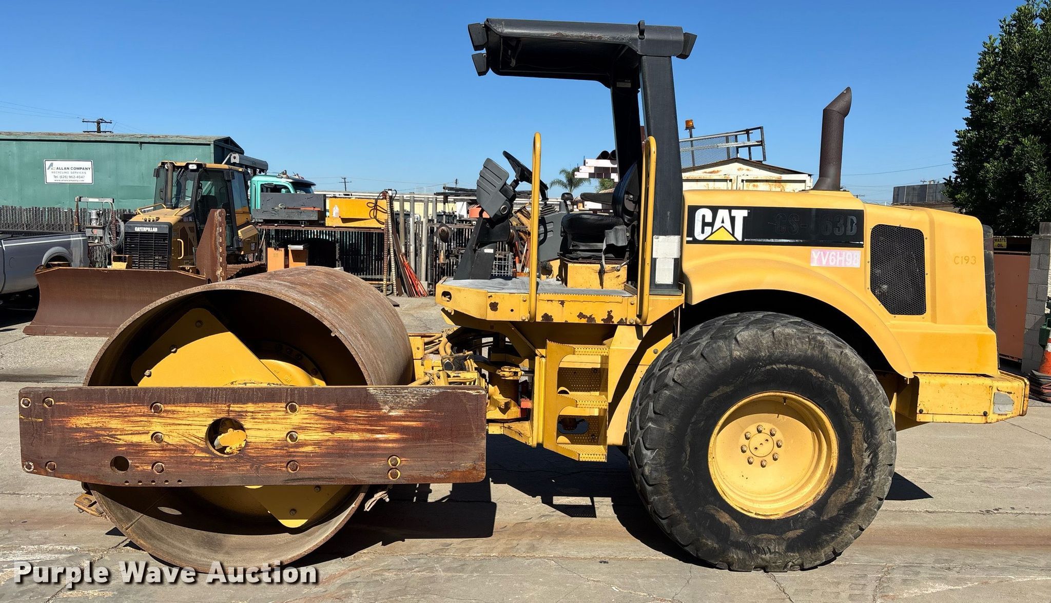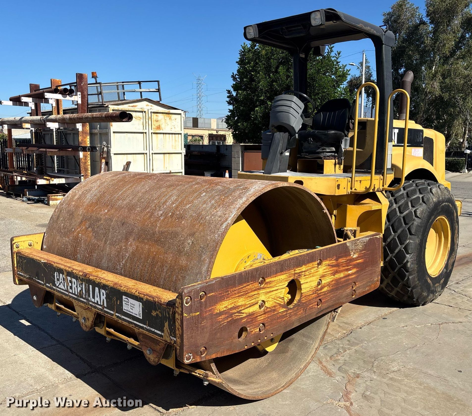 Purple Wave is selling a used Single Drum Roller Compactor in California. This item is a 2000 Caterpillar CS-563D single drum vibratory roller with the following: Hours: 2,077 on meter, Serial: 9MW00156