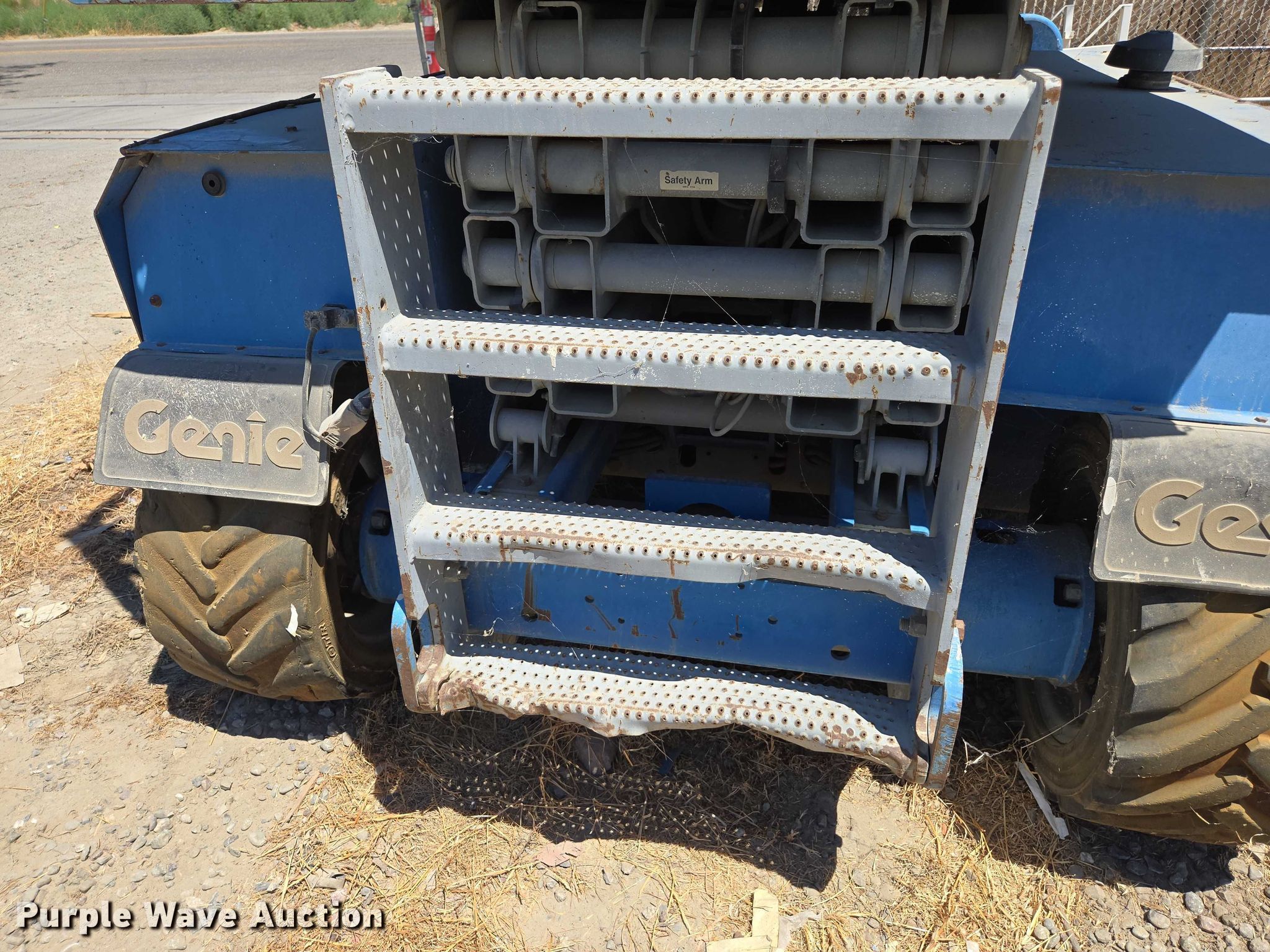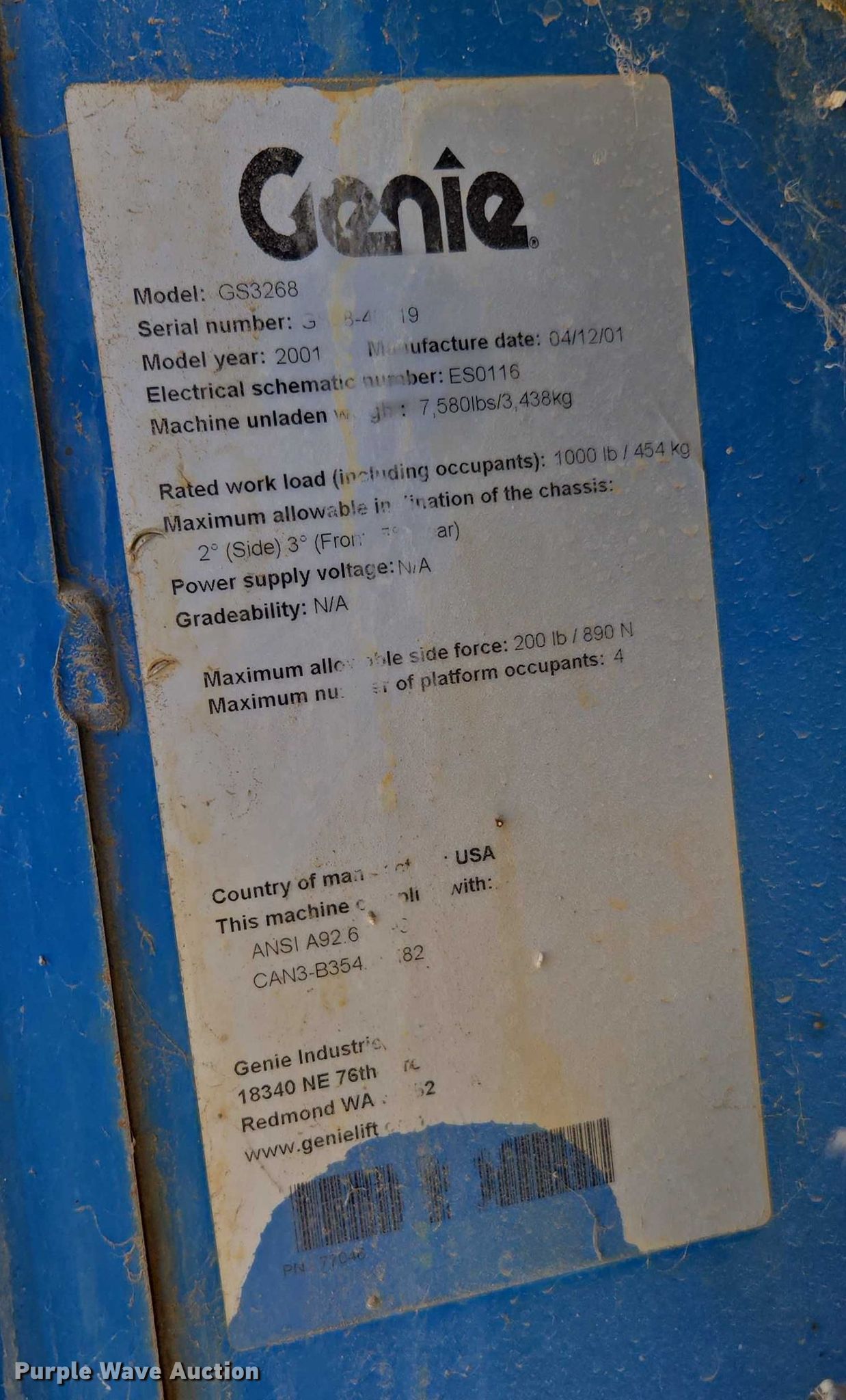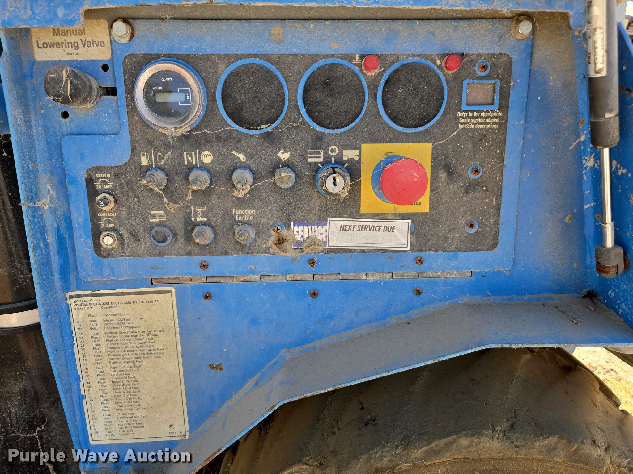 2001 Genie GS-3268 RT scissor lift. Hours: Unknown. Engine Cylinders: 3, Fuel type: Diesel. Chassis Steering: Four wheel. Features Rough terrain, Maximum lift capacity: 1,000 lbs, Platform: 96" L x 60" W, Controls: Remote Control, Ground, Platform extensions: Powered. Tires Tire size: 26X12. Notes Non-operational unit. Thomas Brothers Equipment Rental. Tracy, CA 95304