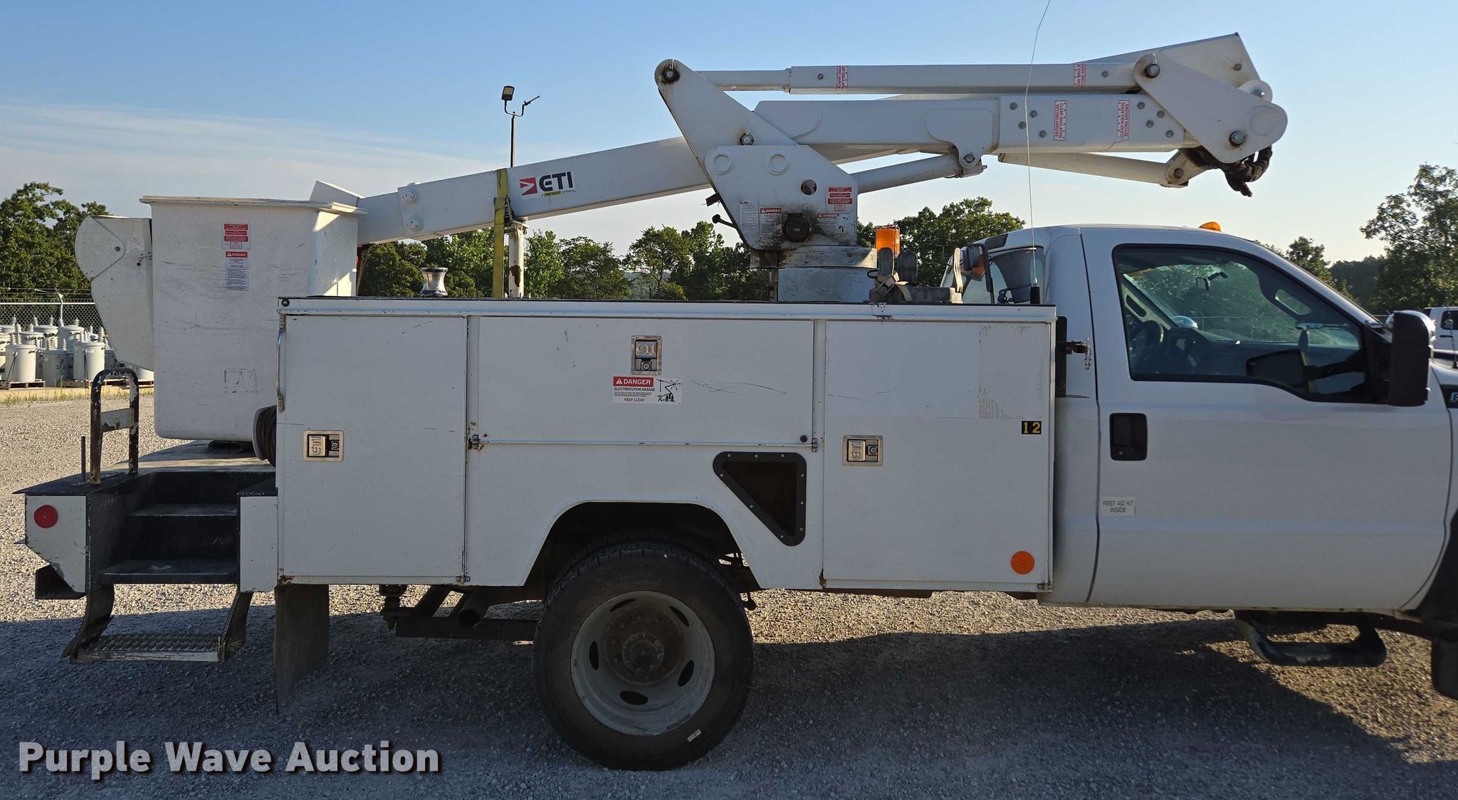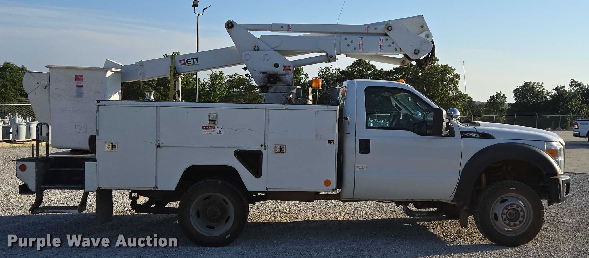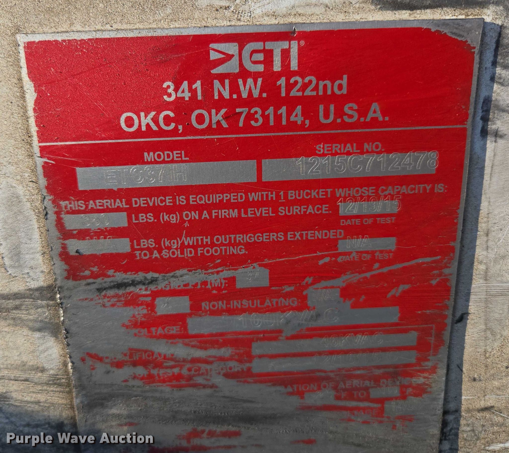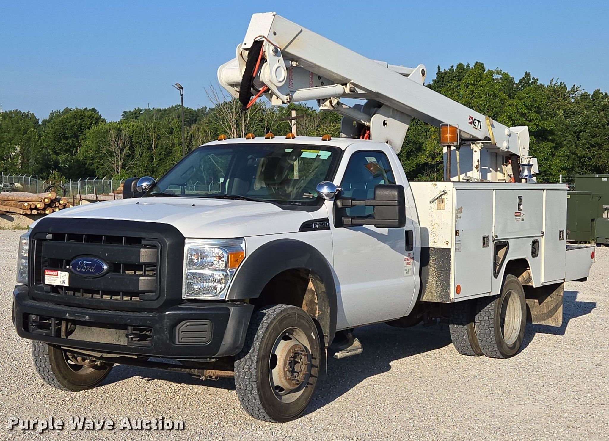 2016 Ford F550 Super Duty XL bucket truck. Miles: 163,440 on odometer, VIN: 1FDUF5HYXGEA99698, Unit #: 12. Engine Displacement: 6.8L V10 DOHC, Cylinders: 10, Fuel type: Gas. Transmission Automatic. Chassis Four wheel drive, Axles: Single, Suspension: Spring, Brakes: Hydraulic, GVWR: 19,000 lbs. Interior AC, Heat, Auxiliary controls, Brake controller. Features Bed ETI SB108DD96A36R, Length: 12', Width: 96", Boom ETI ETC37IH, Serial: 1215C712478, Boom length: 14' 7", Maximum lift capacity: 350 lbs, Boom type: Insulated, Telescopic, Man basket, Boom controls Ground, Platform/ basket.. Tires Size: 225/70R19.5. Notes Muffler damaged, hole. Missouri title. Title distribution may be delayed up to 14 days from verification of funds. Mansfield, MO 65704