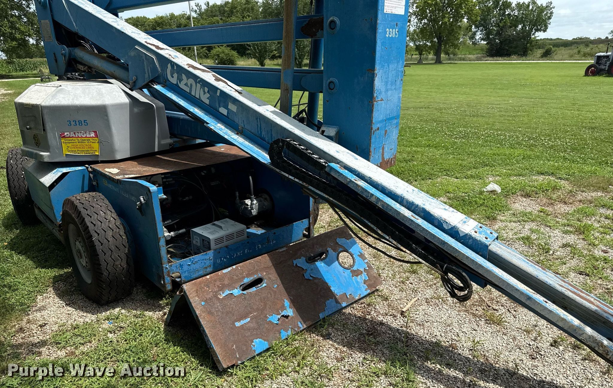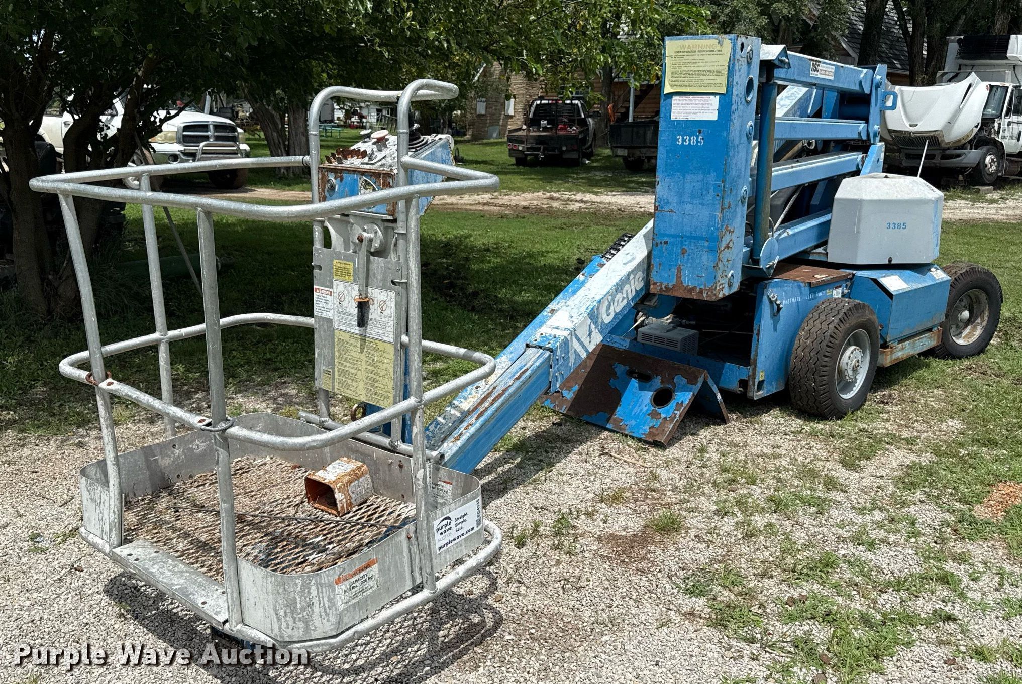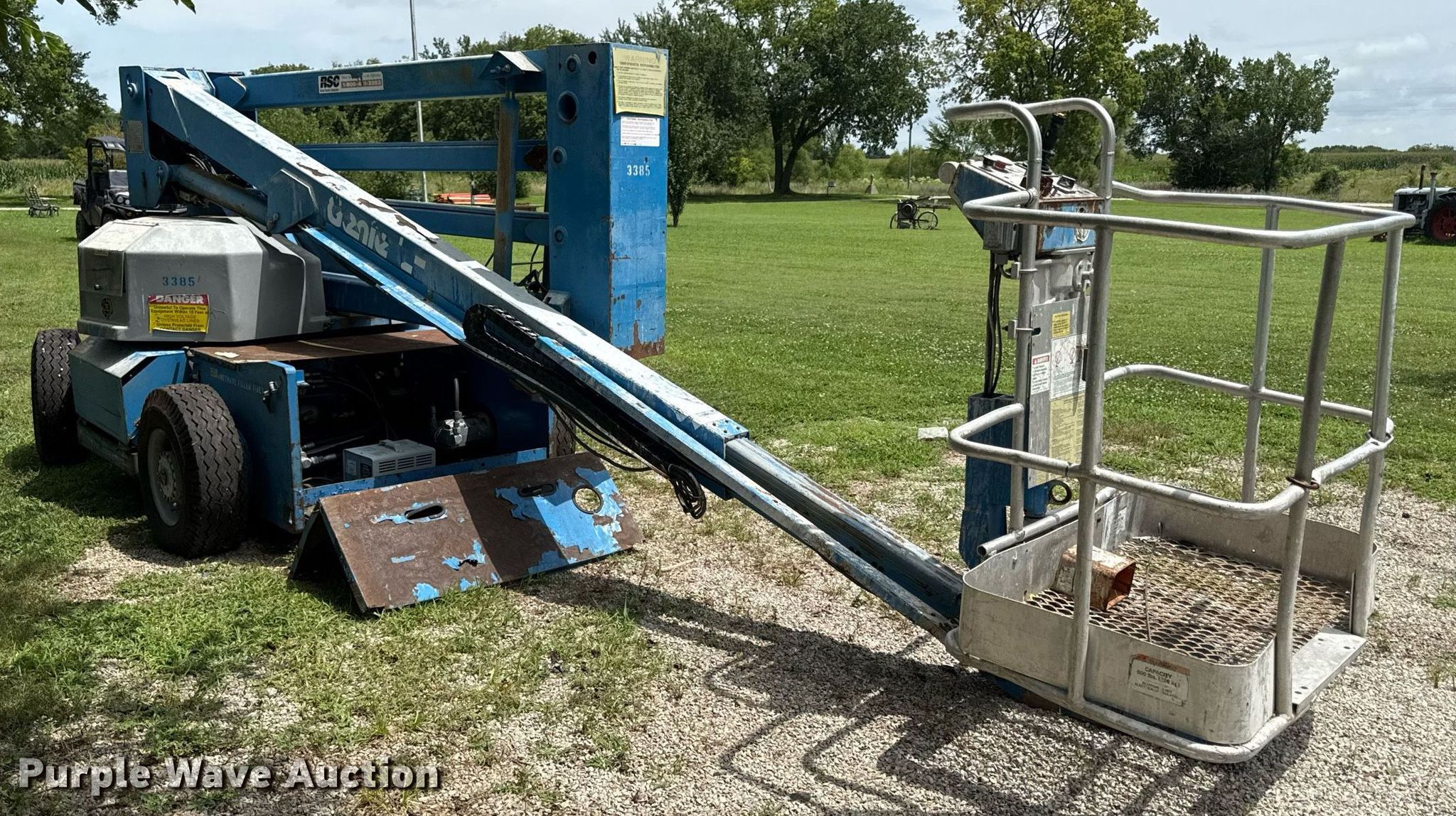 1996 Genie Z-45/22 boom lift. Serial: 3385. Electric Motor Volts: 36. Features Rough terrain, Boom type: Articulating, Telescopic, Maximum lift capacity: 500 lbs, Maximum lift height: 45', Platform: 48" L x 28" W, AC power outlet, Controls: Platform, Ground. Tires Tire size: 9-14.5, Foam filled. Notes Batteries may need replaced, Dead battery, Unknown operating condition. Colony, KS 66015