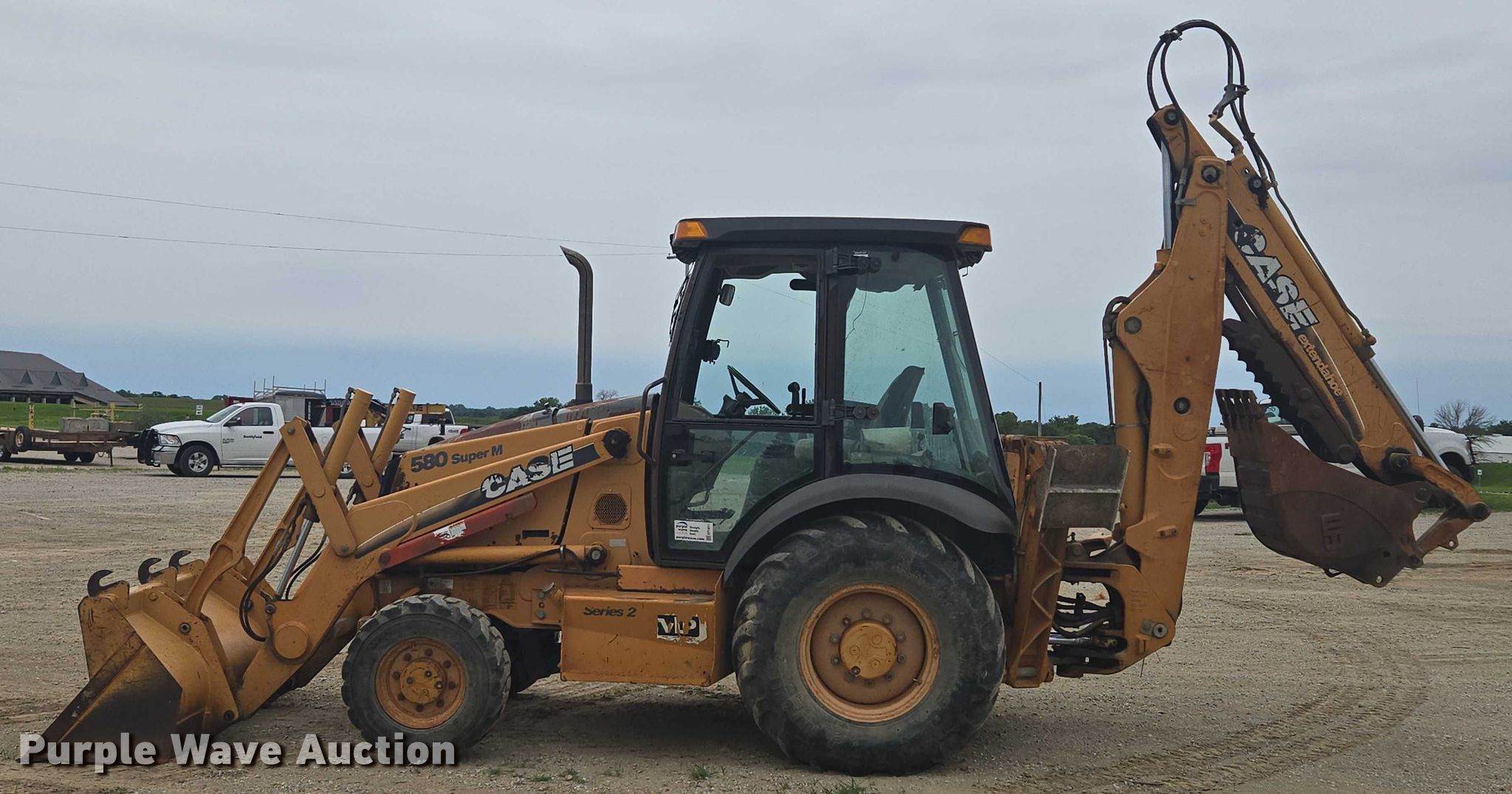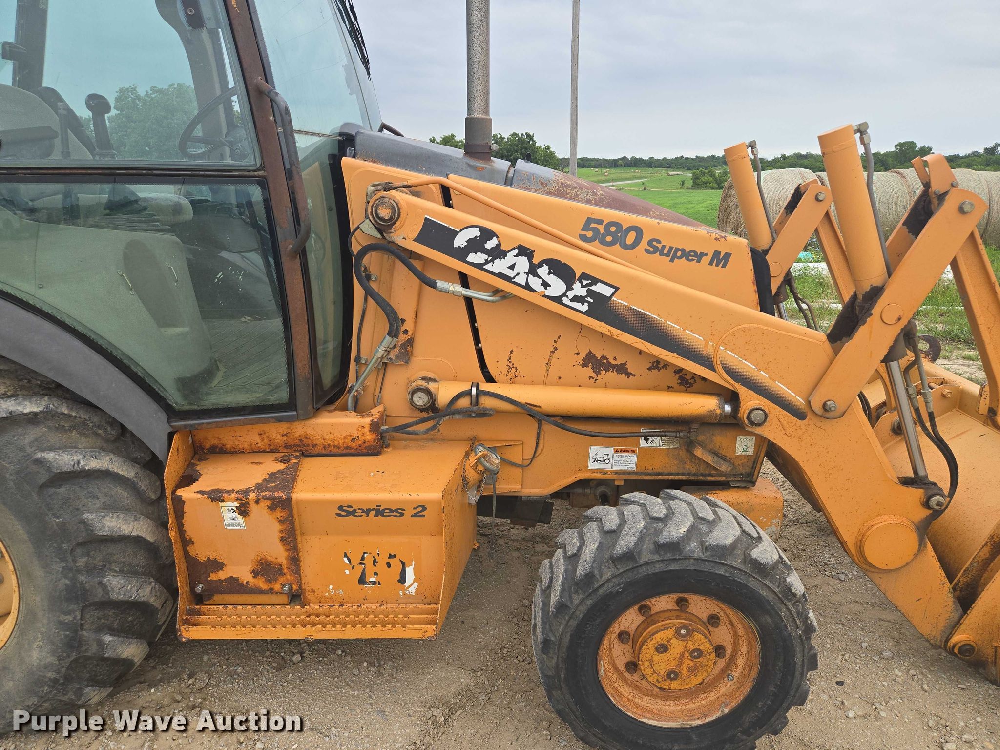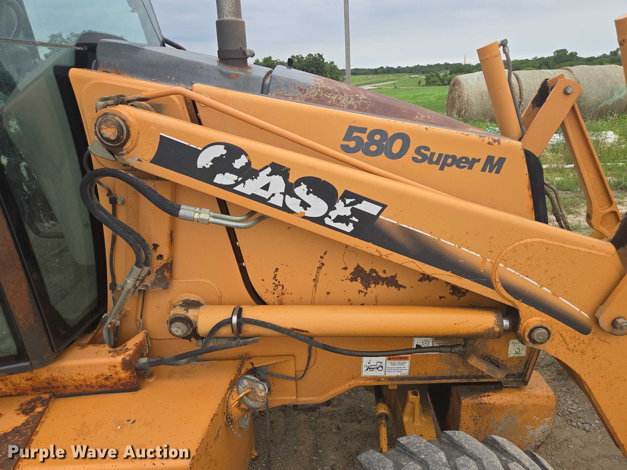 2005 Case 580 Super M backhoe. Hours: 6,742 on meter, Serial: N5C385611. Engine Case 445T, Cylinders: 4, Fuel type: Diesel. Transmission Shuttle shift, 4F - 4R. Chassis Four wheel drive. Operators station Enclosed cab, AC, Heat, Backhoe controls: Four stick. Features Loader Bucket Width: 83", Cutting edge: Bolt-on, Backhoe Extendable stick, Thumb: Manual, Bucket WB, Width: 24", Cutting edge: Weld-on, Teeth: 5.. Tires Front: 12-16.5, Rear: 19.5-24. Notes Door glass missing. Princeton, MO 64673