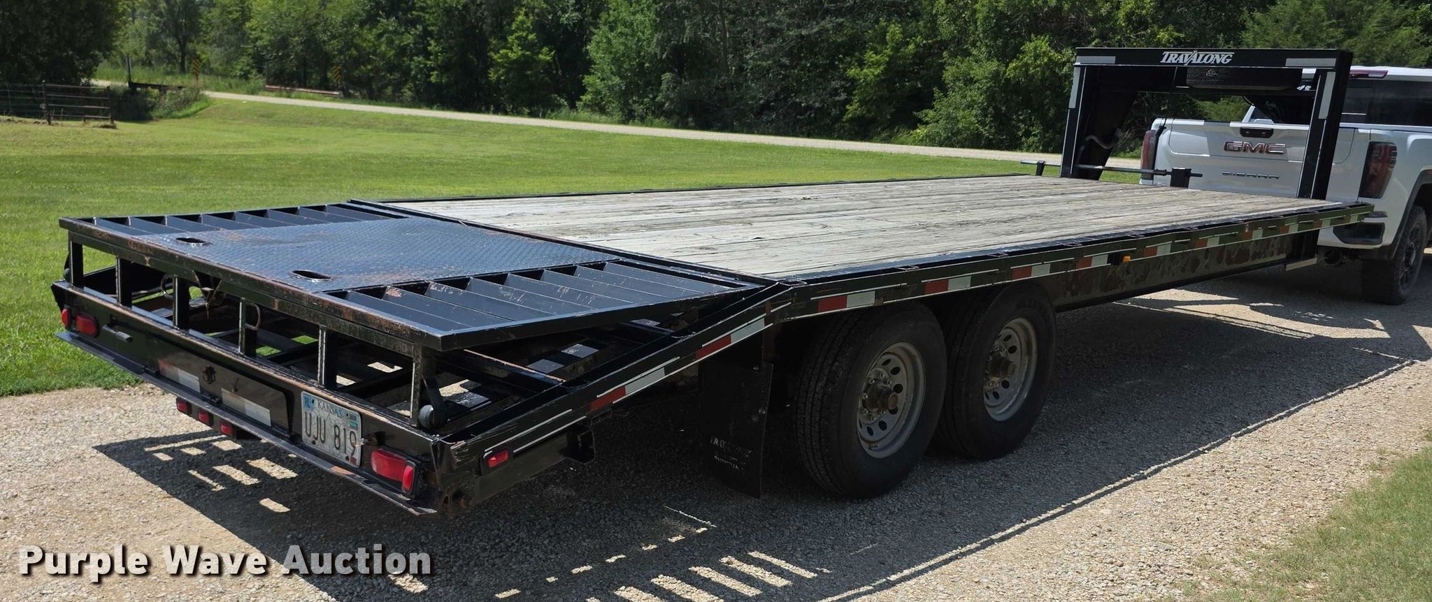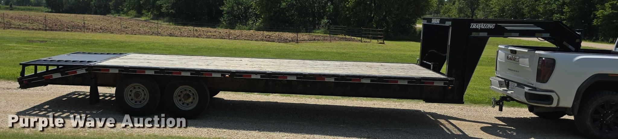 2004 Travalong equipment trailer. VIN: 4DYFS242541024354. Dimensions Overall Length: 33', Width: 8' 6", Deck Length: 20' 1", Width: 8' 6", Tail length: 4' 3", Ramps: Manual Length: 4' 3". Features Deck type: Wood. Chassis Hitch: Gooseneck, Landing gear: Single, Suspension: Spring, Axles: Tandem, GVWR: 15,058 lbs, GAWR: 6,400 lbs. Tires Steel wheels, Size: 235/80R16. Kansas title. Title distribution may be delayed up to 14 days from verification of funds. Leonardville, KS 66449