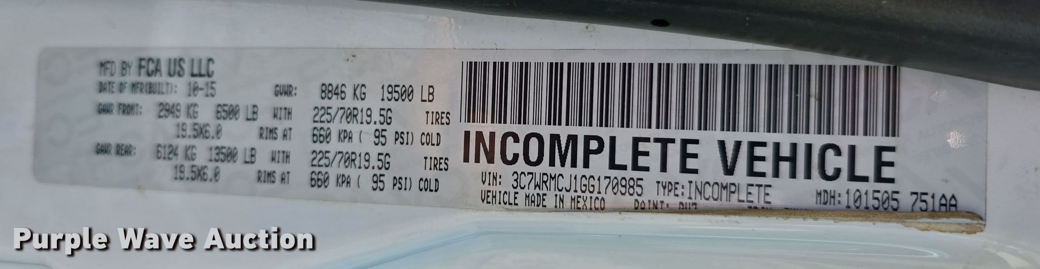 2016 Dodge Ram 5500HD flatbed truck. Miles: 191,788 on odometer, VIN: 3C7WRMCJ1GG170985, Unit #: 177. Engine Displacement: 6.4L, Cylinders: 8, Fuel type: Gas. Transmission Automatic. Chassis Suspension: Spring, Brakes: Hydraulic, GVWR: 195,000 lbs. Interior AC, Heat, Cruise control. Features Bed Flatbed, Length: 15', Width: 8' 5". Tires Size: 225/79R19.5. Notes Passenger side mirror cracked, Dash warning indicator: Check engine, Non-operational engine, blown , Engine issues, smokes , Non-operational unit Unit must be towed or hauled. Texas title. Title distribution may be delayed up to 30 days from verification of funds. Concrete Vaults, Inc.. Osage City, KS 66523