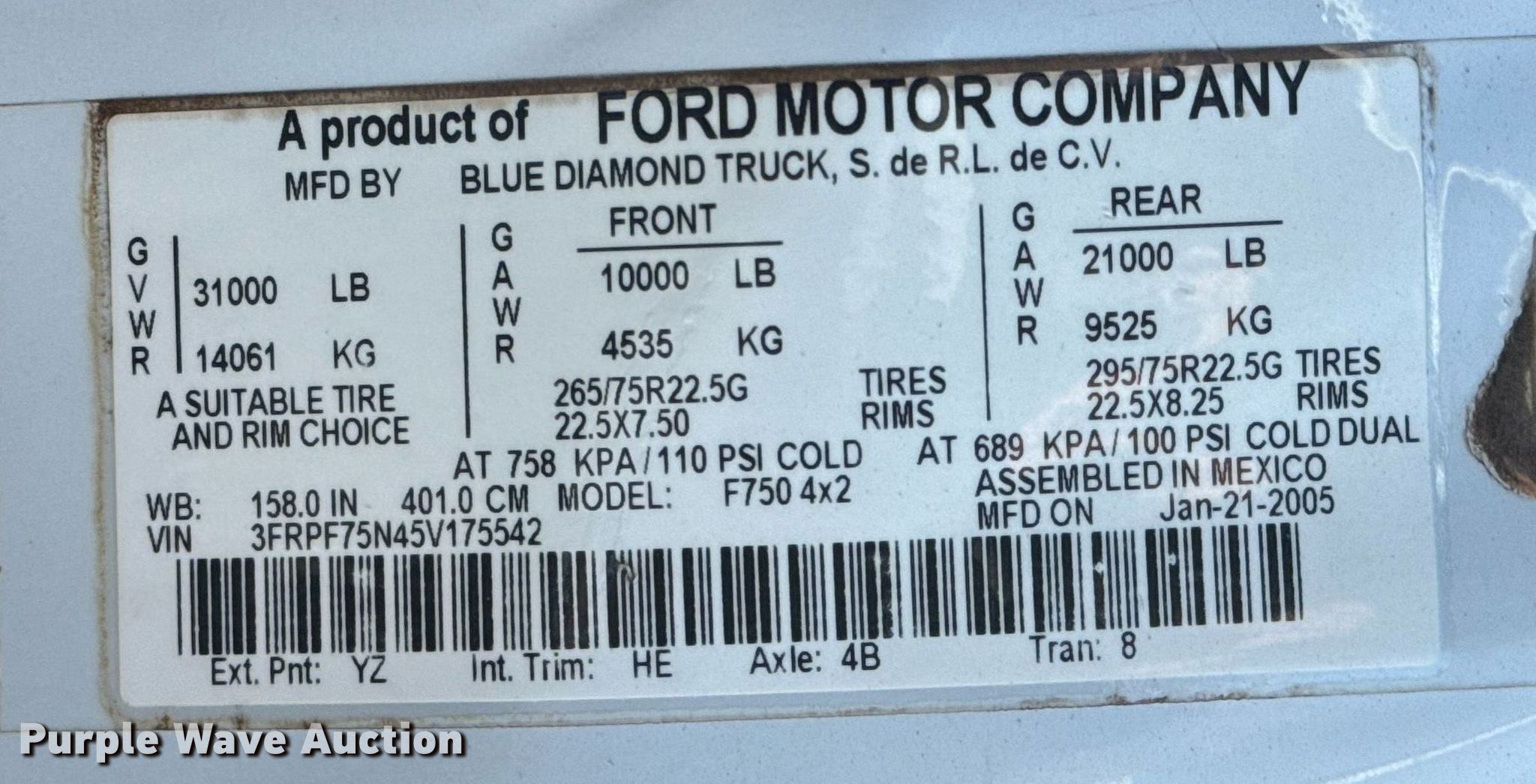 2005 Ford F750 Super Duty dump truck. Miles: 52,299 on odometer, VIN: 3FRPF75N45V175542. Engine Caterplillar C7, Serial: KAL87698, Displacement: 7.2L OHV, Cylinders: 6, Fuel type: Diesel, HP: 210, kW: 156.5. Transmission Manual, Speed: 6. Chassis Axles: Single, Suspension: Spring, Brakes: Hydraulic, PTO, GVWR: 31,000 lbs FAWR: 10,000 lbs, RAWR: 21,000 lbs, Wheelbase: 158". Interior AC, Heat, Cruise control, Brake controller. Features Bed Dump bed, Length: 9' 10", Width: 97", Side height: 28", Side board height: 11", Bed type: Steel, Roll tarp, Ram: Single, End gate: Air operated. Tires Size: 11R22.5. Notes Dash warning indicator: ABS. Oklahoma title. Seller is an Oklahoma licensed motor vehicle dealer. Title will be assigned and distributed by the dealer. Please contact the seller for distribution questions. Title distribution may be delayed up to 30 days from verification of funds. Collinsville, OK 74021