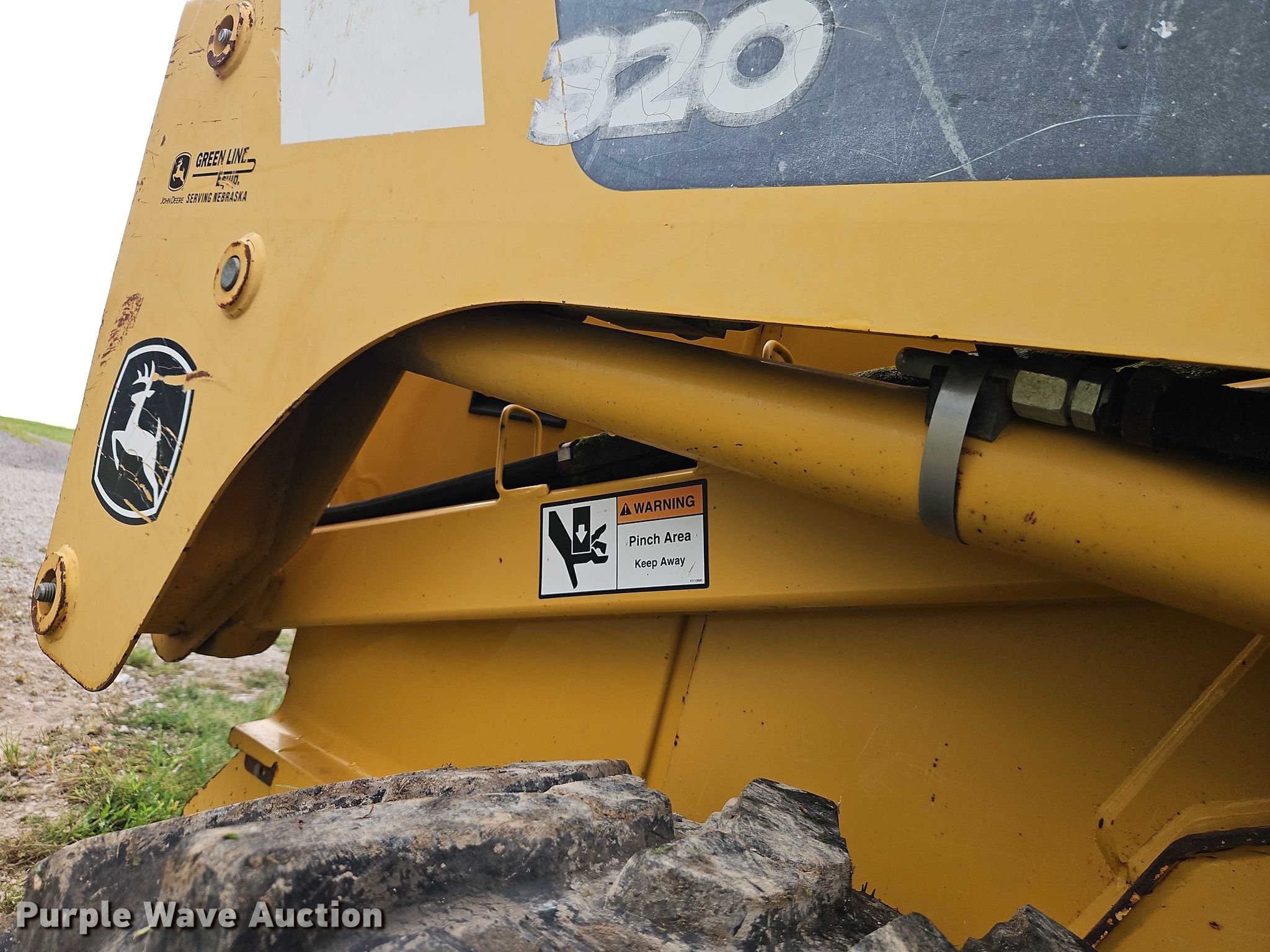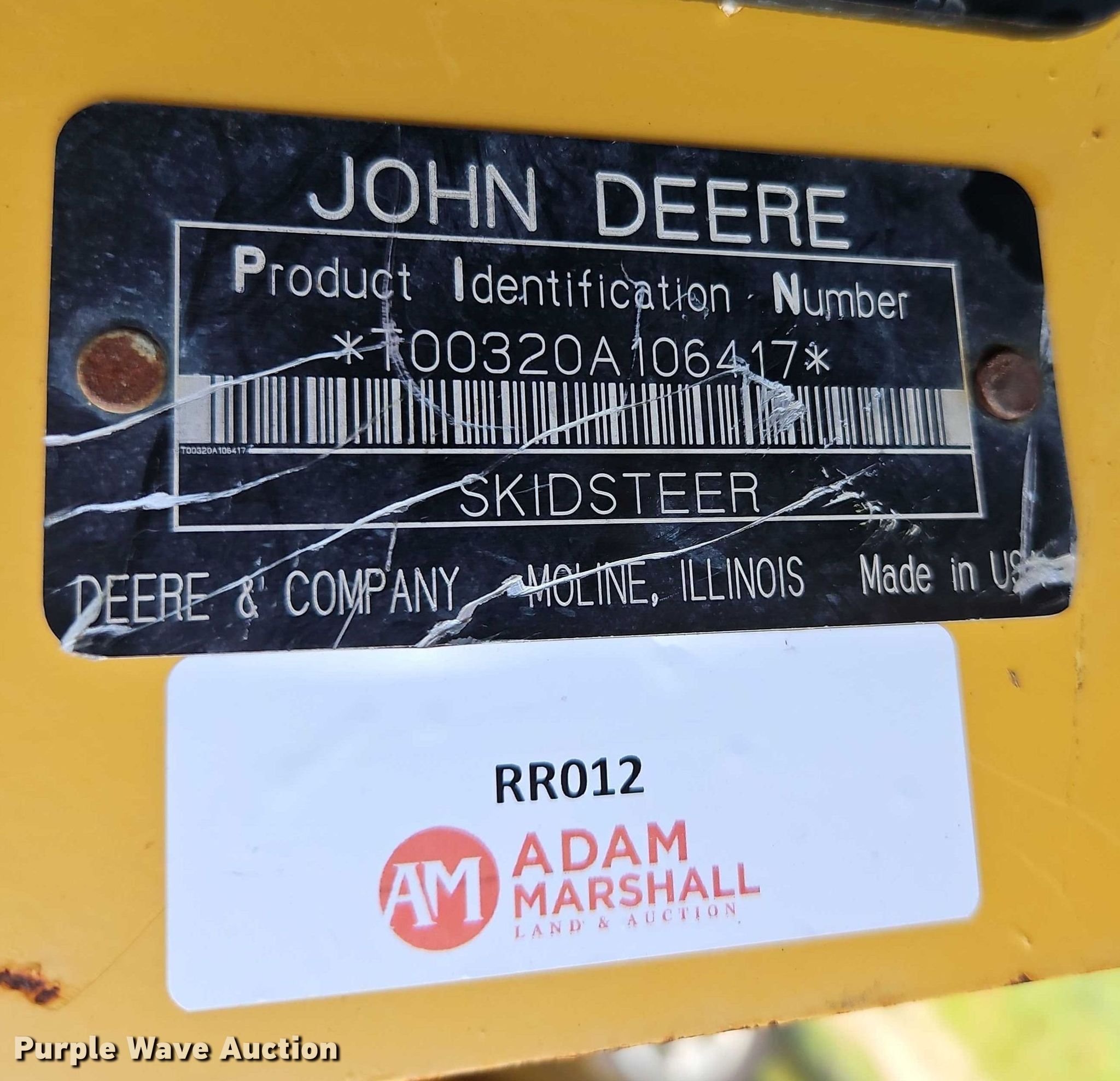 2005 John Deere 320 skid steer loader. Hours: 1,595 on meter, Serial: T00320A106417. Engine John Deere 4024, Displacement: 2.4L, Cylinders: 4, Fuel type: Diesel. Transmission Hydrostatic. Operators station Enclosed cab, Bucket control: Selectable. Features Auxiliary hydraulics, Quick coupler: Manual, Bucket Width: 74", Low profile, Cutting edge: Weld-on. Tires Size: 12-16.5. Notes Jump start required during on-site data collection. Leeton, MO 64761
