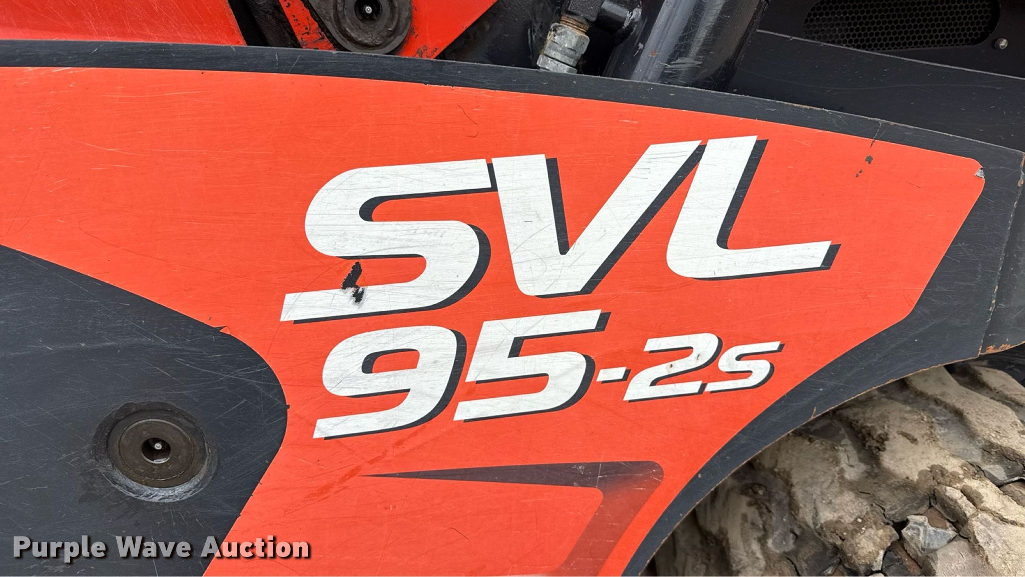 2018 Kubota SVL95-2S tracked skid steer loader. Hours: 3,622 on meter, Serial: 42228, Unit #: M61. Engine Kubota V3800, Serial: JKBXL03.8AMD, Displacement: 3.8L, Fuel type: Diesel. Transmission Hydrostatic, Two speed travel. Operators station Enclosed cab, AC, Heat, Bucket control: Hand, Electronic Monitoring System panel. Features Auxiliary hydraulics, Quick coupler: Hydraulic, Bucket Width: 72", Low profile, Cutting edge: Bolt-on. Tracks Width: 18". Notes Door missing. PirTano Construction Company. Addison, IL 60101
