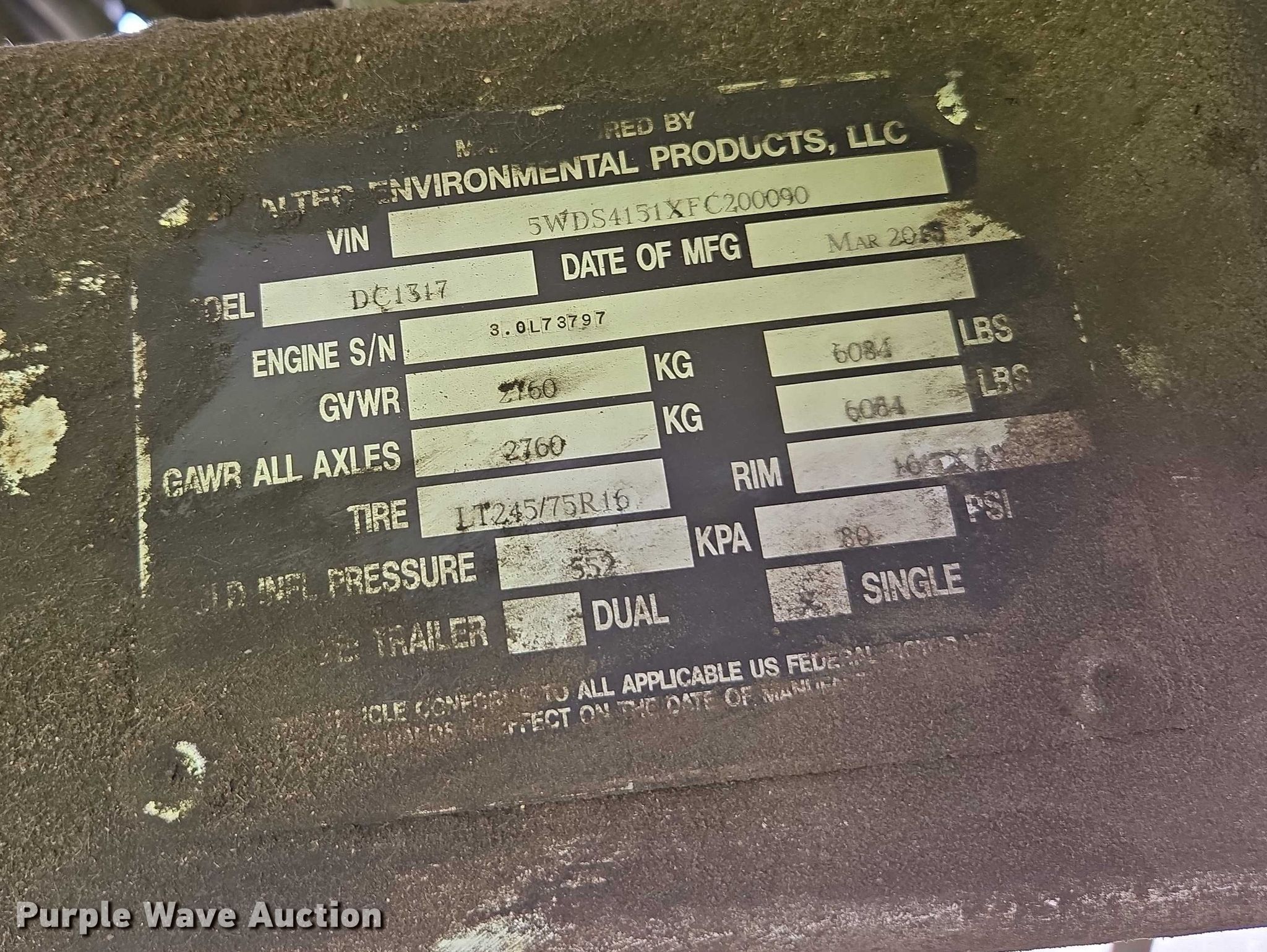 2015 Altec DC 1317 wood chipper. Hours: 1,778 on meter, VIN: 5WDS4151XFC200090, Unit #: 65470225. Engine PS1, Serial: 3OL73797, Displacement: 3.0L, Cylinders: 4, Fuel type: Gas. Features Capacity: 62", Throat opening: 17" x 16", Cutting head diameter: 6". Tires Size: ST235/80R16. Trailer Hitch: Pintle, Ball hitch size: 2 5/16", Suspension: Spring, Axles: Single, GVWR: 6,084 lbs. Notes Fuel line disconnected, Flat tire, Dead battery, Non-operational unit. Fleet inventory reduction, stored at a secured facility. Please review REQUIRED REMOVAL INSTRUCTIONS. Titles will be distributed after confirmation of payment and removal. Iowa title. Title distribution may be delayed up to 30 days from verification of funds. Fleet Reduction. 3333 North Railroad Avenue. Pasco, WA 99301