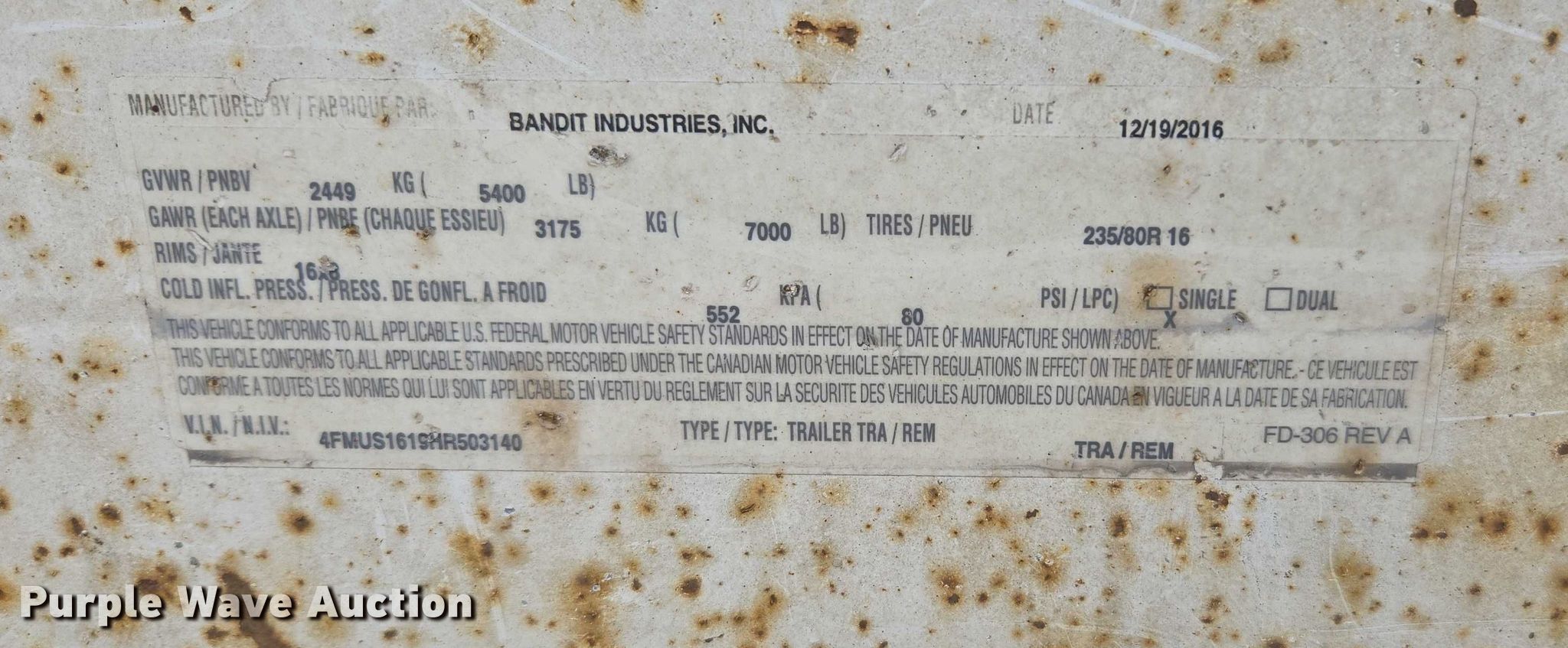 2017 Bandit 200UC wood chipper. Hours: 14,120 on meter, VIN: 4FMUS1619HR503140, Unit #: 65472945. Engine PSI, Displacement: 3.0L, Cylinders: 4, Fuel type: Gas. Features Capacity: 62", Throat opening: 17" x 16", Cutting head diameter: 6". Tires Size: ST235/80R16. Trailer 17' L x 79" W, Hitch: Pintle, Ball hitch size: 2 5/16", Suspension: Spring, Axles: Single, GVWR: 5,400 lbs. Notes Dead battery. Fleet inventory reduction, stored at a secured facility. Please review REQUIRED REMOVAL INSTRUCTIONS. Titles will be distributed after confirmation of payment and removal. Iowa title. Title distribution may be delayed up to 30 days from verification of funds. Fleet Reduction. 3333 North Railroad Avenue. Pasco, WA 99301