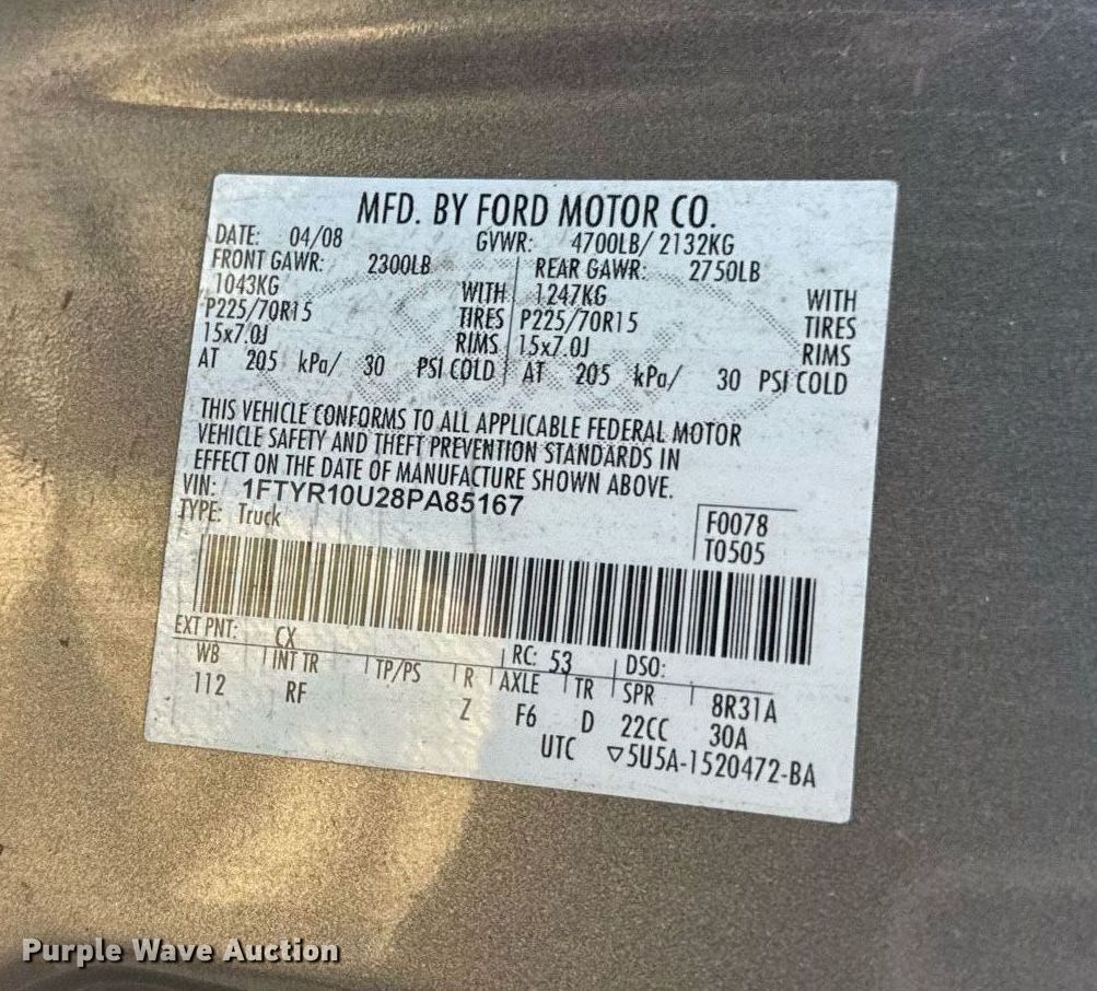 Purple Wave is selling a used Compact Pickup or Van in Missouri. This item is a 2008 Ford Ranger pickup truck with the following: VIN: 1FTYR10U28PA85167