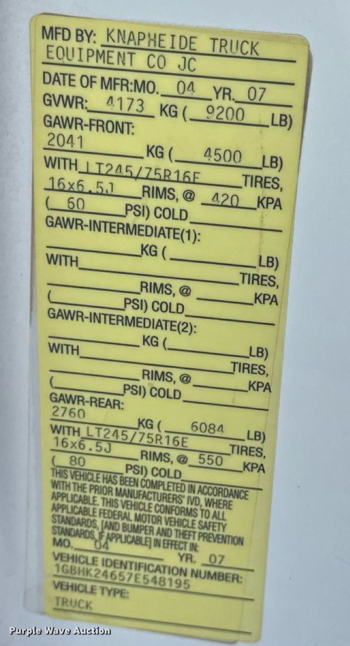 2007 Chevrolet Silverado 2500HD utility bed pickup truck. Miles: 160,749 on odometer, VIN: 1GBHK24657E548195. Engine Displacement: 6.6L V8 OHV, Cylinders: 8, Fuel type: Diesel. Transmission Allison, Automatic, Four wheel drive. Interior AC, Heat, Heated mirrors, Power windows, Power locks, Cruise control. Features Bed Utility bed, Knapheide 596J, Serial: 20070403-0065433, Length: 8' 1", Width: 80". Tires Size: 245/75R16. Notes Hail damage, Passenger door issues, hinges need adjustment. Missouri title. Title distribution may be delayed up to 14 days from verification of funds. City of Jefferson, MO. Jefferson City, MO 65101