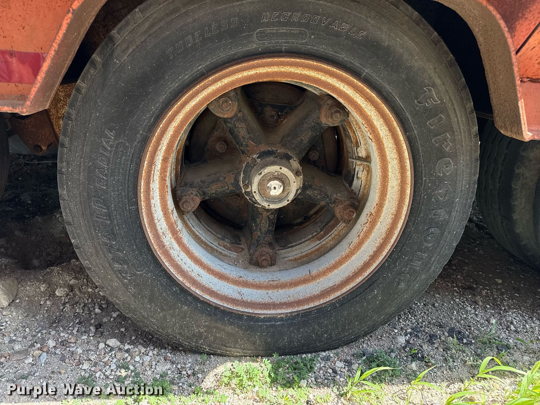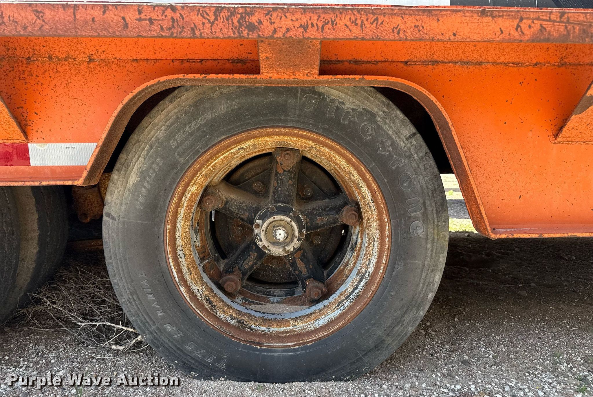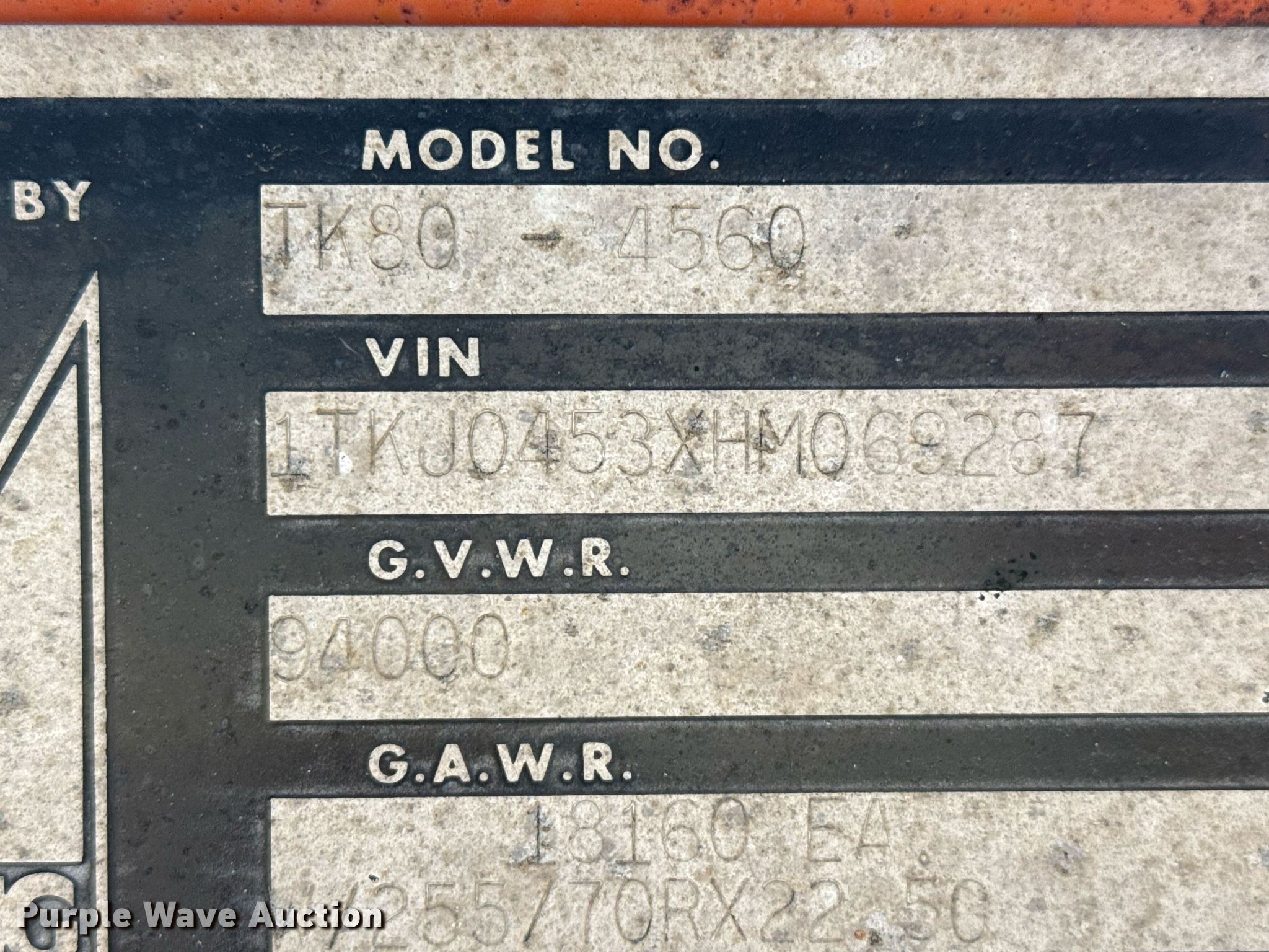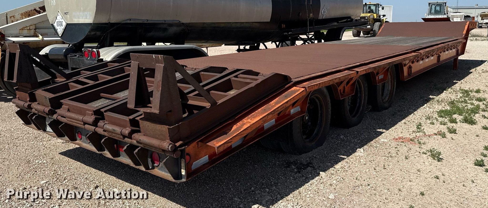 1987 Trail King TK80-4560 drop deck equipment trailer. VIN: 1TKJ0453XHM069287. Dimensions Overall: 45' L x 112" W, Deck: 30' L x 102" W, Top deck length: 7', Tail length: 5', Ramps: Manual Length: 5'. Features Deck type: Steel, Wood. Chassis Landing gear: Dual, Suspension: Spring, Brakes: Air, Axles: Triple, GVWR: 94,000 lbs. Tires Steel wheels, Size: 255/70R22.5. Kansas title. Title distribution may be delayed up to 14 days from verification of funds. Ford County Road & Bridge. Dodge City, KS 67801