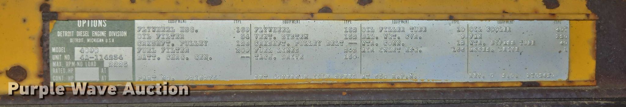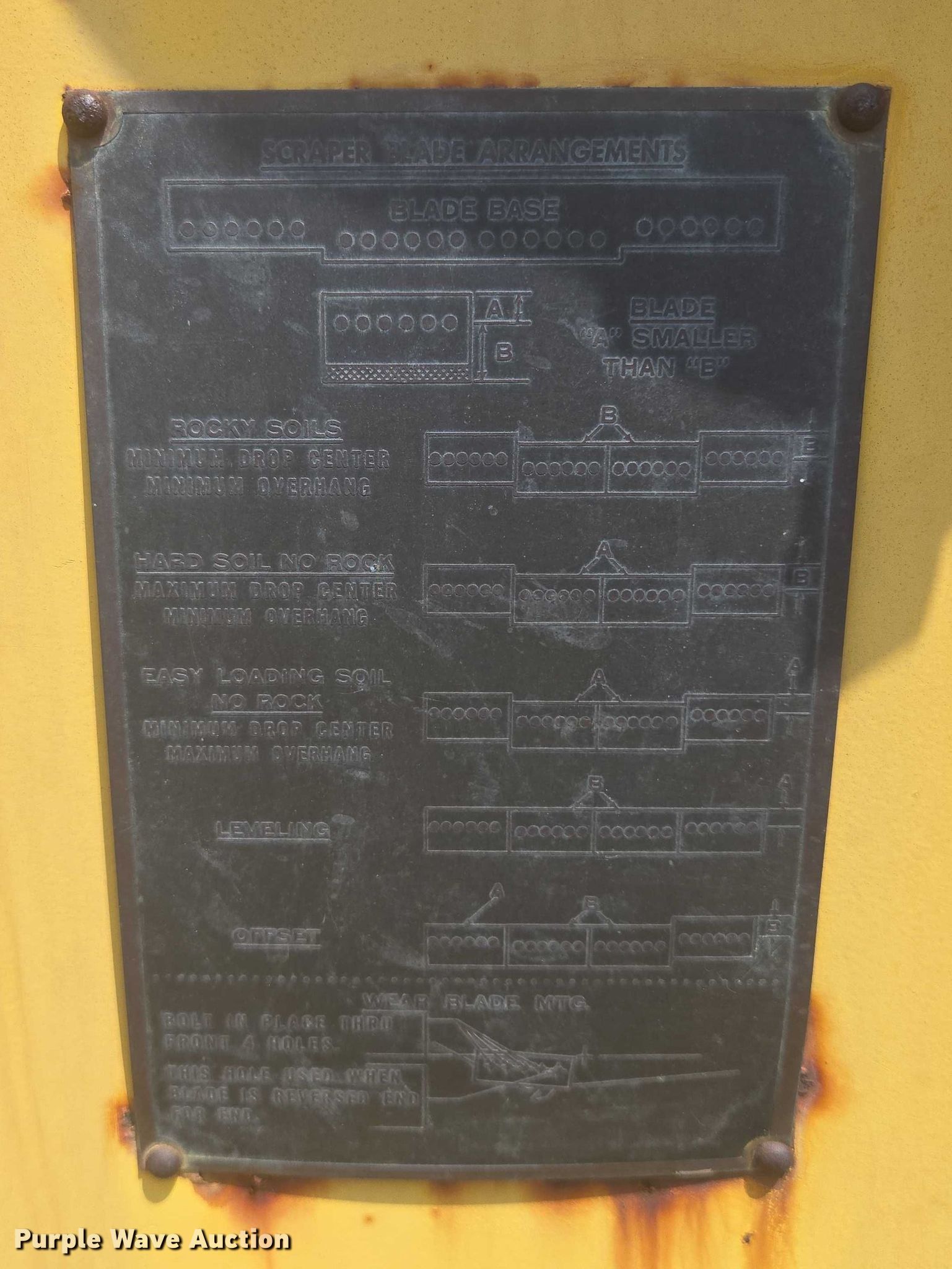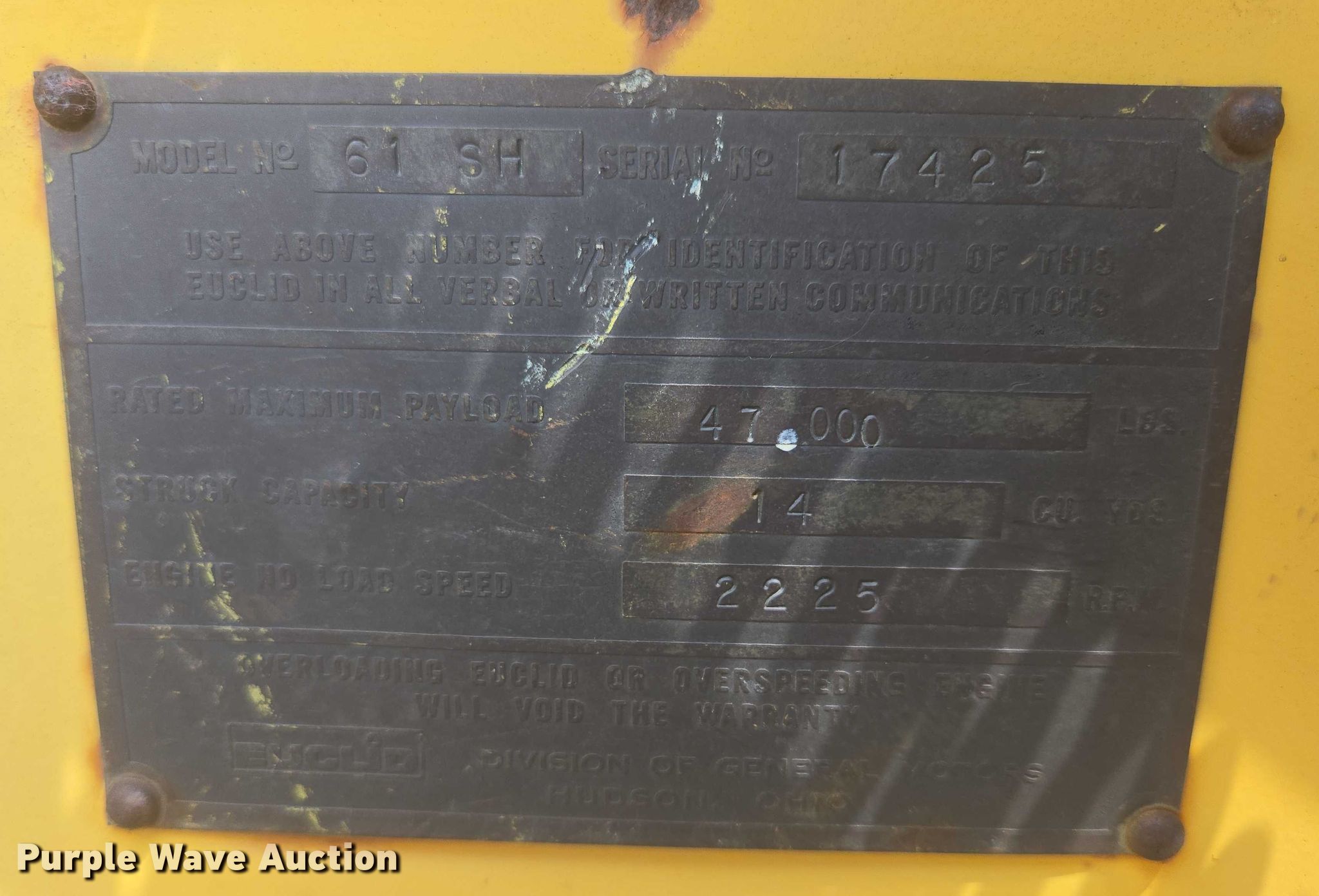 1965 Euclid TS-14 scraper. Hours: 1,766 on meter, Serial: 39702. Engine Detroit Diesel, Cylinders: 4, Fuel type: Diesel. Second engine Detroit Diesel, Cylinders: 4, Fuel type: Diesel. Transmission Powershift, 4F - 2R. Chassis Brakes: Air. Operators station OROPS. Features Bowl capacity: 14 cu.yd., Cable lift, Scraper controls: Lever controls No. of controls: 3, Rear push block. Tires Size: 29.5-25. Notes Additional parts included, Possible secondary engine issues, injectors need replaced. Codington County, SD. Watertown, SD 57201