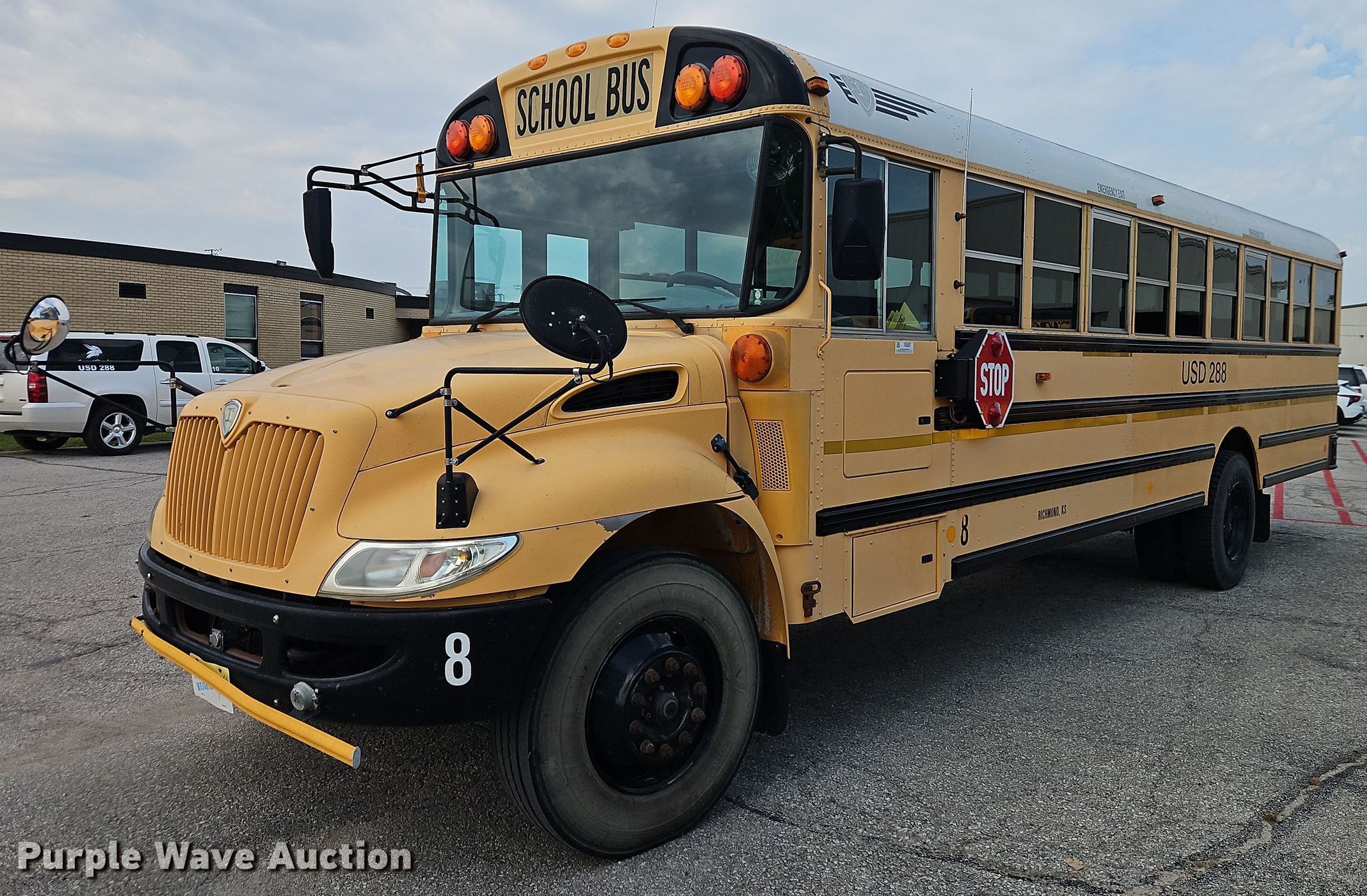 2009 IC Corporation PB10500 school bus. Miles: 128,665 on odometer, Hours: 6,143 on meter, VIN: 4DRBUSKP29A090242. Engine International MaxxForce, Displacement: 6.4L, Cylinders: 6, Fuel type: Diesel. Transmission Automatic. Chassis Axles: Single, Suspension: Spring, Brakes: Hydraulic, GVWR: 27,500 lbs. Interior Heat, Heated mirrors, Cruise control, Auxiliary controls, Passengers: 53. Tires Size: 11R22.5. Notes Dash warning indicator: High exhaust temperature, Windshield chipped or cracked. Kansas title. Title distribution may be delayed up to 14 days from verification of funds. Central Heights Unified School District #288. Richmond, KS 66080