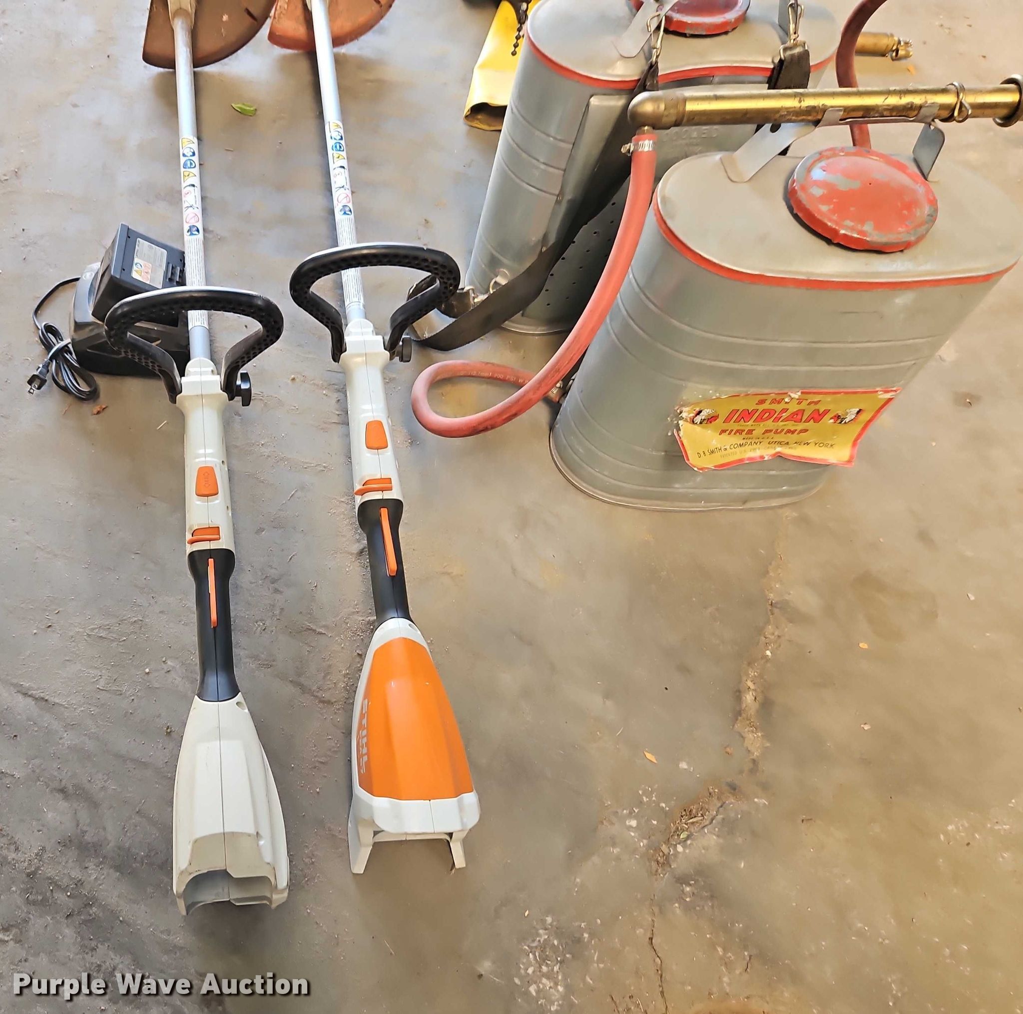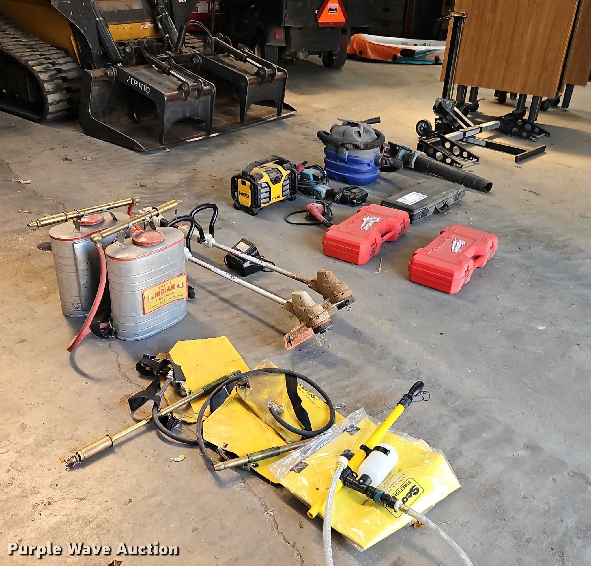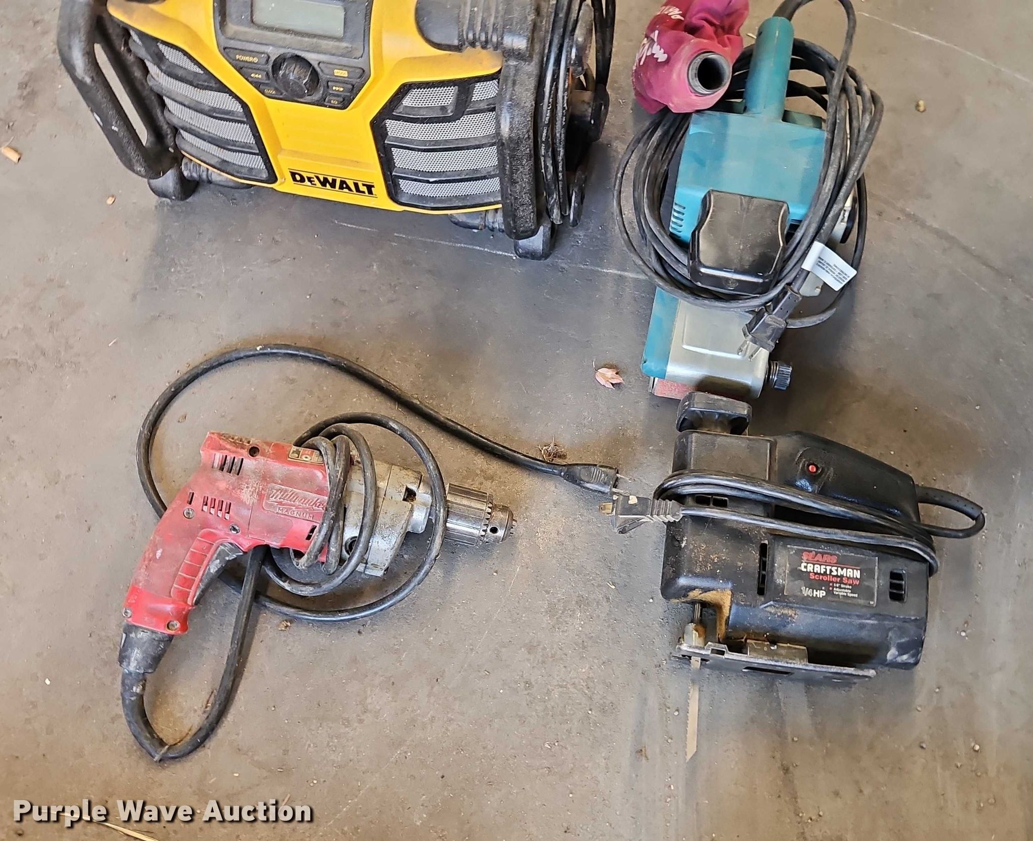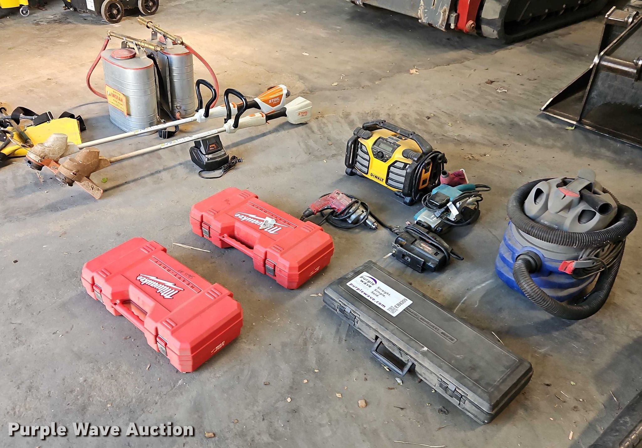 Purple Wave is selling a used Tools in Kansas. This item is a Tools with the following: (2) Milwaukee reciprocating saws, Milwaukee drill, Craftsman reciprocating saw, Craftsman jigsaw, Makita belt sander, DeWalt jobsite radio, (2) Stihl cordless string trimmers, EGo cordless leaf blower, Zero turn mower jack, (2) folding tables, (2) Smith Indian fire pumps