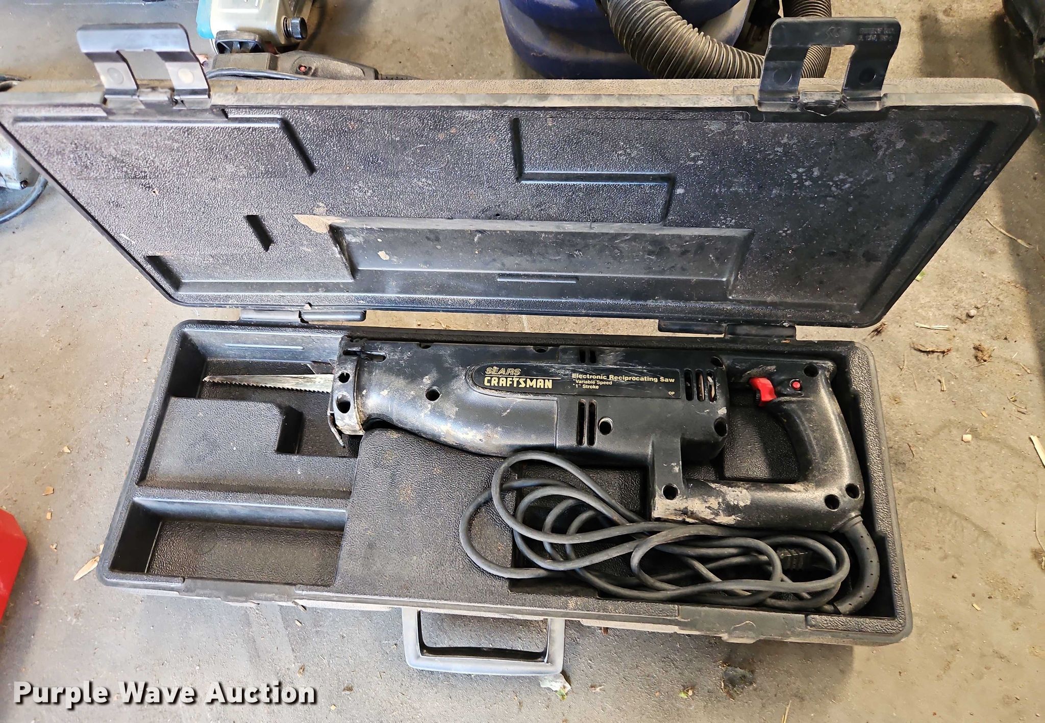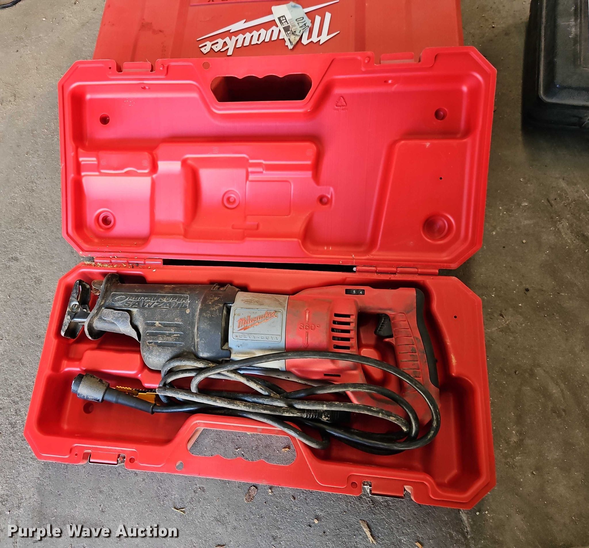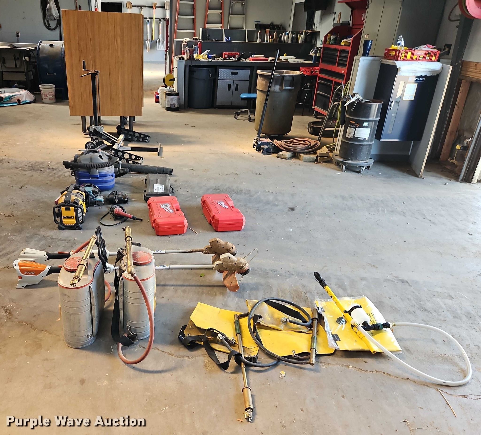 Purple Wave is selling a used Tools in Kansas. This item is a Tools with the following: (2) Milwaukee reciprocating saws, Milwaukee drill, Craftsman reciprocating saw, Craftsman jigsaw, Makita belt sander, DeWalt jobsite radio, (2) Stihl cordless string trimmers, EGo cordless leaf blower, Zero turn mower jack, (2) folding tables, (2) Smith Indian fire pumps