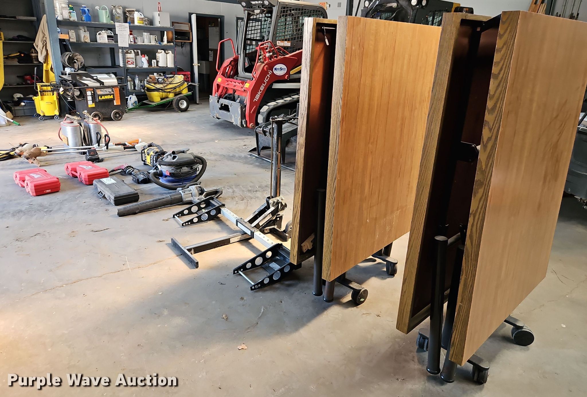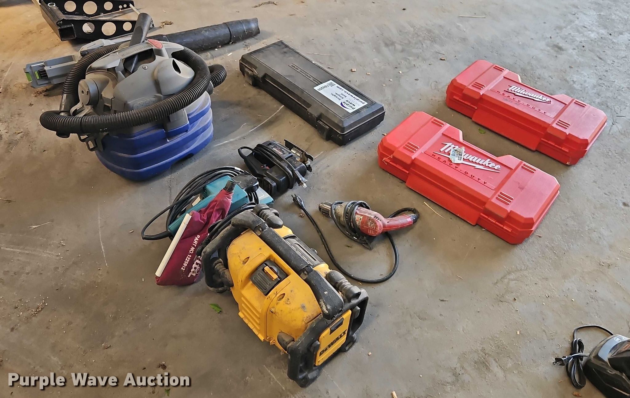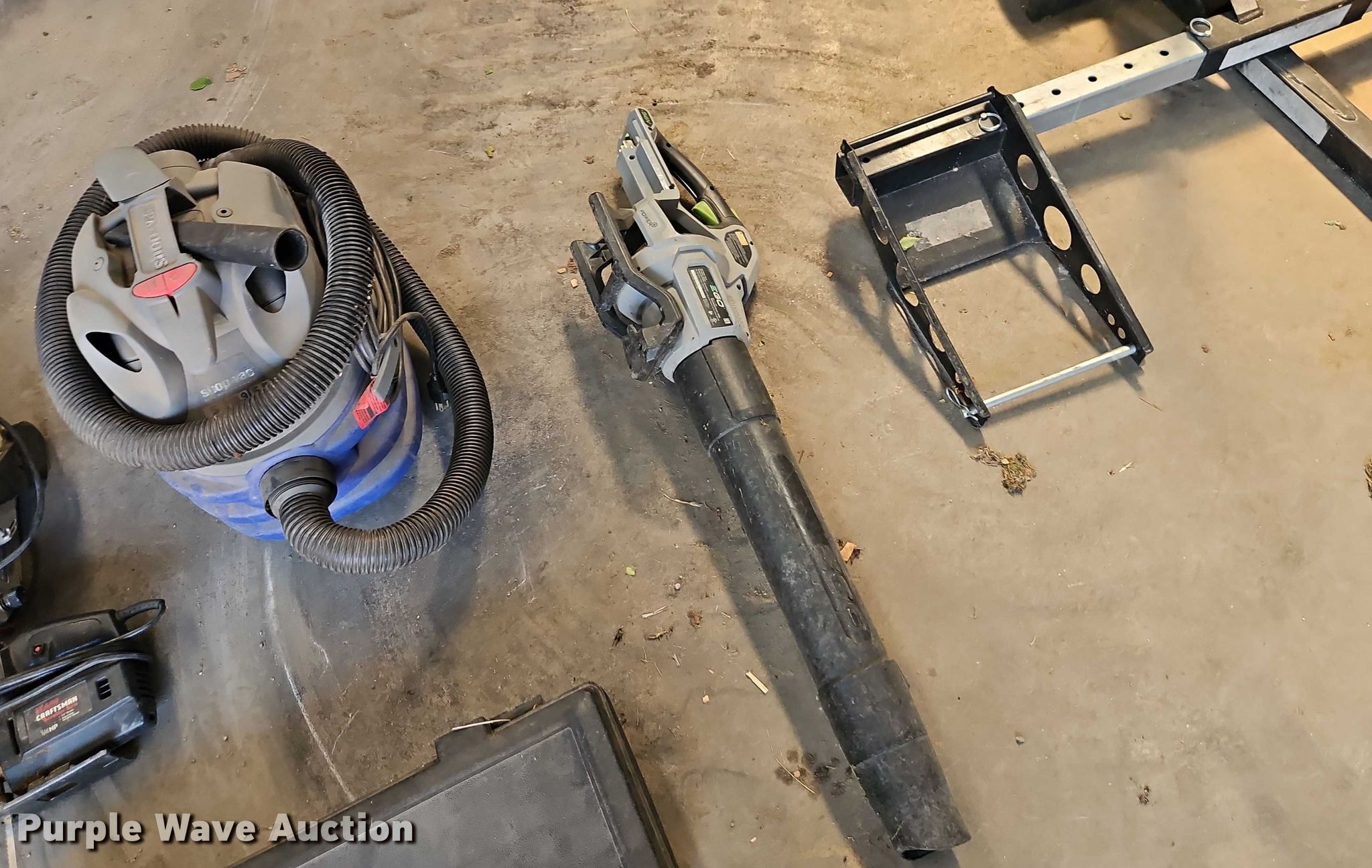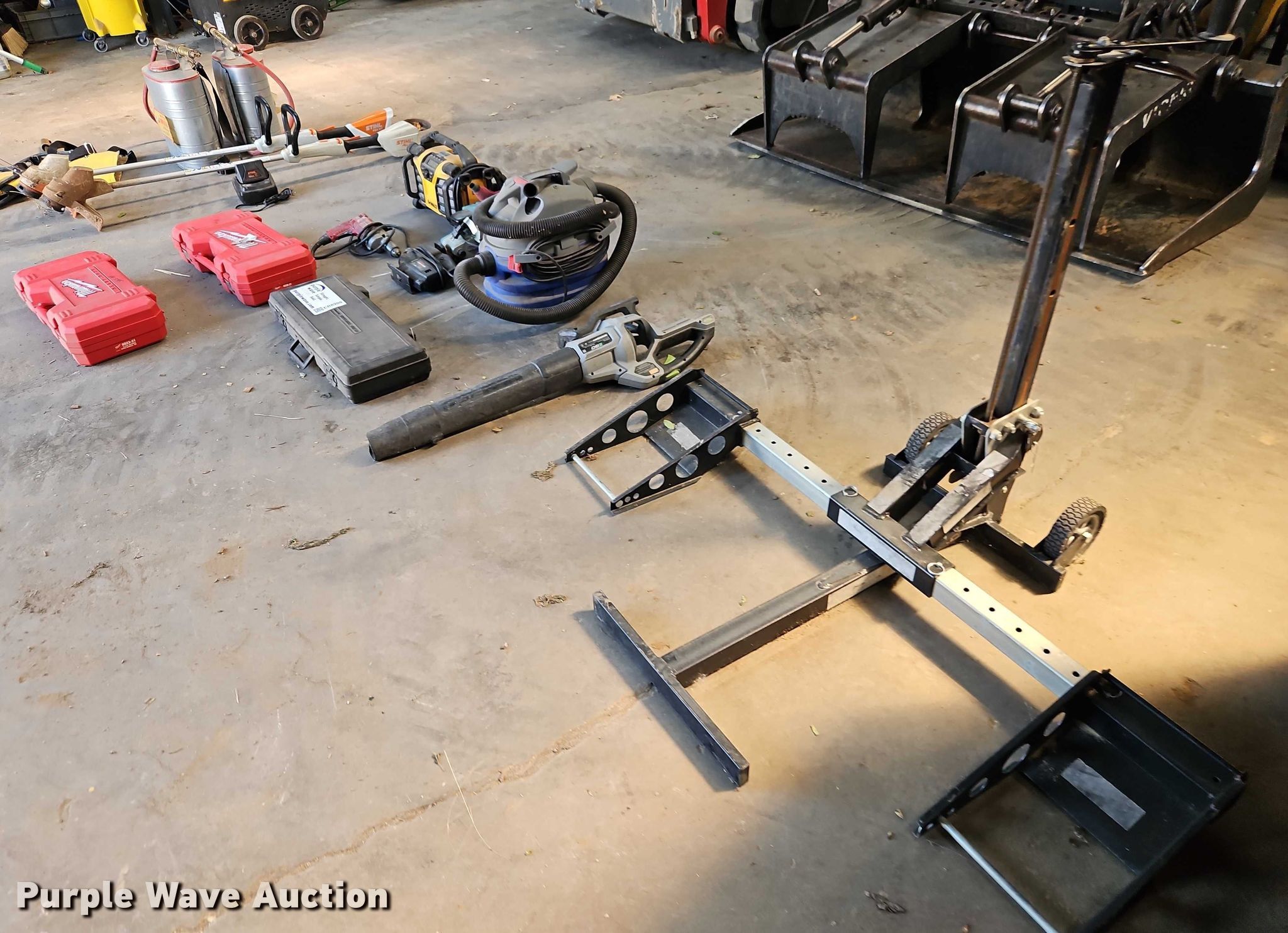 Purple Wave is selling a used Tools in Kansas. This item is a Tools with the following: (2) Milwaukee reciprocating saws, Milwaukee drill, Craftsman reciprocating saw, Craftsman jigsaw, Makita belt sander, DeWalt jobsite radio, (2) Stihl cordless string trimmers, EGo cordless leaf blower, Zero turn mower jack, (2) folding tables, (2) Smith Indian fire pumps