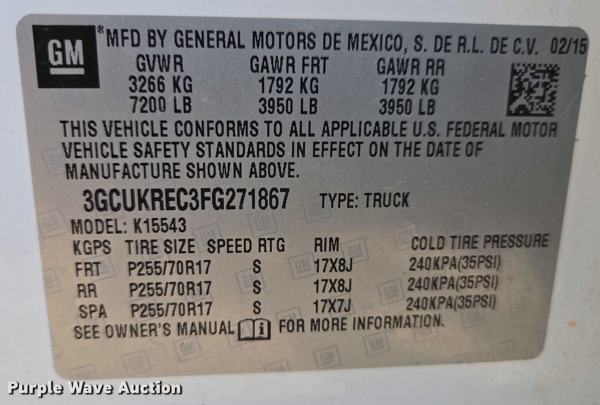 Purple Wave is selling a used 1/2 Ton Pickup or Van in Utah. This item is a 2015 Chevrolet Silverado 1500 Crew Cab pickup truck with the following: Miles: 114,818 on odometer, Hours: 8,564 on meter, VIN: 3GCUKREC3FG271867