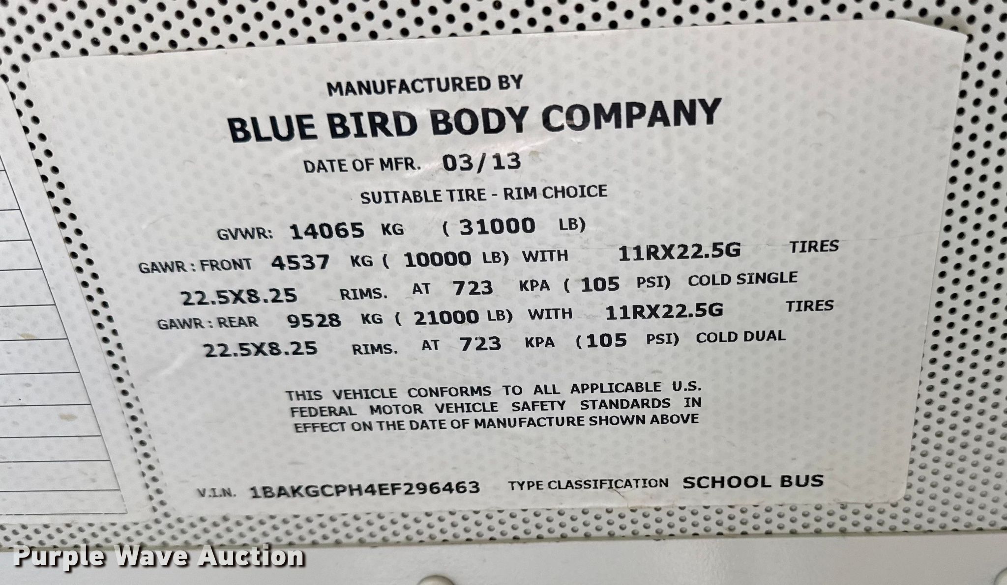 2014 Blue Bird Vision school bus. Miles: 109,879 on odometer, VIN: 1BAKGCPH4EF296463. Engine Cummins, Displacement: 6.7L, Cylinders: 6, Fuel type: Diesel. Transmission Automatic. Chassis Axles: Single, Suspension: Spring, Brakes: Hydraulic, GVWR: 31,000 lbs. Interior Heat, Passengers: 71. Tires Size: 11R22.5. Kansas title. Title distribution may be delayed up to 14 days from verification of funds. Garnett, KS 66032