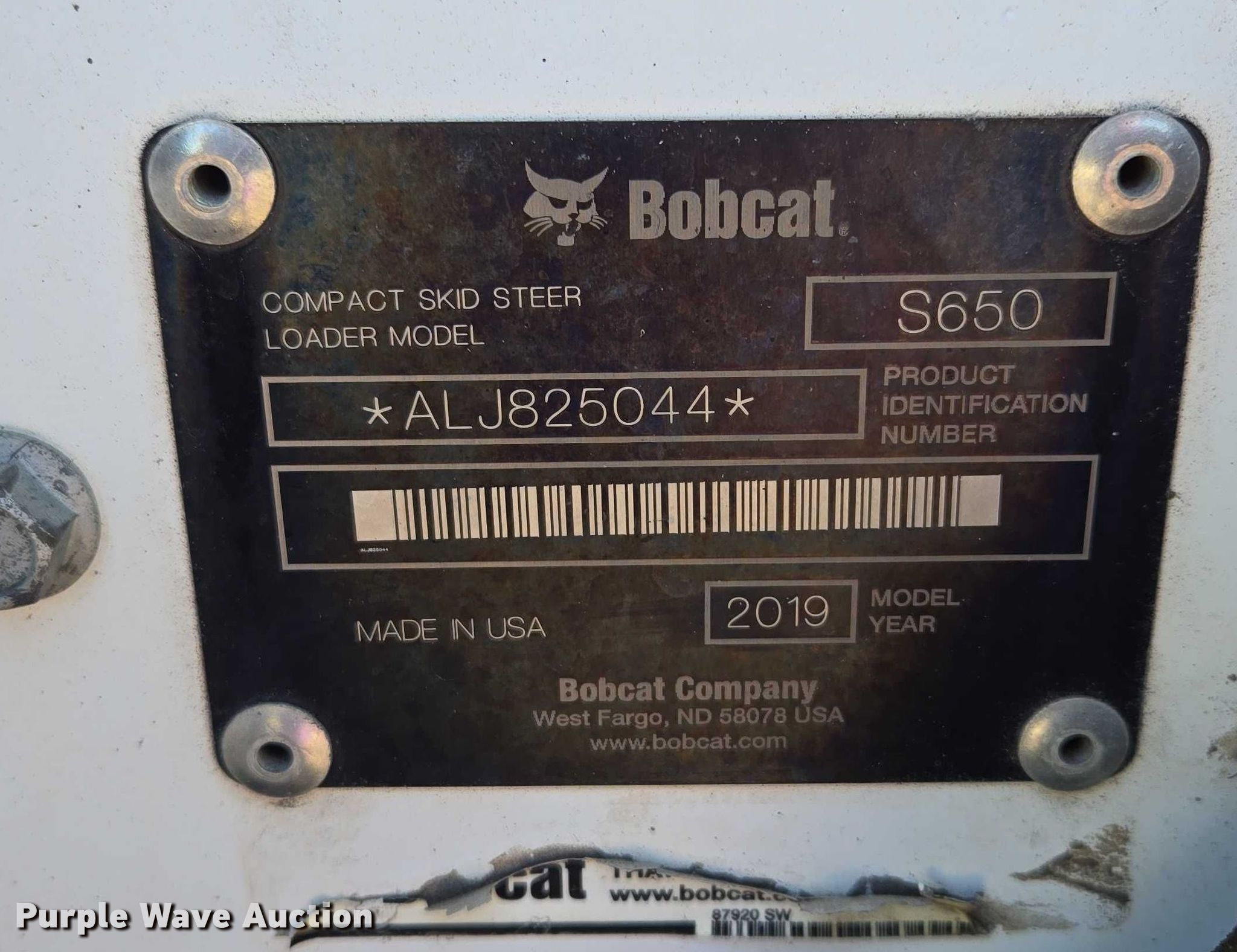 Purple Wave is selling a used Skid Steer Loader in Kansas. This item is a 2019 Bobcat S650 skid steer loader with the following: Serial: ALJ825044