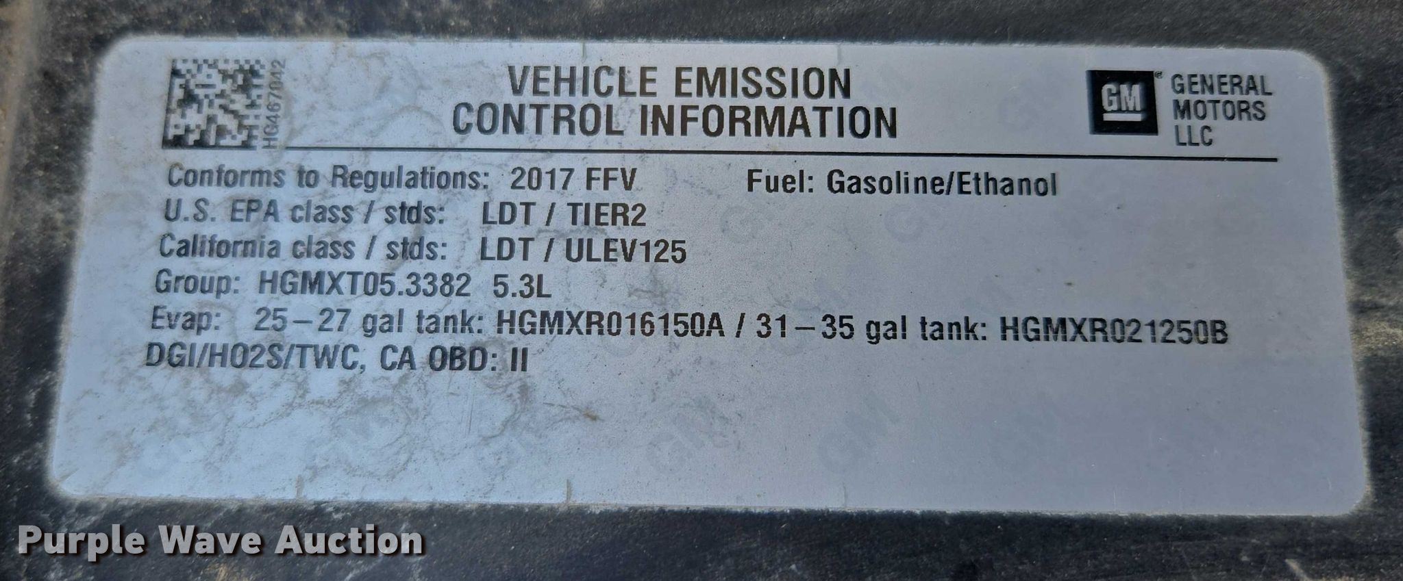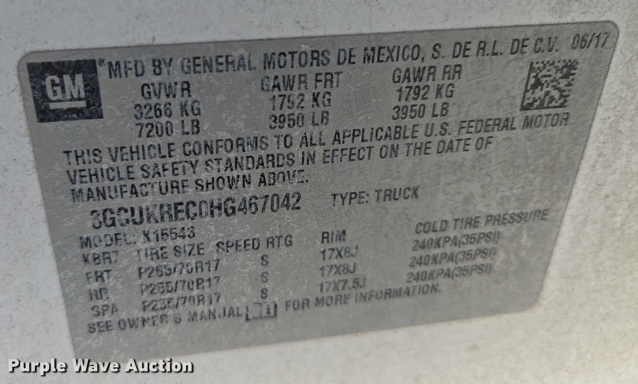 2017 Chevrolet Silverado 1500 Crew Cab pickup truck. Miles: 126,519 on odometer, VIN: 3GCUKREC0HG467042. Engine Displacement: 5.3L V8 OHV, Cylinders: 8, Fuel type: Gas. Transmission Automatic, Four wheel drive. Interior AC, Heat, Heated mirrors, Power windows, Power locks, Cruise control, Backup camera, Brake controller. Tires Size: 255/70R17. Notes Hail damage, Jump start required during on-site data collection, Engine issues, misfire. Kansas title. Title distribution may be delayed up to 14 days from verification of funds. Kansas City Board of Public Utilities. Kansas City, KS 66102