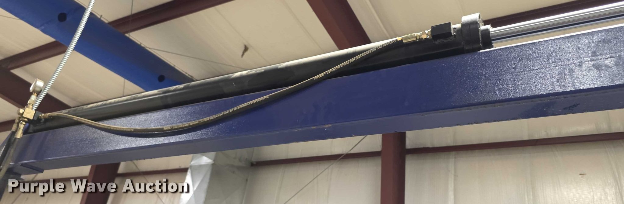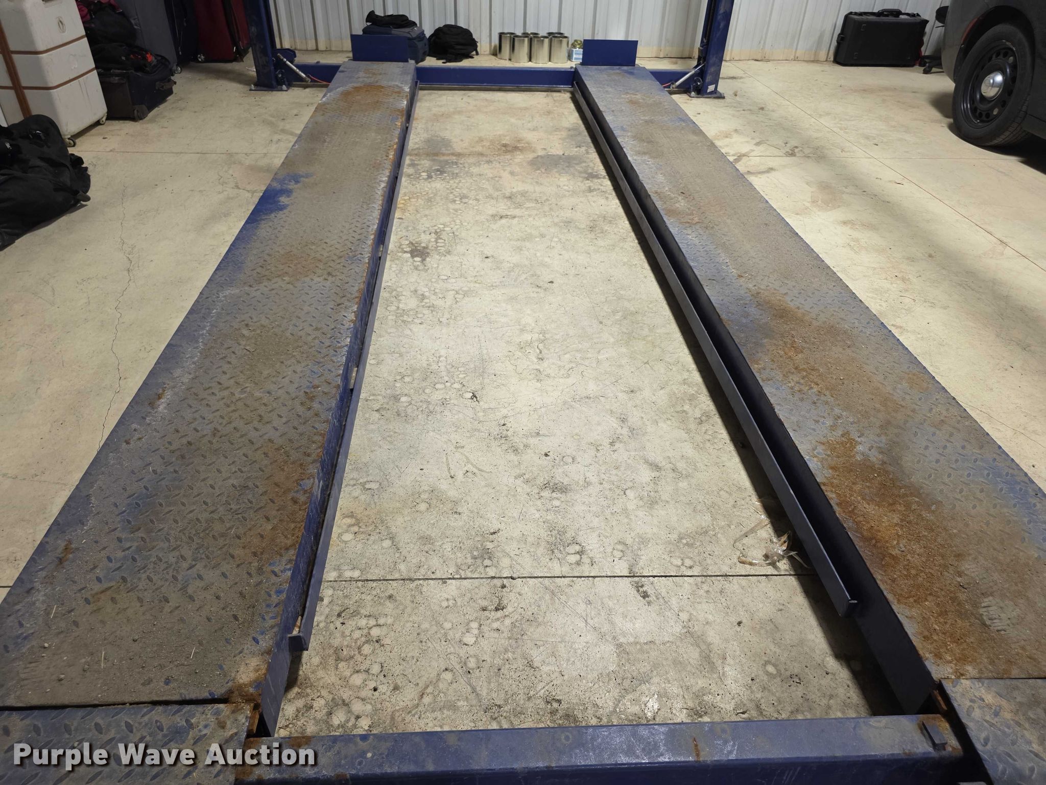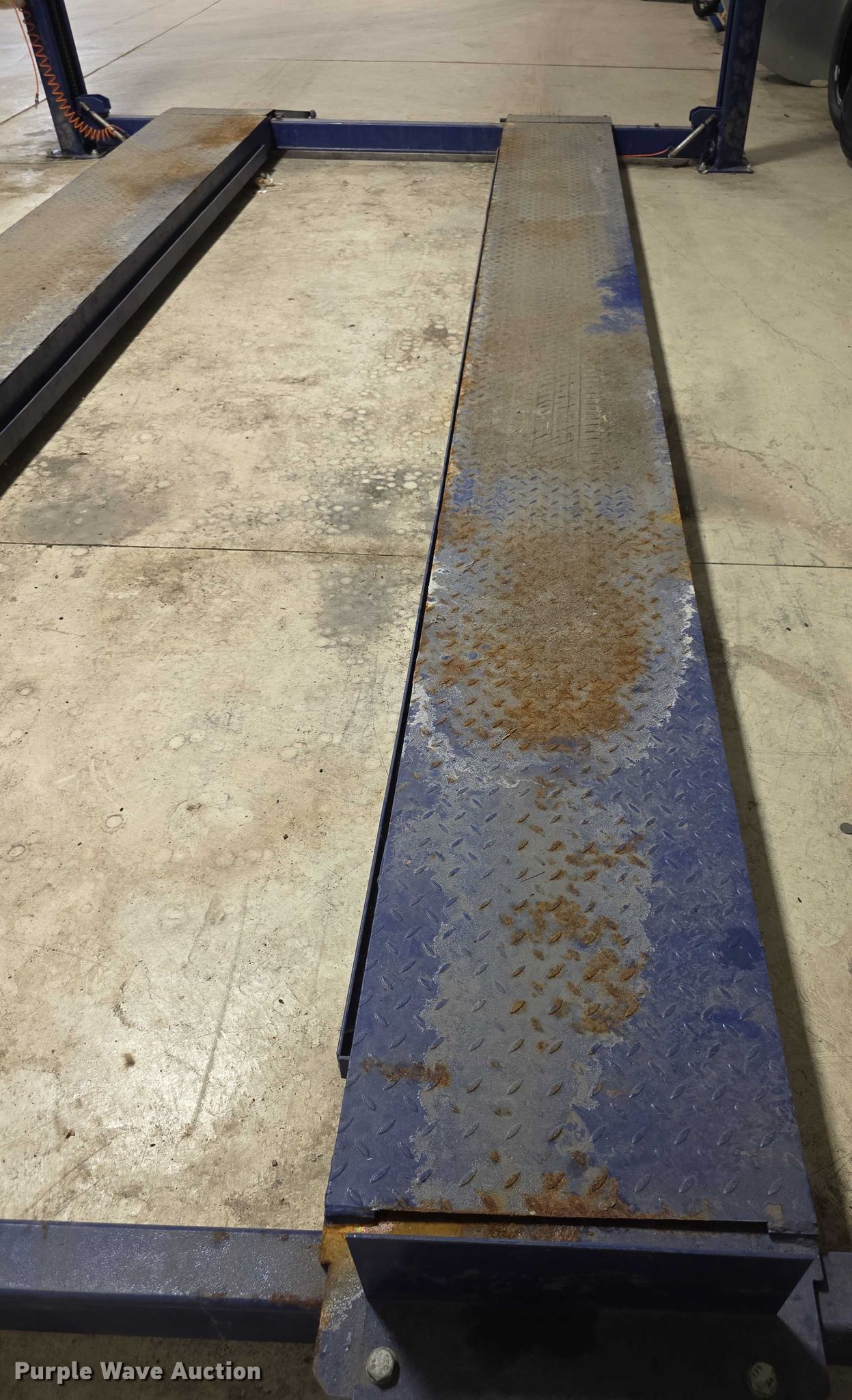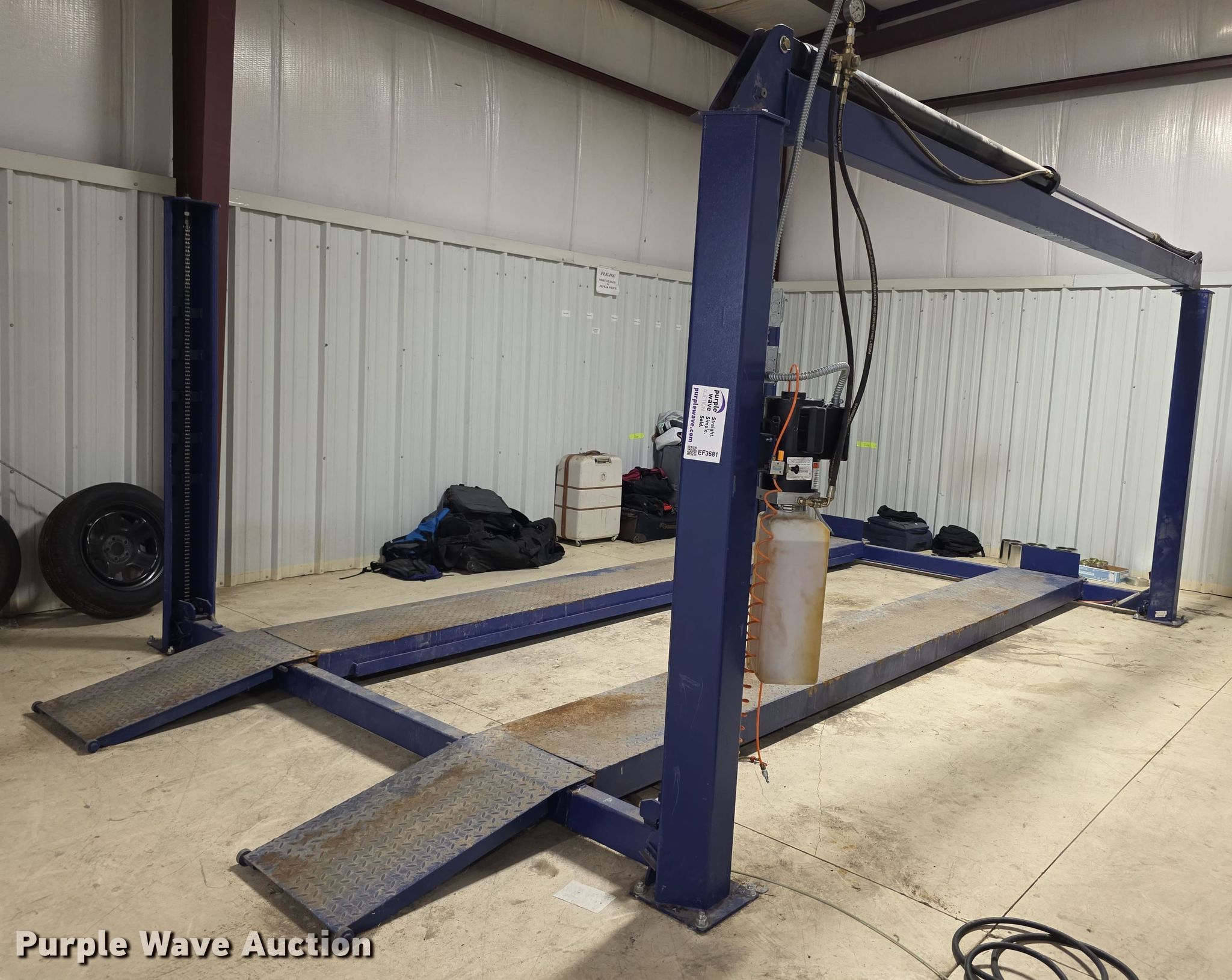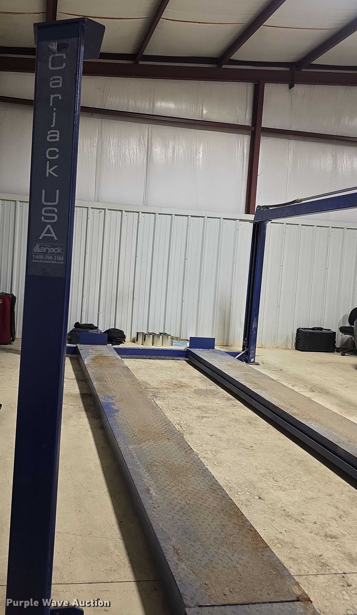 Purple Wave is selling a used Tools in Kansas. This item is a Carjack USA four post automotive lift with the following: Dimensions: 20' L x 11' 6" W x 8' H, Monarch Hydraulics YCYN56821Q hydraulic pump