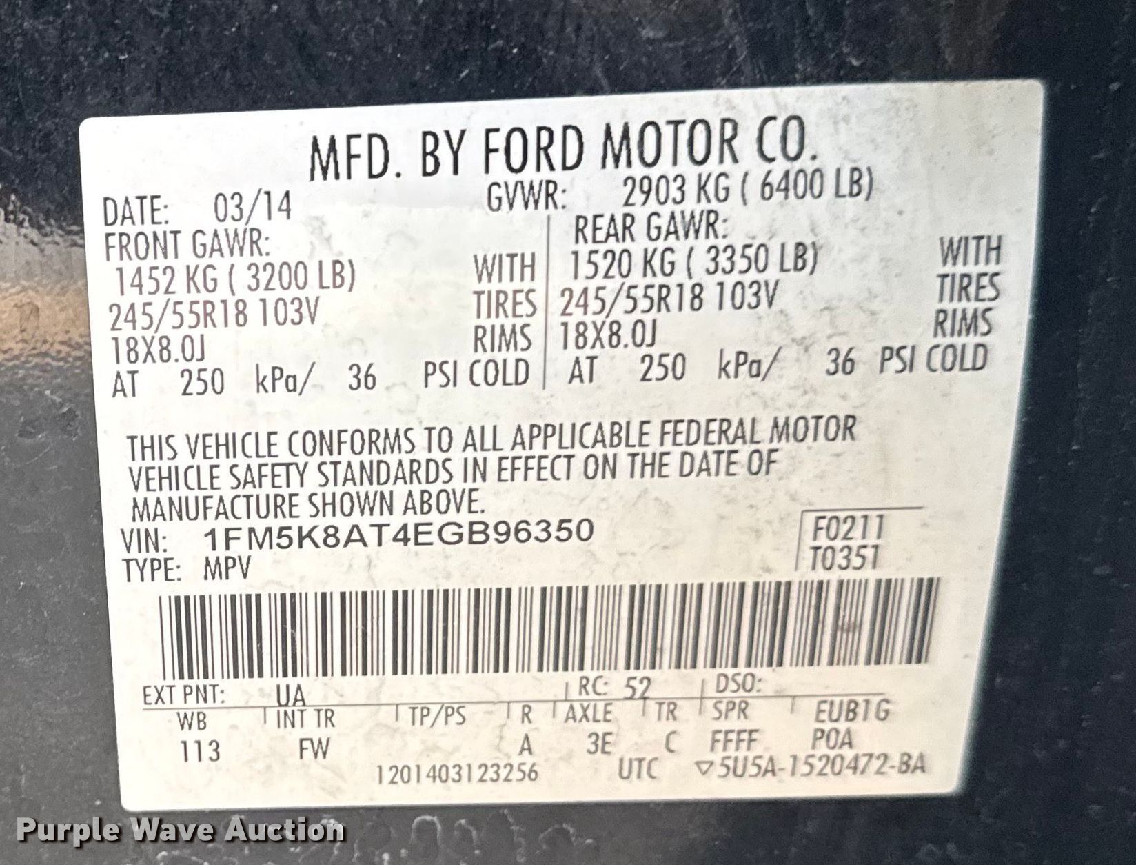- VIN: 1FM5K8AT4EGB96350