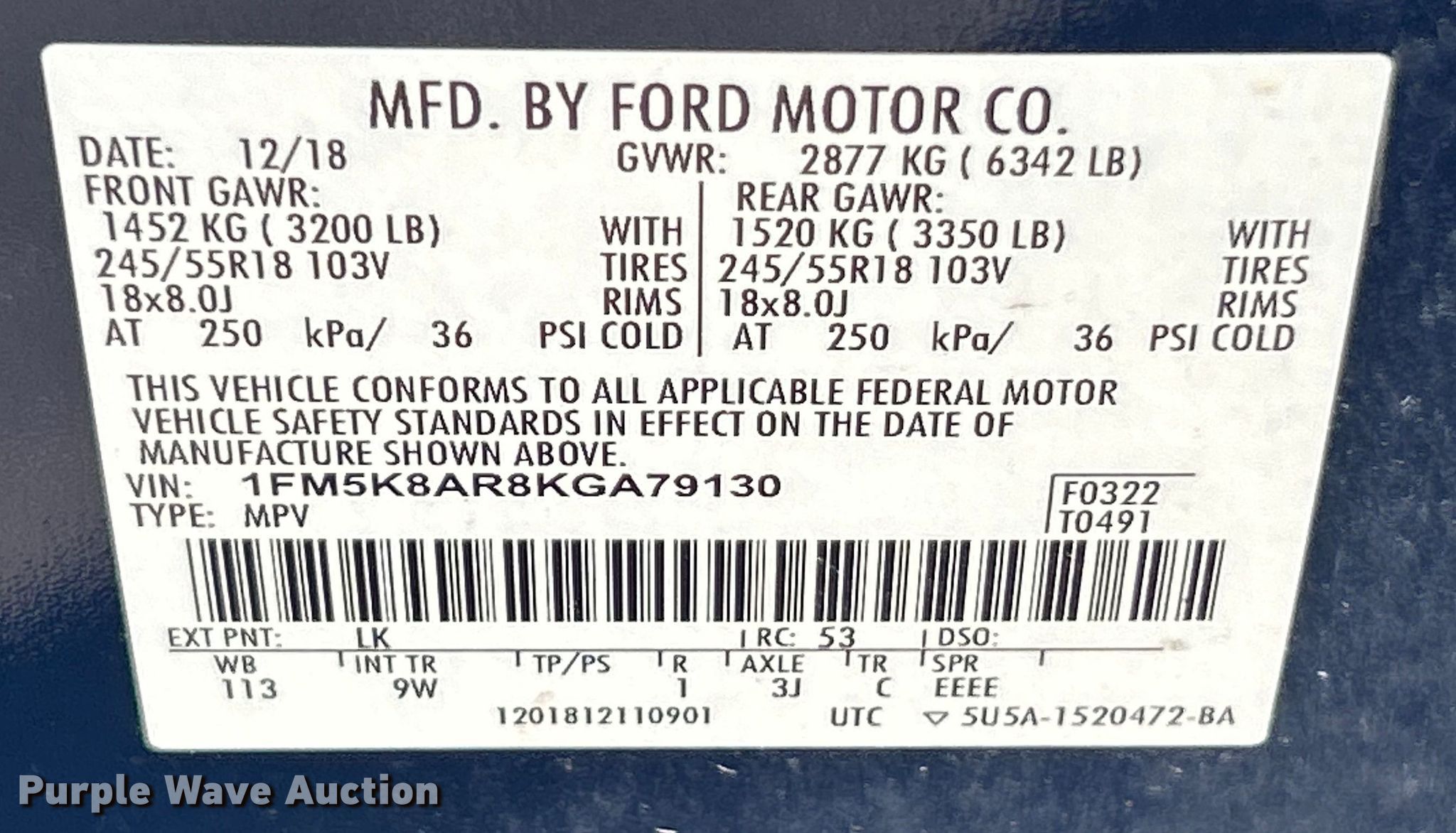 - VIN: 1FM5K8AR8KGA79130