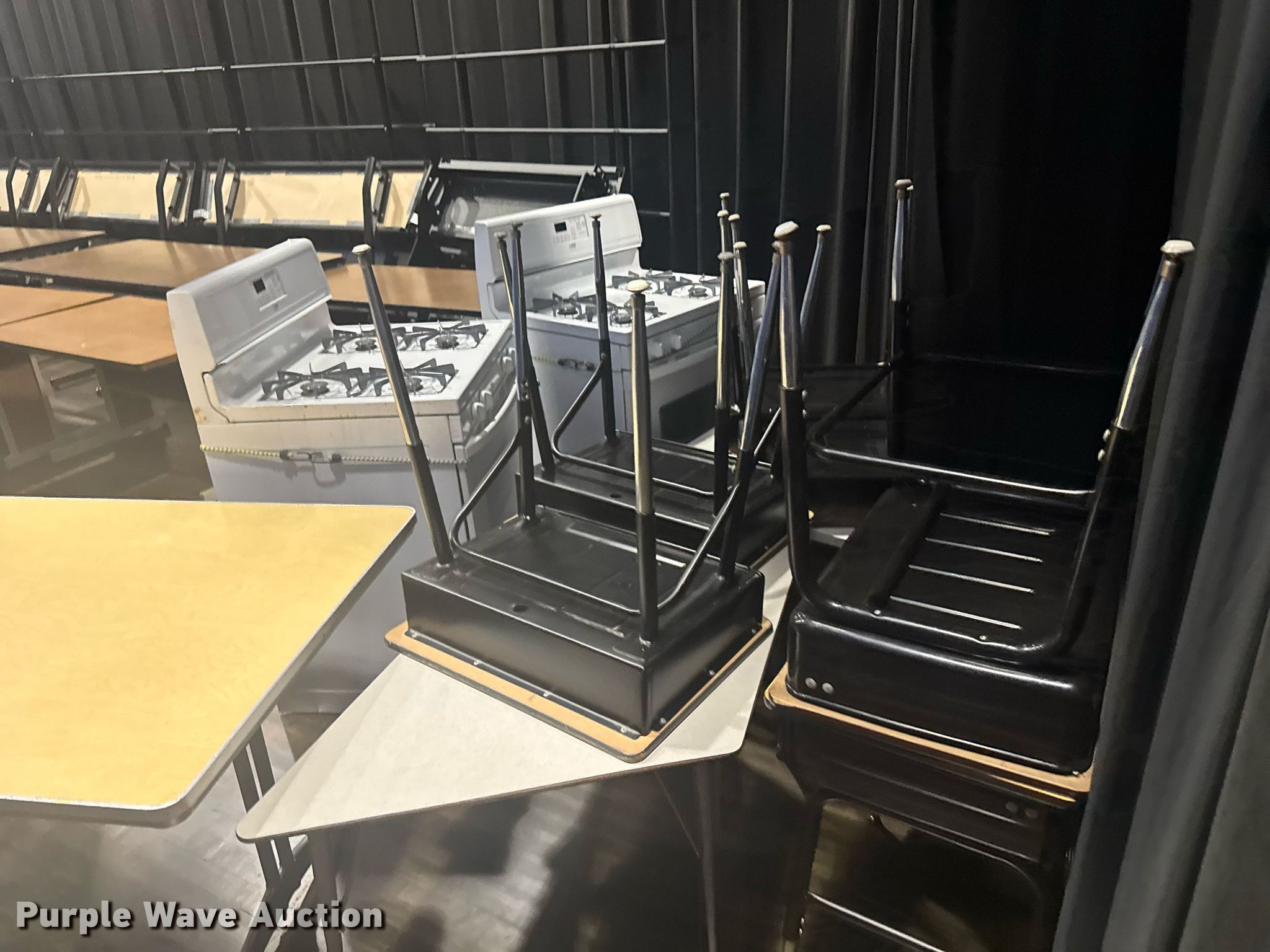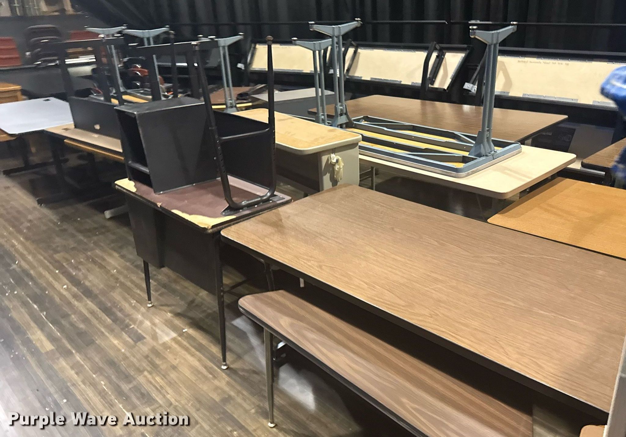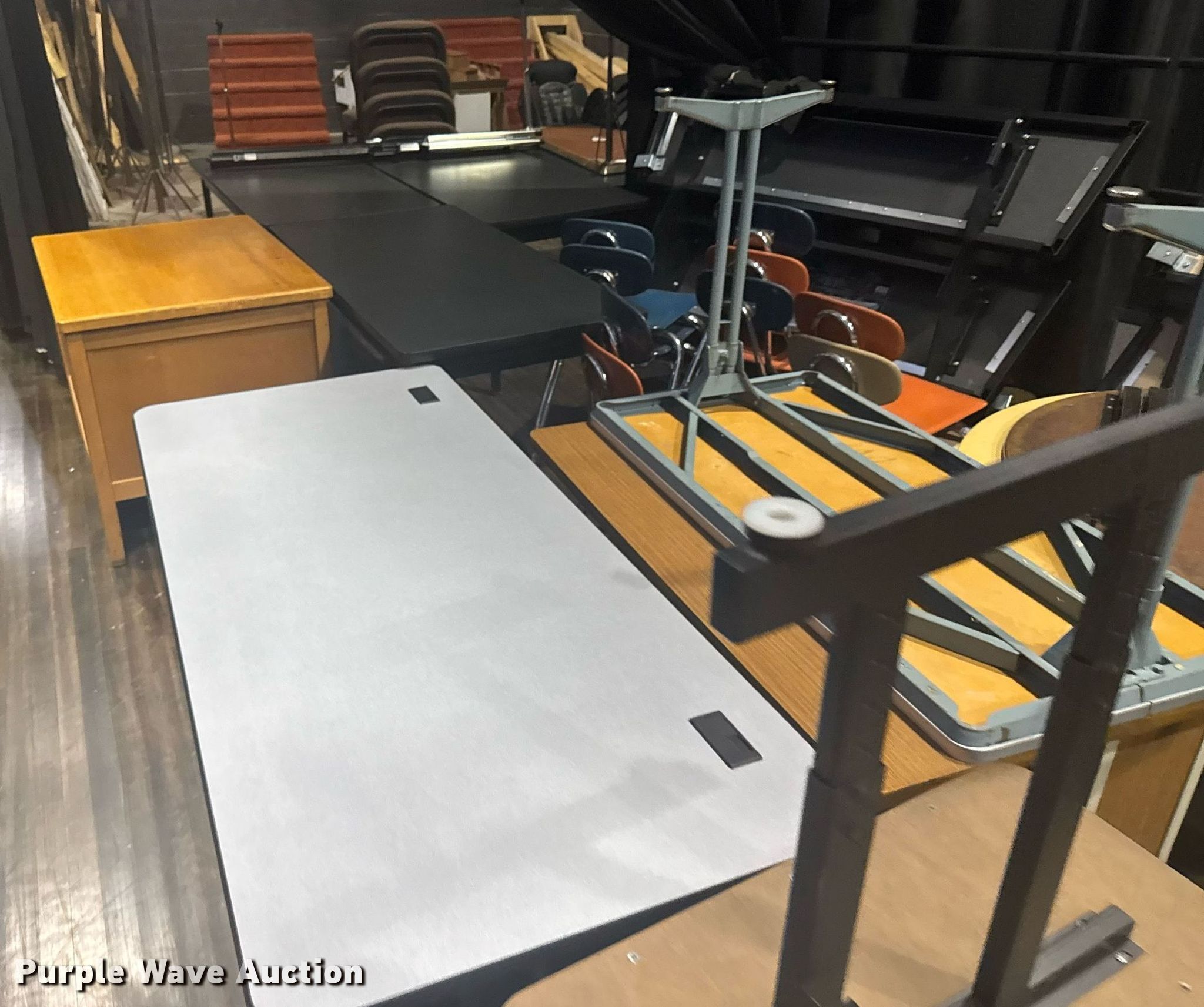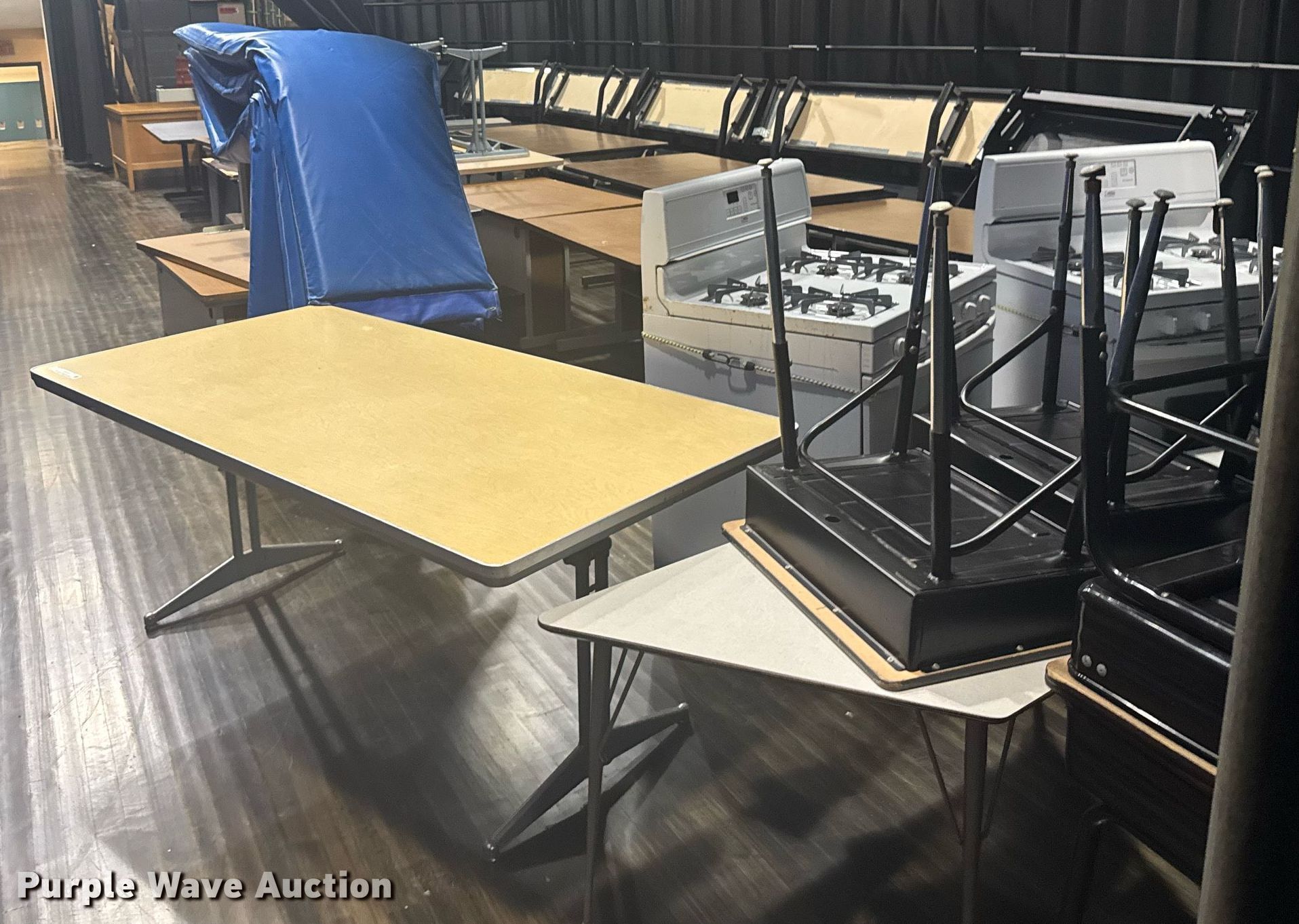 Purple Wave is selling a used Furniture in Nebraska. This item is a Furniture with the following: Tables: 20, Desks: 16, Chairs: 13, Filing cabinets: 1, (3) mats, (2) gas stoves, TV with stand, Computer cart