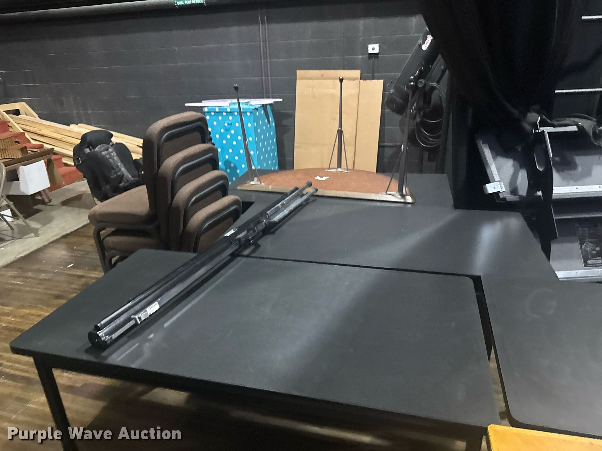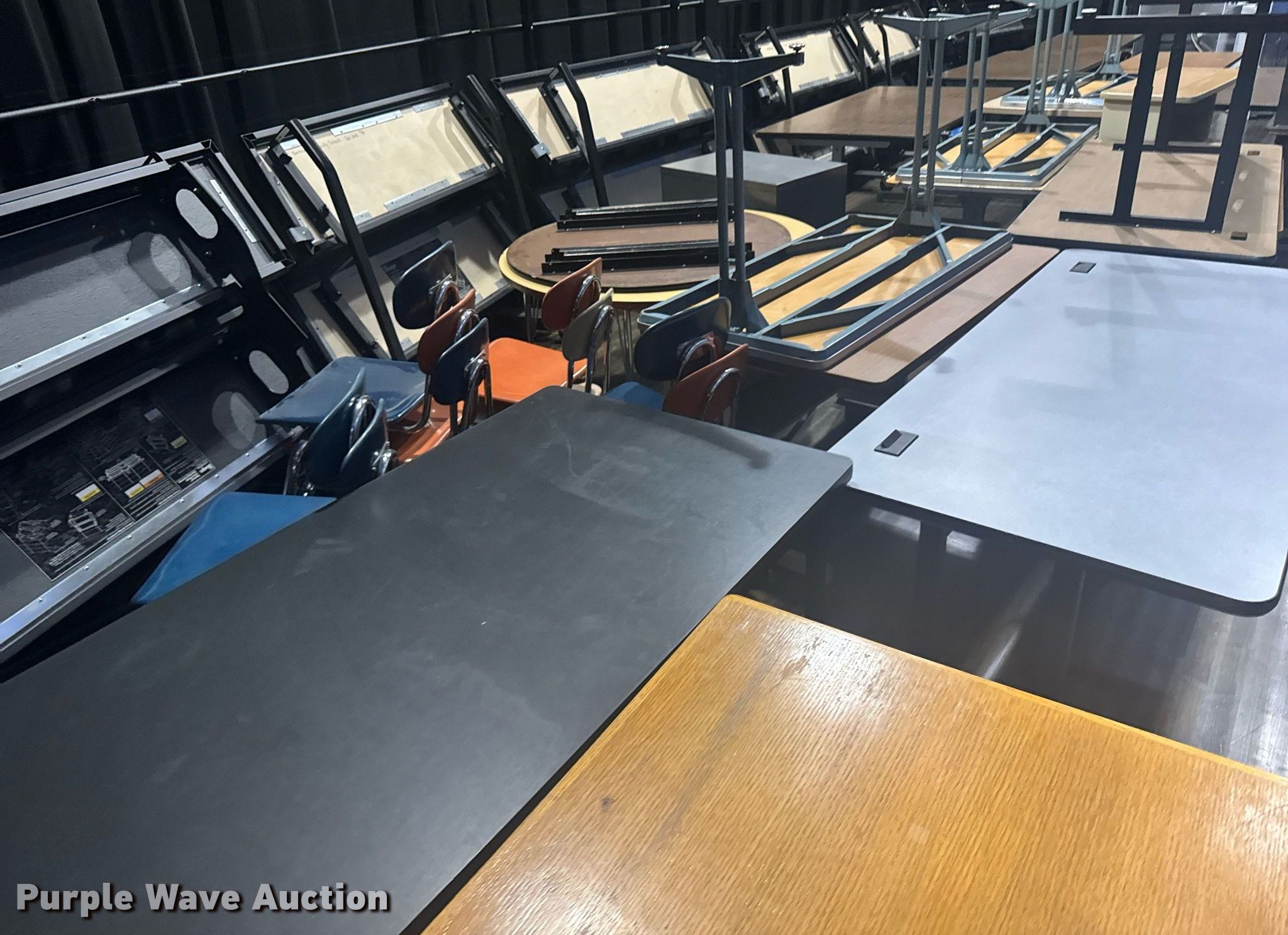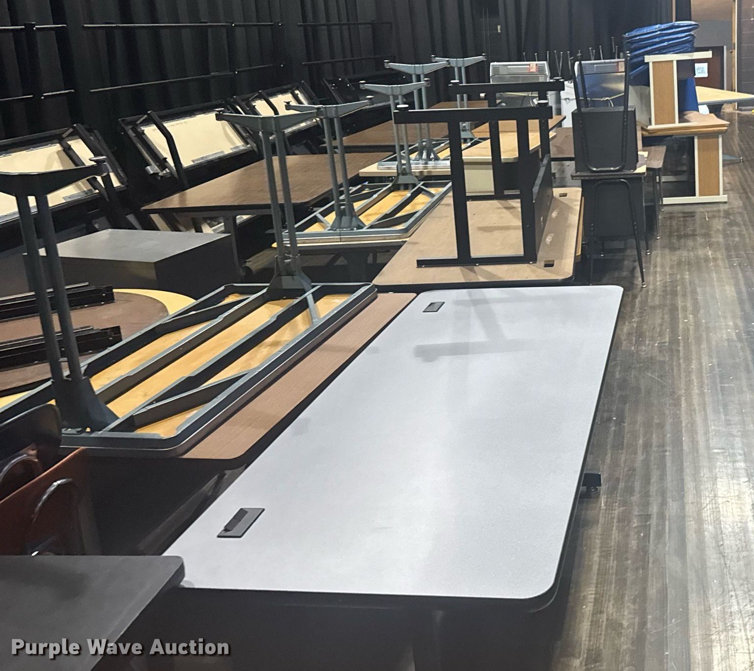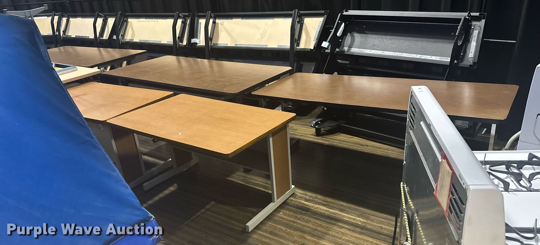 Purple Wave is selling a used Furniture in Nebraska. This item is a Furniture with the following: Tables: 20, Desks: 16, Chairs: 13, Filing cabinets: 1, (3) mats, (2) gas stoves, TV with stand, Computer cart
