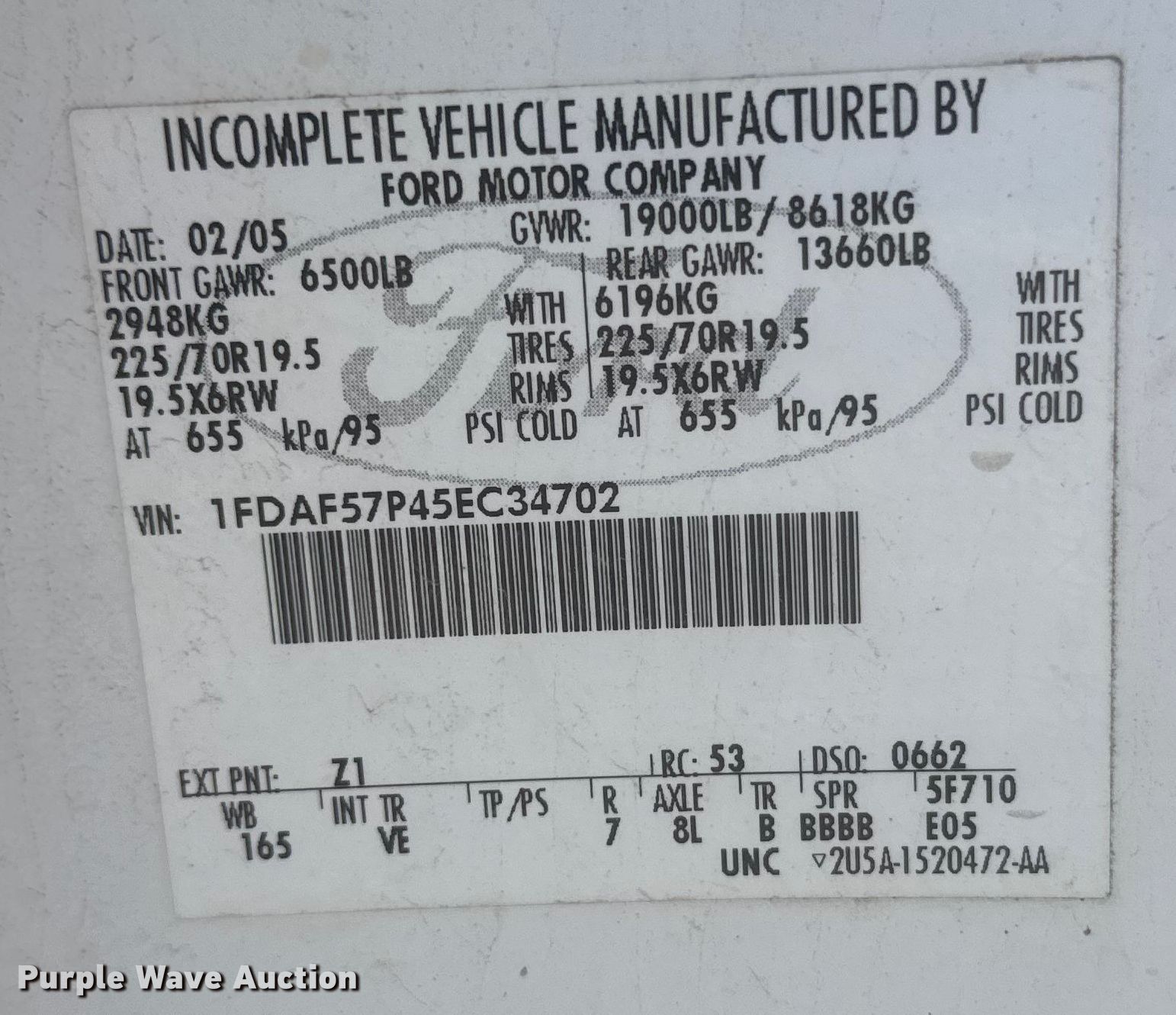 2005 Ford F550 truck cab and chassis. Miles: 227,295 on odometer, VIN: 1FDAF57P45EC34702. Engine Displacement: 6.0L, Cylinders: 8, Fuel type: Diesel, HP: 325. Transmission Automatic. Chassis Four wheel drive, Axles: Single, Suspension: Spring, Brakes: Hydraulic, Truck chassis: 11', GVWR: 19,000 lbs FAWR: 6,500 lbs, RAWR: 13,660 lbs. Interior AC, Heat. Tires Size: 225/70R19.5. Kansas title. Title distribution may be delayed up to 14 days from verification of funds. Saline County. Salina, KS 67401