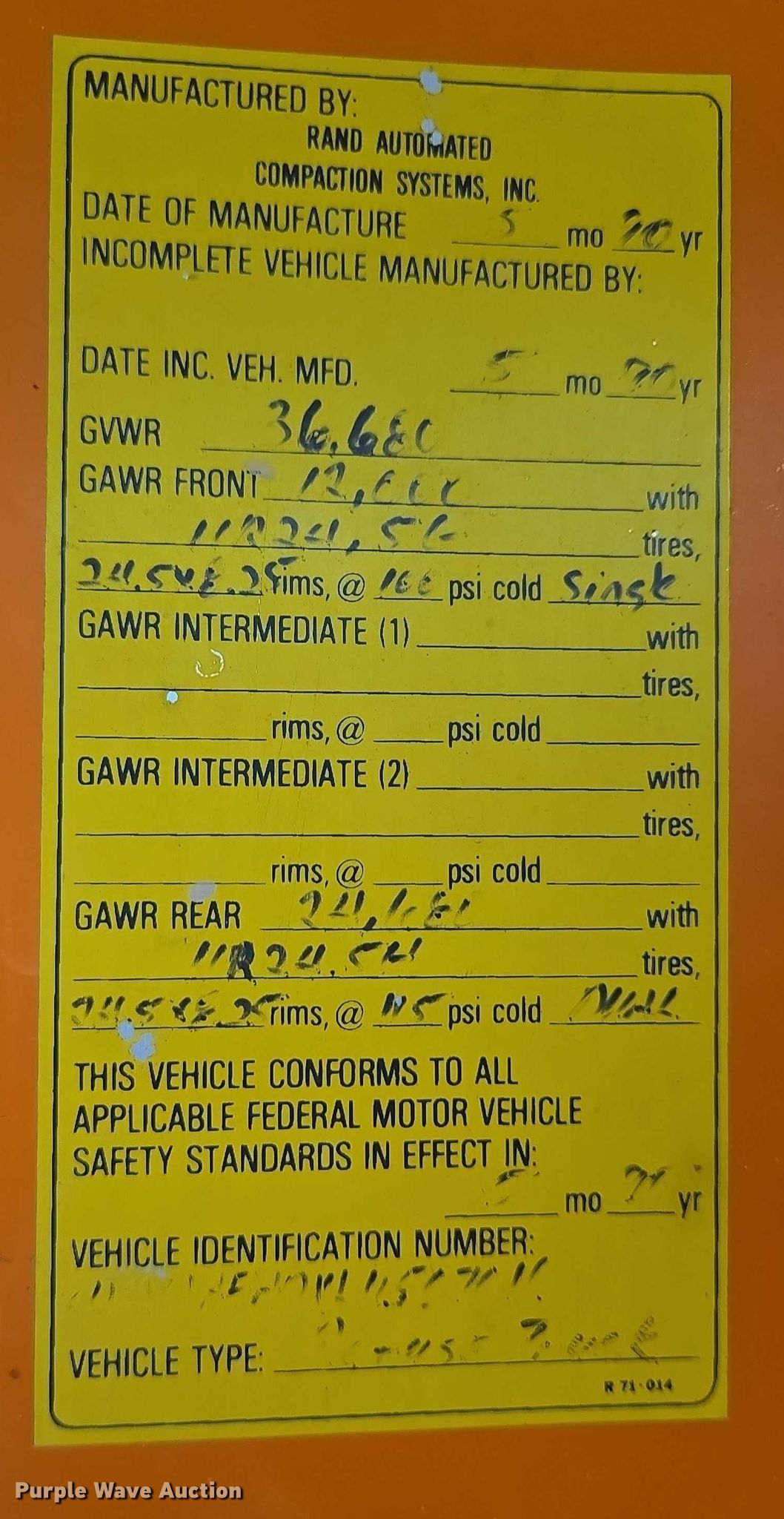 1990 White GMC Xpeditor refuse truck. Miles: 91,228 on odometer, Hours: 16,210 on meter, VIN: 4V2DAFADXLU507016. Engine Caterpillar 3208, Serial: 02Z63959, Cylinders: 8, Fuel type: Diesel, HP: 250. Transmission Automatic. Chassis Axles: Single, Suspension: Spring, Brakes: Air, PTO, GVWR: 36,680 lbs. Interior AC, Heat. Features Refuse bed Rand Champion RC20D, Serial: 1809-05-90HD1, Load: Side. Tires Size: 11R24.5. Notes Non-operational rear brakes , Unit must be towed or hauled, Hydraulic leaks, Service records available upon request to [email protected], Unknown operating condition. Wyoming title. Seller is a government entity who will be assigning and distributing the title. Please contact the seller for distribution questions. Title distribution may be delayed up to 14 days from verification of funds. City of Douglas, WY. Douglas, WY 82633