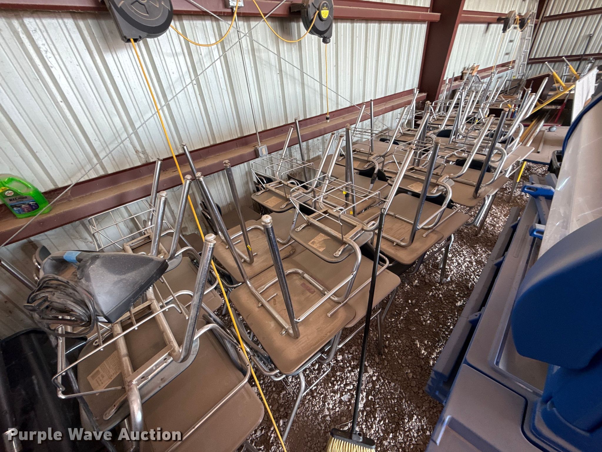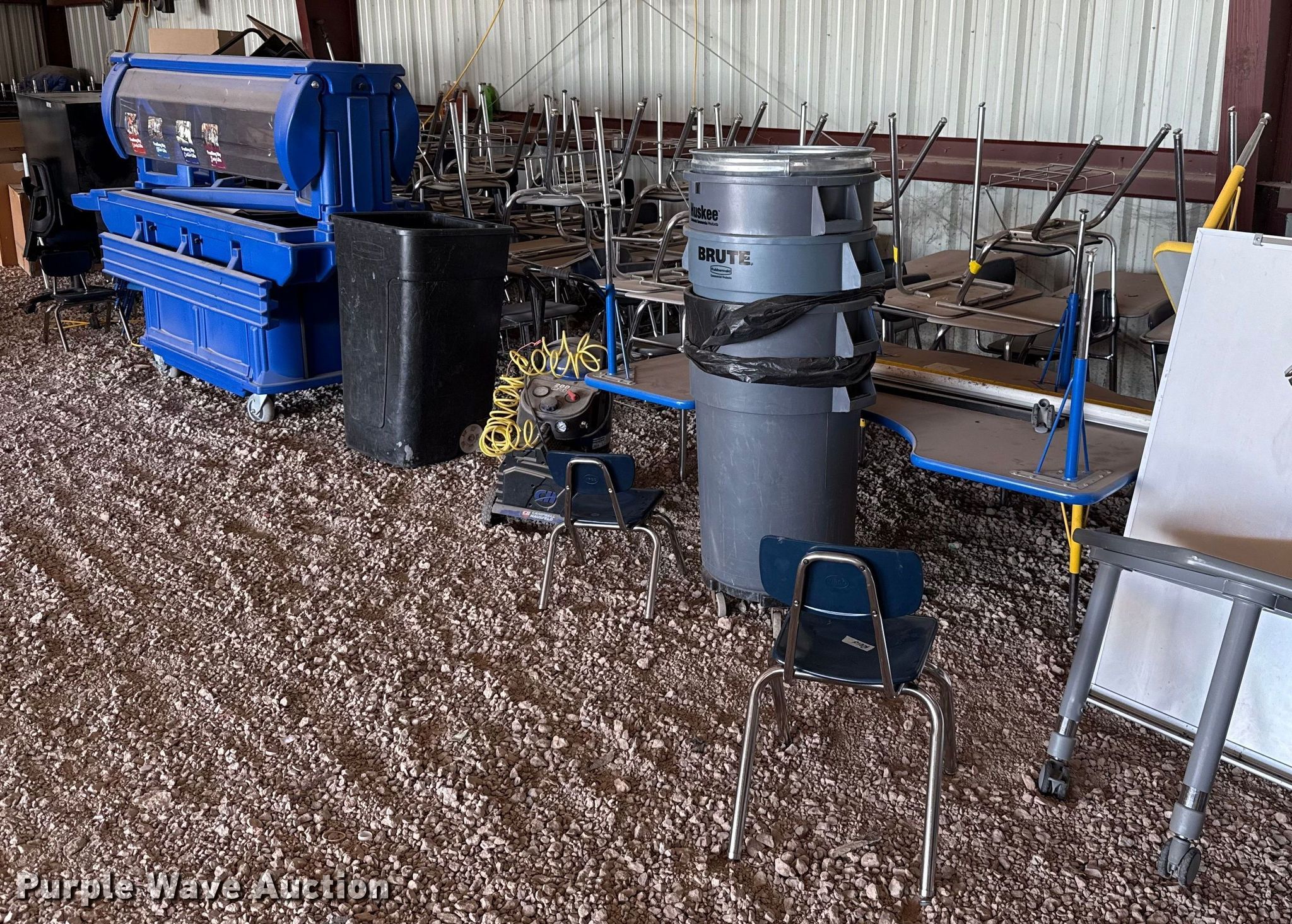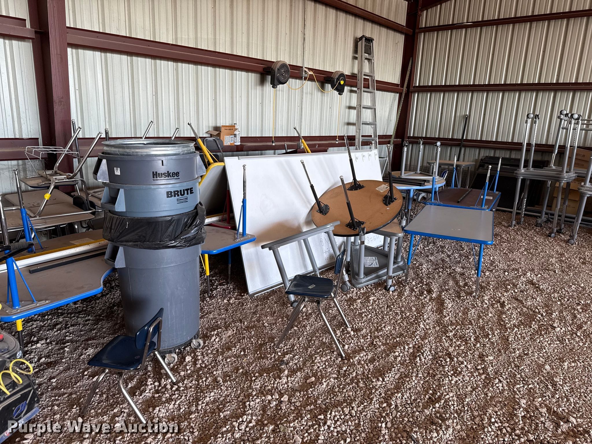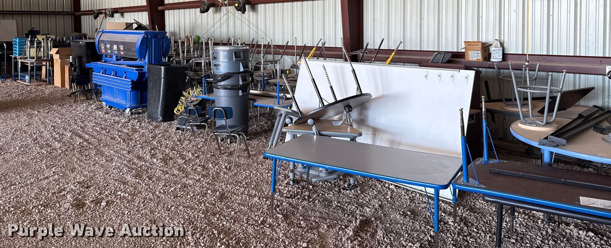 Purple Wave is selling a used Furniture in Oklahoma. This item is a Furniture with the following: Chairs: 50, Desks: 86, Filing cabinets: 1, Lockers: 9, Tables: 13, (5) trash cans, (2) dry erase boards, Cafeteria lunch bar, Janitorial supplies, Campbell Hausfeld air compressor, Unknown operating condition, Generac Speed Wash pressure washer, Unknown operating condition