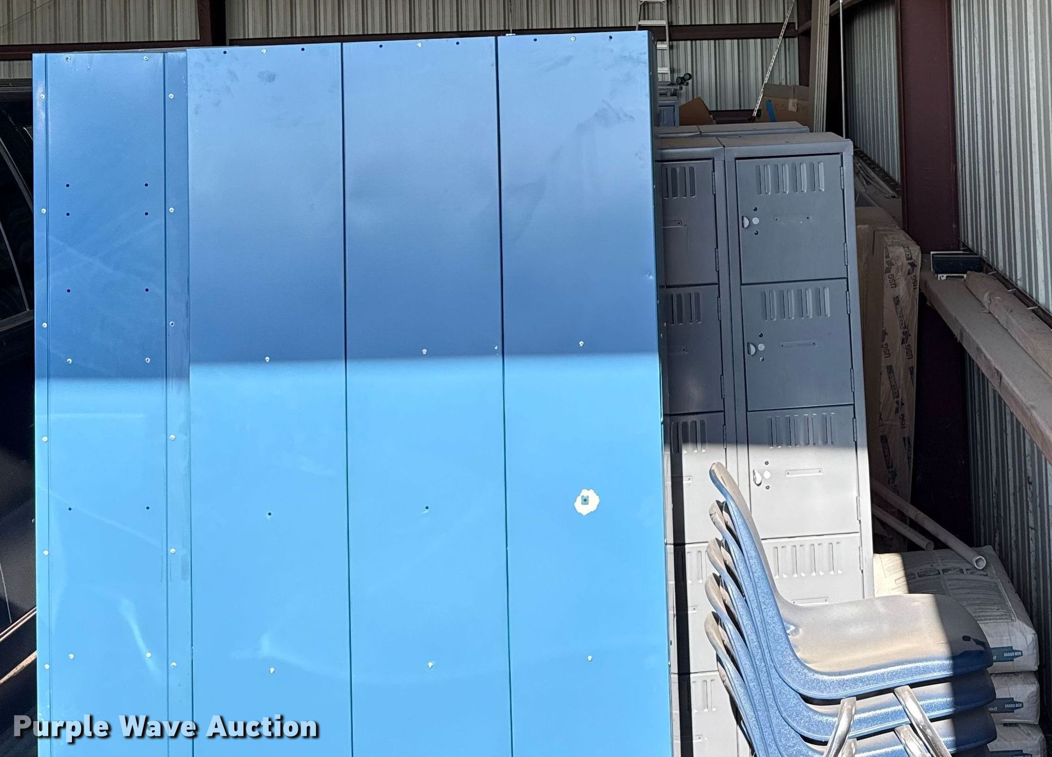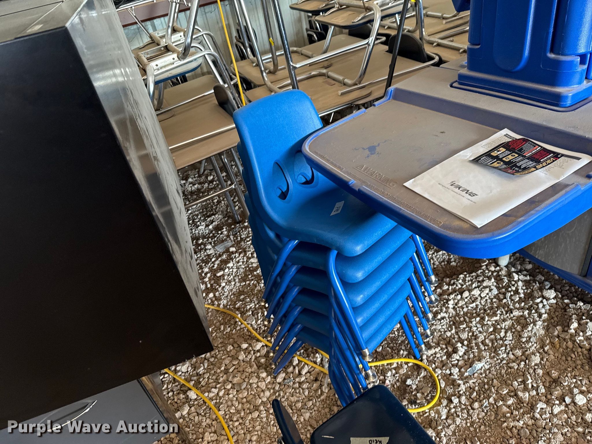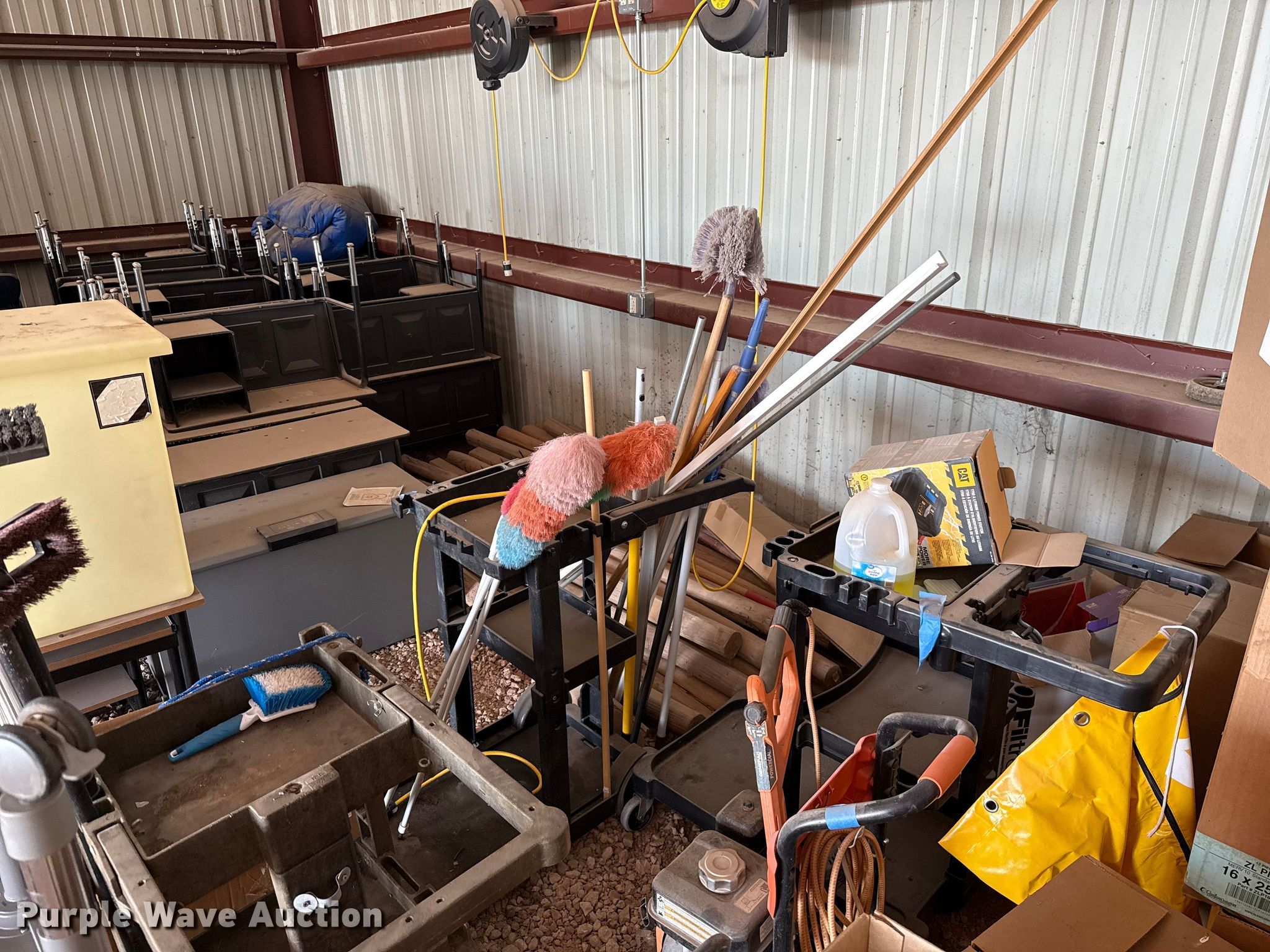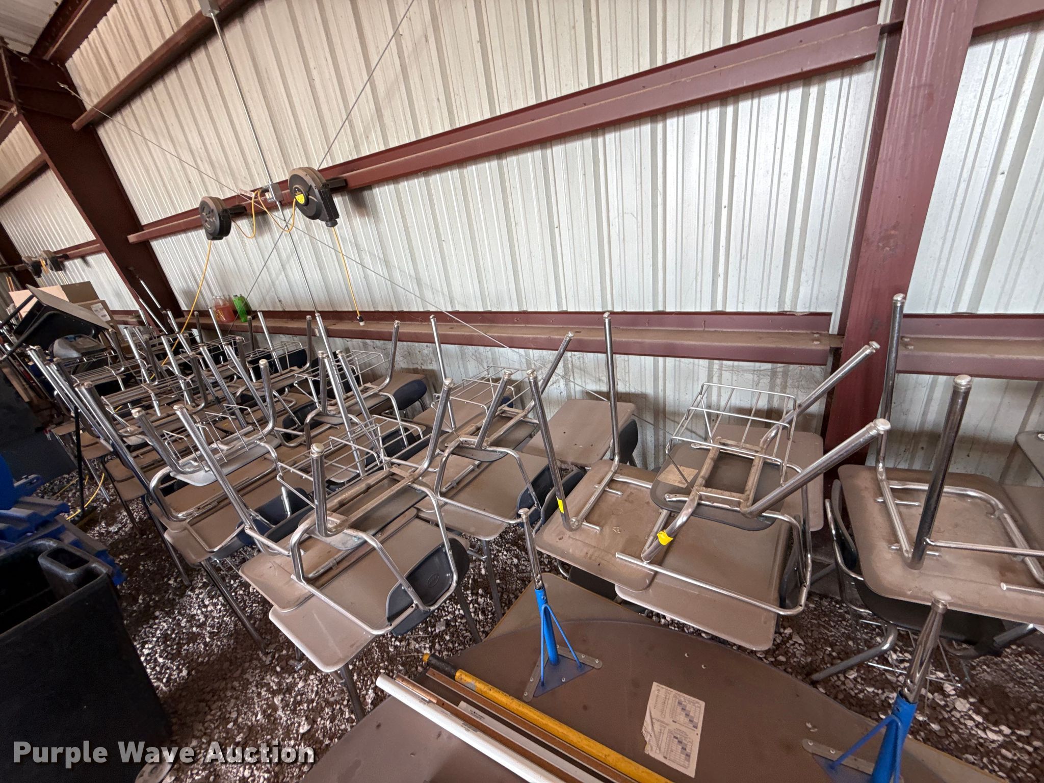 Purple Wave is selling a used Furniture in Oklahoma. This item is a Furniture with the following: Chairs: 50, Desks: 86, Filing cabinets: 1, Lockers: 9, Tables: 13, (5) trash cans, (2) dry erase boards, Cafeteria lunch bar, Janitorial supplies, Campbell Hausfeld air compressor, Unknown operating condition, Generac Speed Wash pressure washer, Unknown operating condition