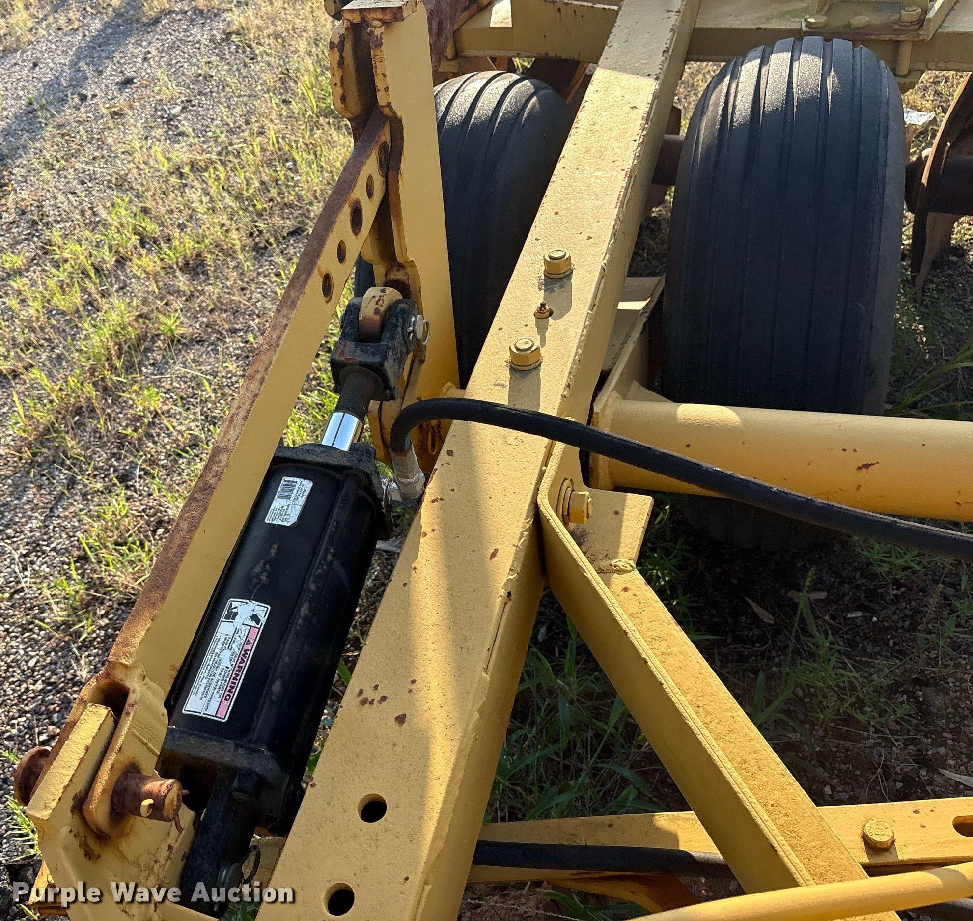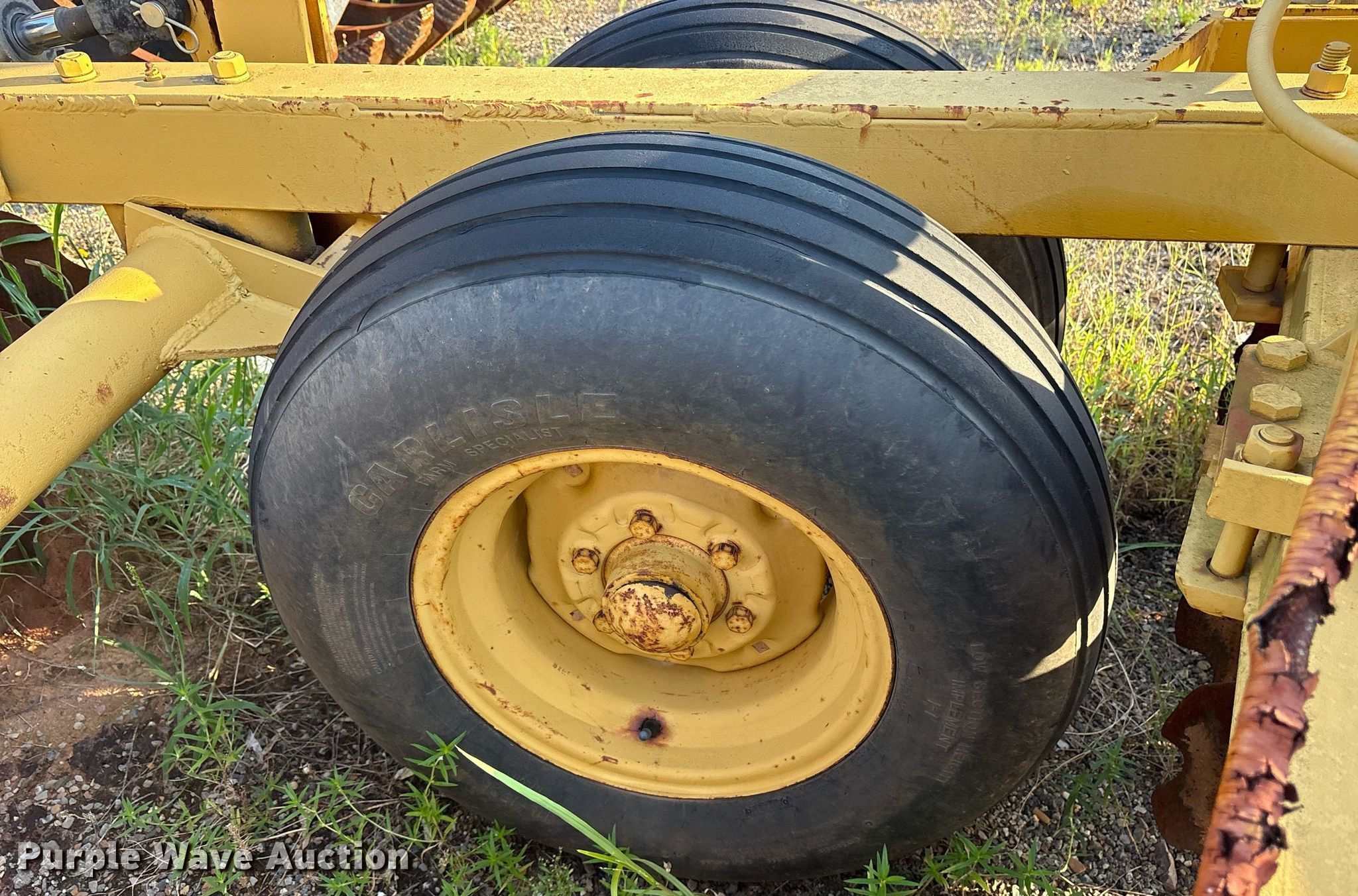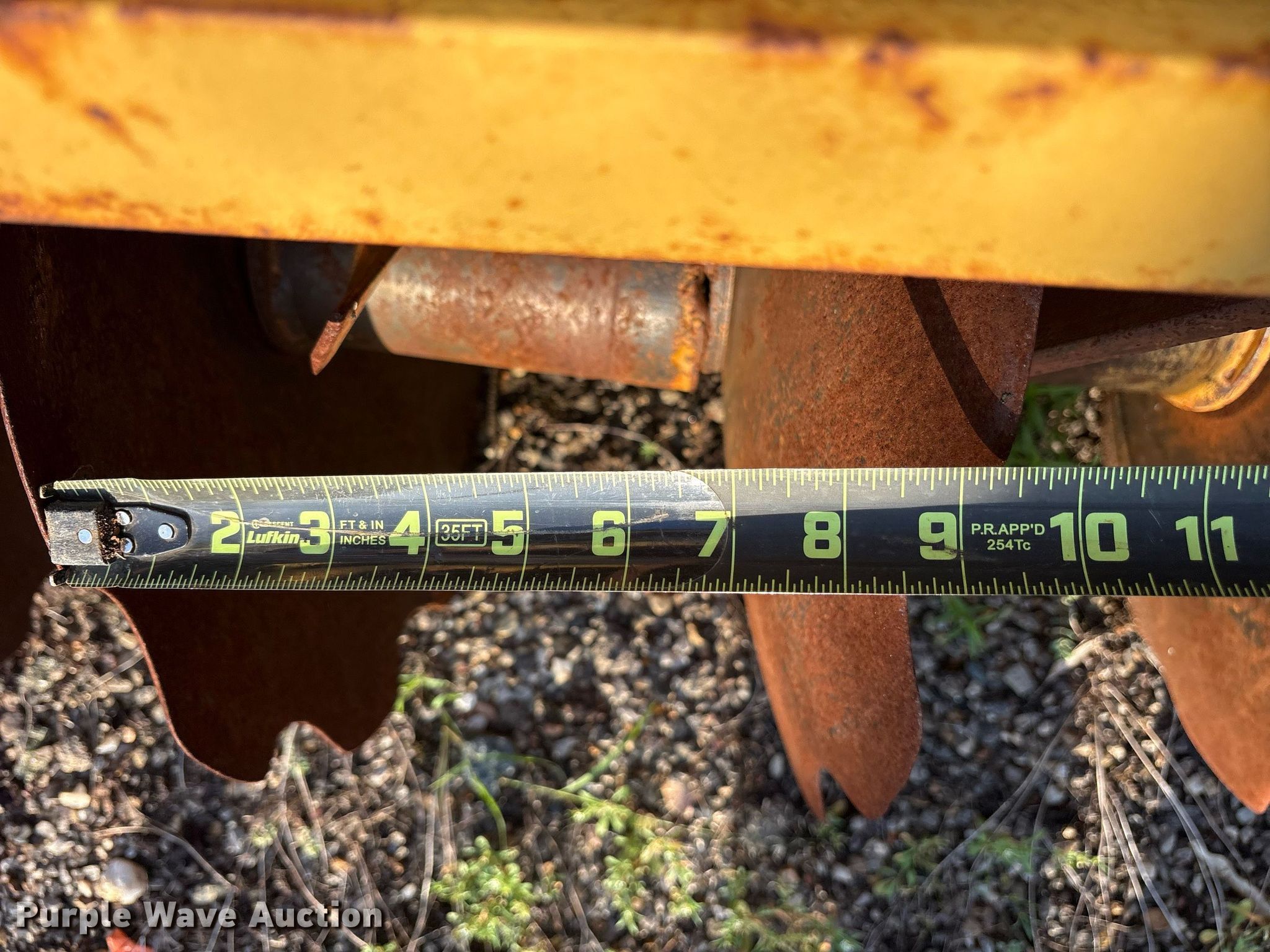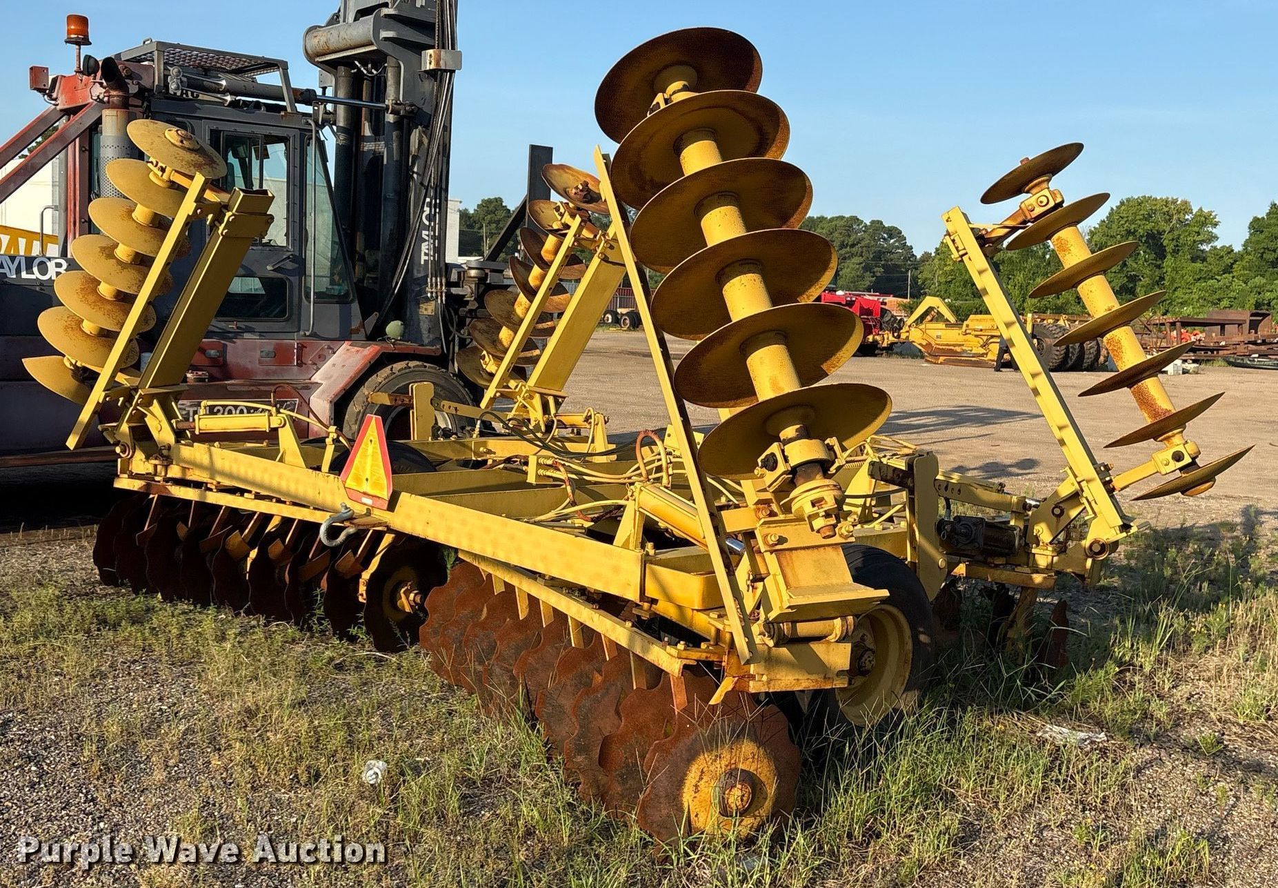 Double off-set disk. Overall width: 29'. Features Front blades Diameter: 20", Spacing: 9", Rear blades Diameter: 20", Spacing: 9", Disk scrapers, Operation Hydraulic lift, Hydraulic fold. Tires Tire size: 11L-15SL, Gauge wheels Size: 11L-15SL. Notes Unknown operating condition. Tatum Excavating Company. Texarkana, TX 75501