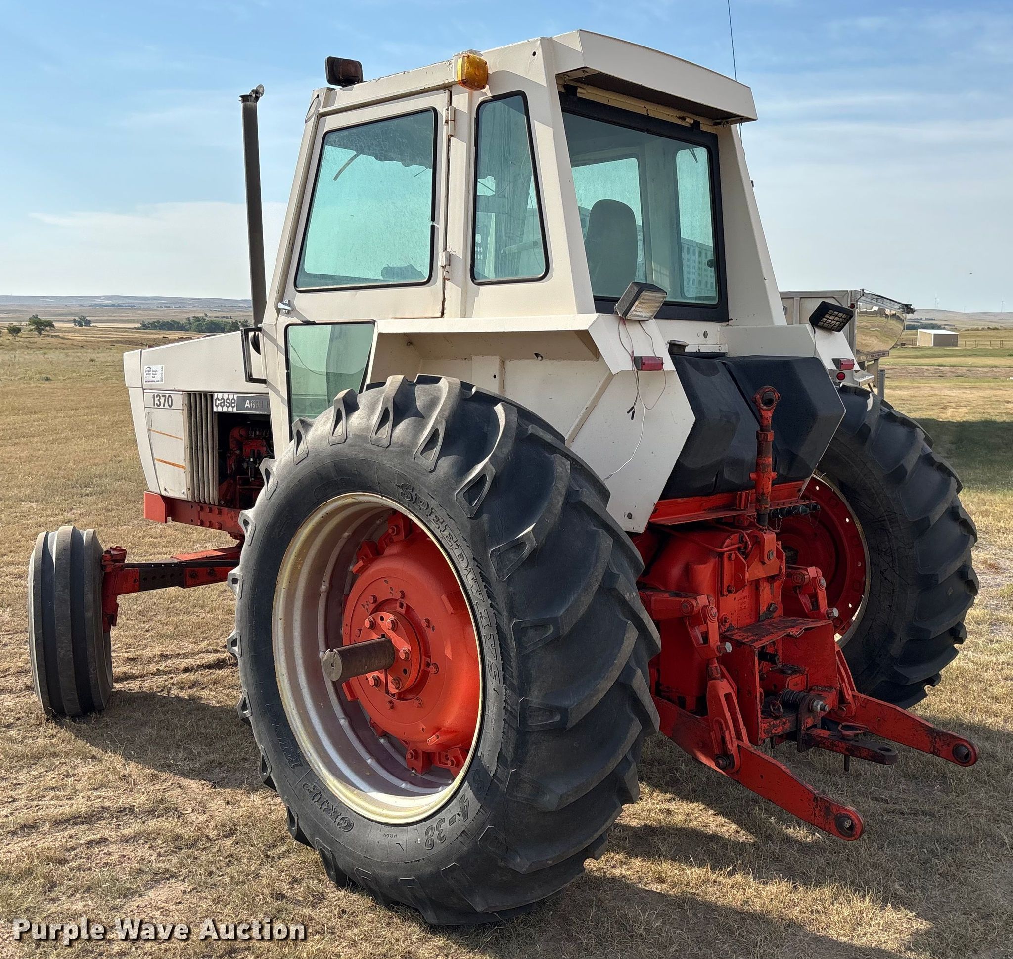 1975 Case 1370 tractor. Hours: 1,701 on meter, Serial: 8777326. Engine Case, Serial: 2576258, Cylinders: 6, Fuel type: Diesel. Transmission Powershift, 12F - 4R, Differential lock. Features PTO: 1000, Three point Top link, Rear: 2. Tires Front: 11.00-16, Rear: 18.4-38. Notes Glass cracked, Non-operational parking brake. Ramah, CO 80832