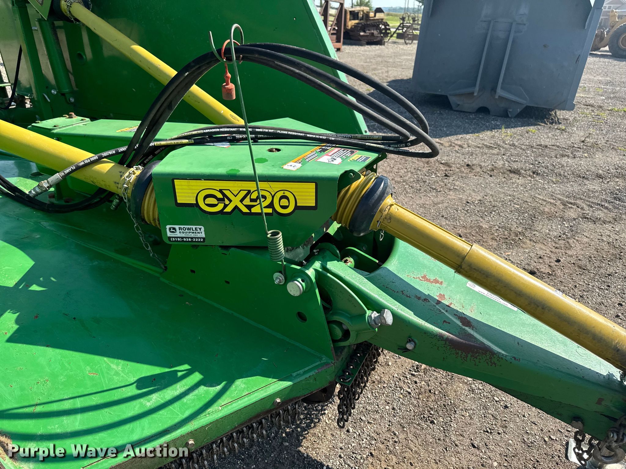 John Deere CX20 batwing rotary mower. Features. Width: 20', Hydraulic lift, Hydraulic fold, PTO: 1000. Tires Size: 26x9-14.5. Boomerang Corp. Anamosa, IA 52205