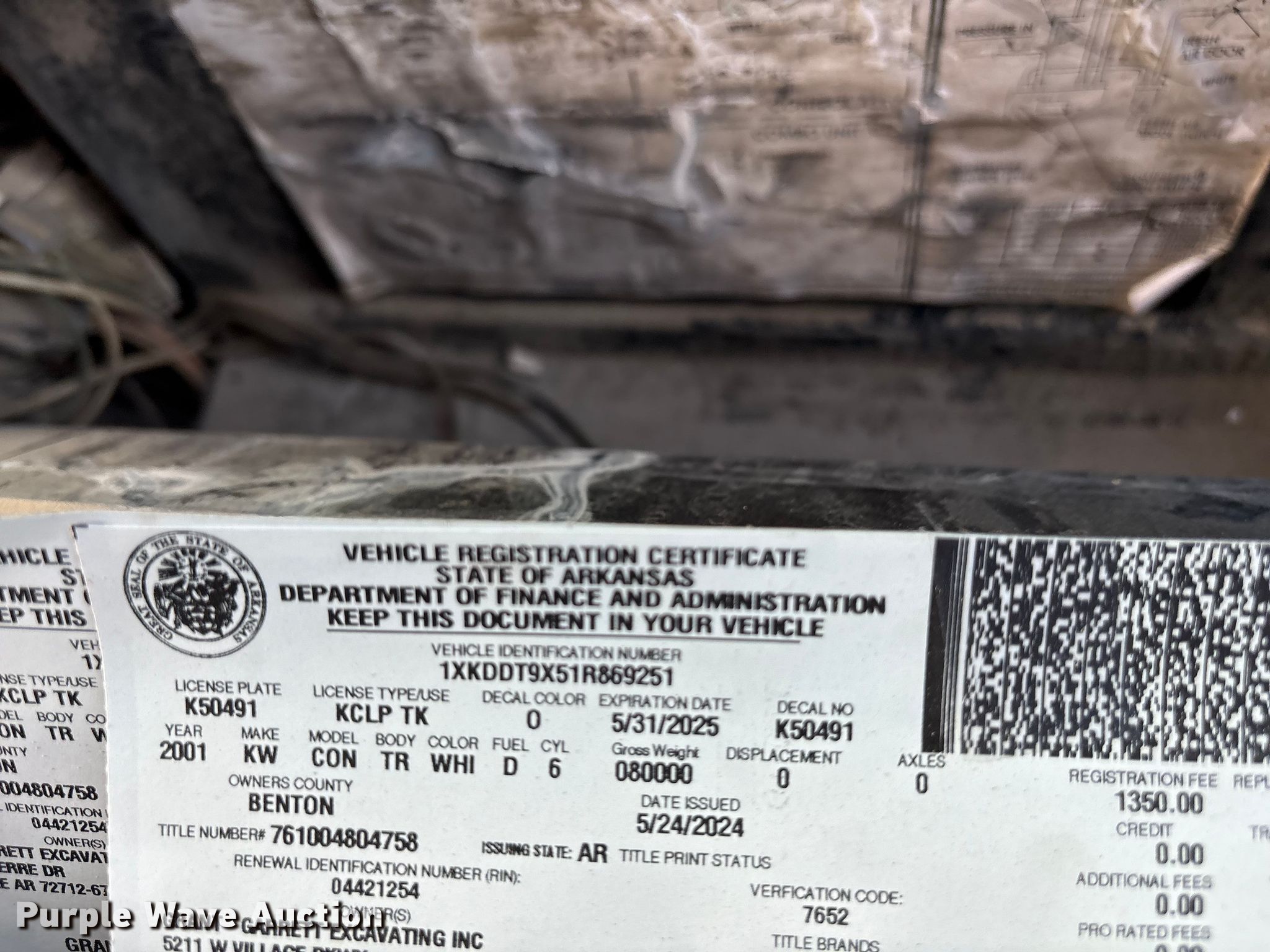 Purple Wave is selling a used Truck Tractor in Arkansas. This item is a 2001 Kenworth T800 semi truck with the following: Miles: 148,282 on odometer, Miles: Actual unknown, Hours: 24,327 on meter, VIN: 1XKDDT9X51R869251